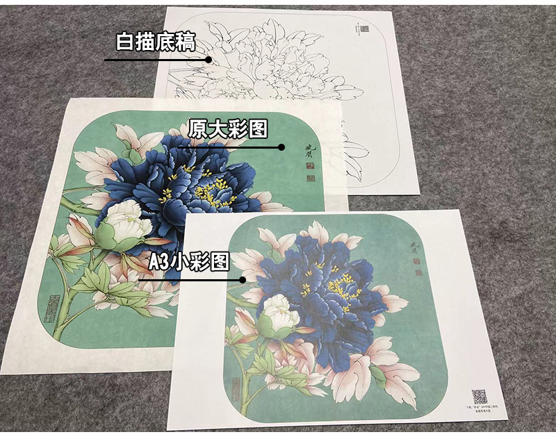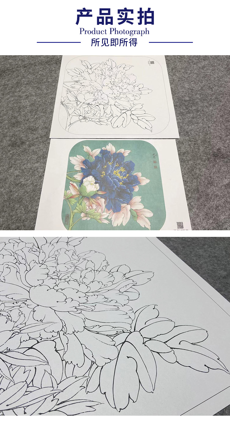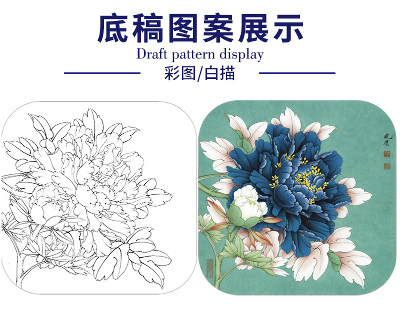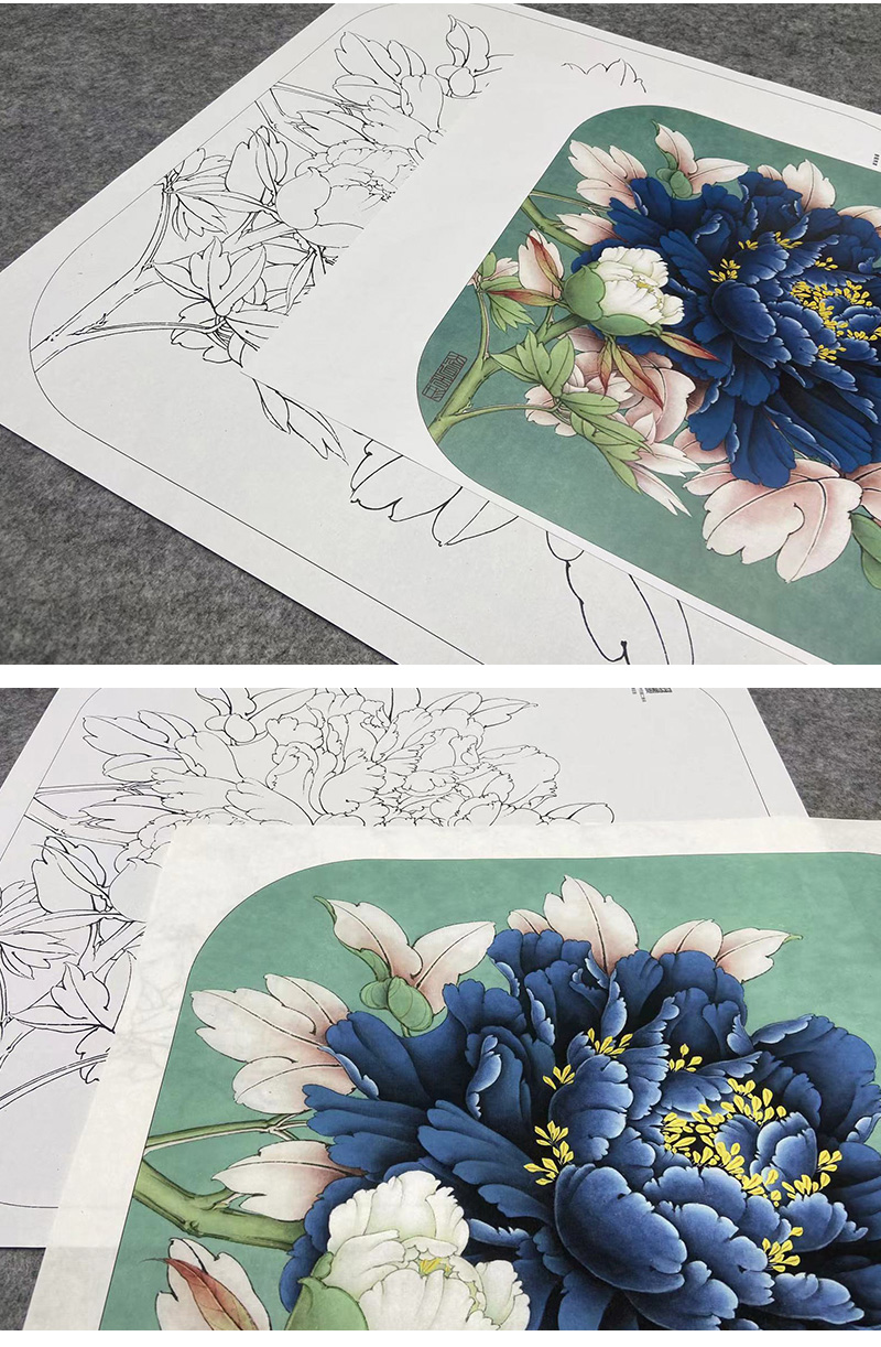 【大彩图】工笔画白描底稿小品《青龙卧墨池》牡丹临摹勾线花鸟线稿K012