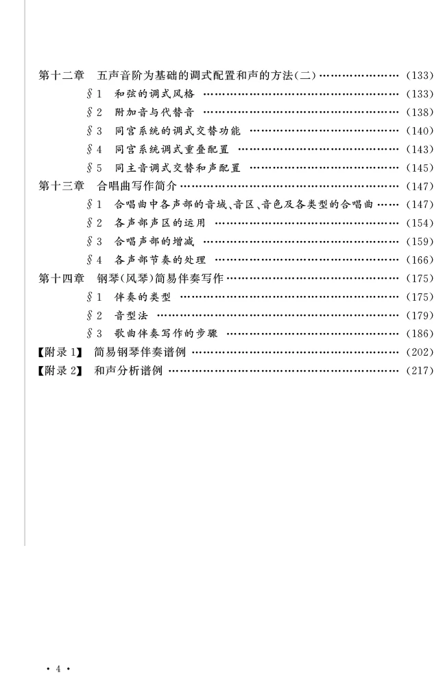 本教材自推出以来一直是我社的畅销教材之一,此次再版除完善了部分内容表述,还提供了教学课件和部分谱例的音频。篇章设置仍然与上一版大体相同,大致可以分为四个层次,第一部分从绪论到第四章“正三和弦的转位”,主要是最基础的和声理论,介绍基本的正三和弦构成方法和连接方法;第二部分从第五章“和弦外音”到第八章“守调模进”,介绍同一调性内进阶的和弦材料和连接方式;第三部分为第九章“副属和弦与离调”和第十章“转调、近关系转调”,讲述了离调和转调的相关处理方法,作为一本适合和声副科学生的基础性教材,程度到此较为适宜;第四部分可称“应用篇”,从第十一章到第十四章,介绍了民族风格音乐中的和声处理方法,合唱曲写作以及键盘类乐器伴奏写作的基础知识,有助于学生将理论知识应用到音乐实践中,极具实用性。