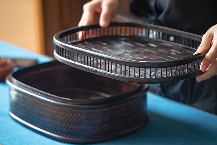将竹篾编织成器之后,再施以厚薄适度的大漆,