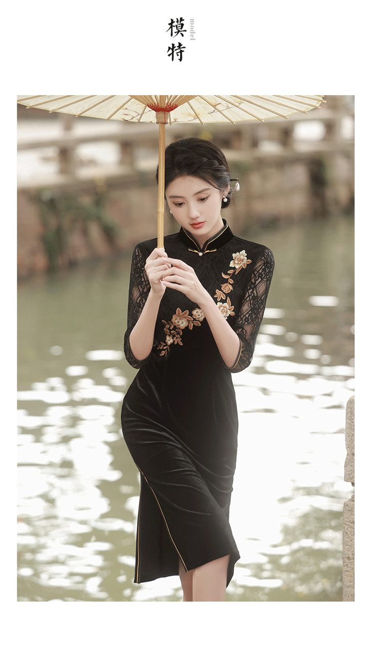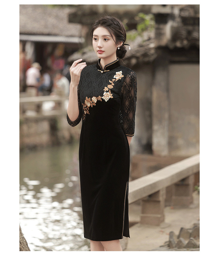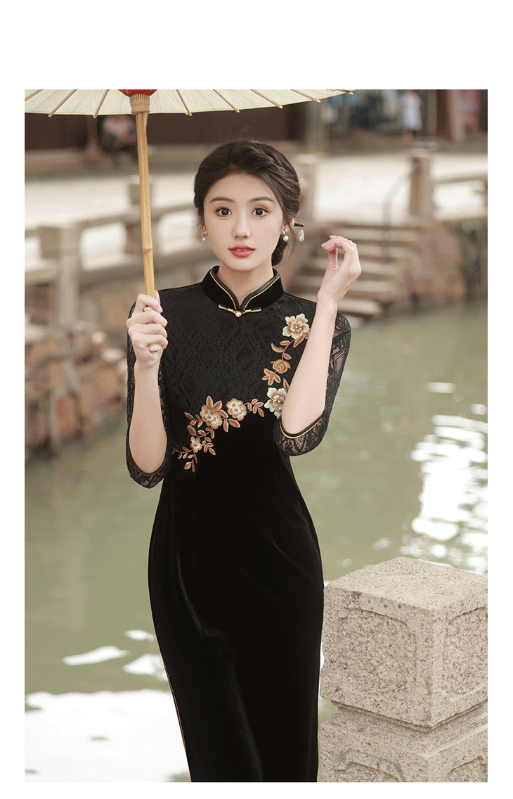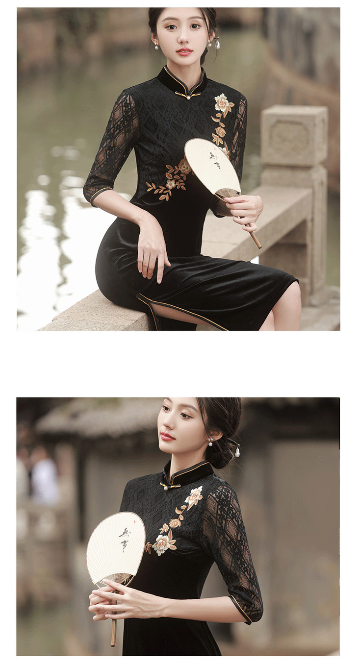 新款金丝绒七分袖中长款蕾丝改良刺绣旗袍GR5087
