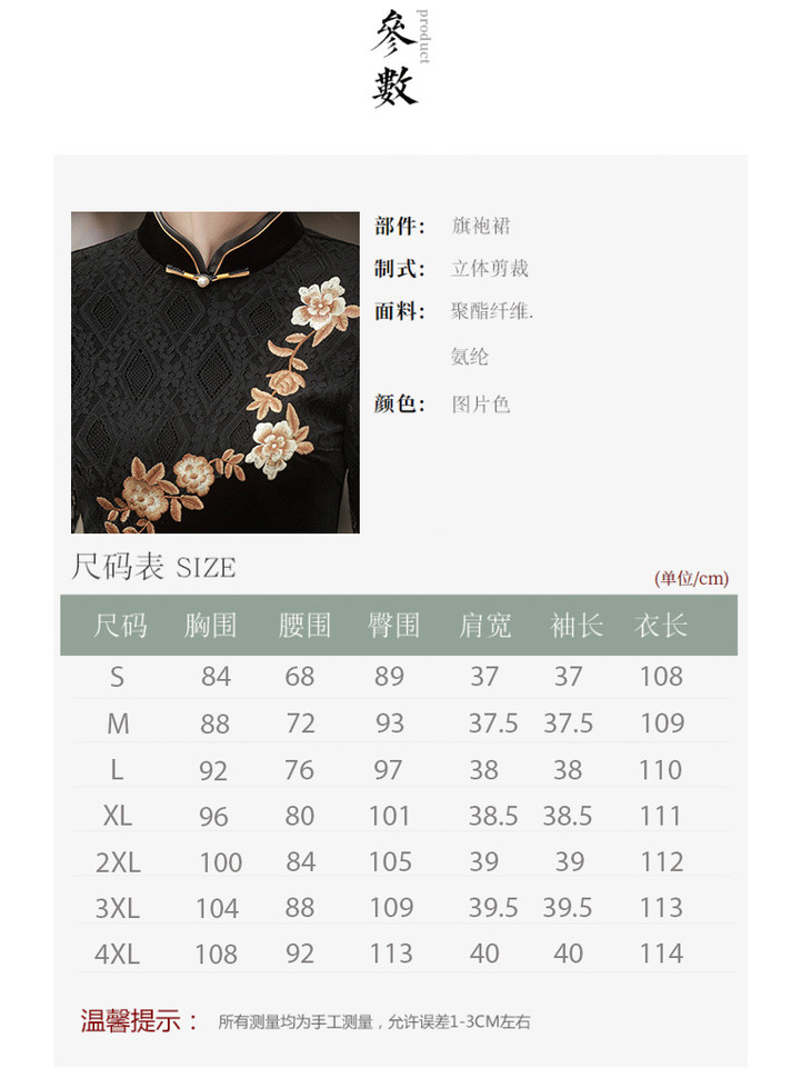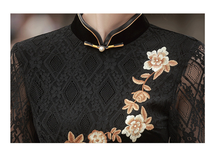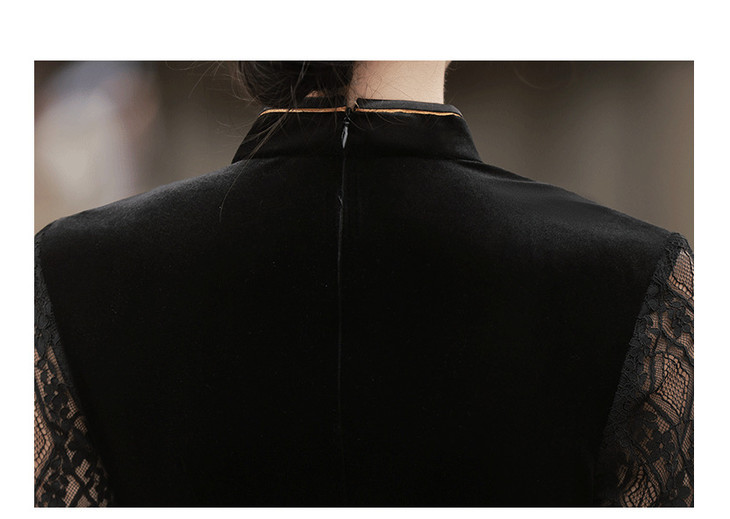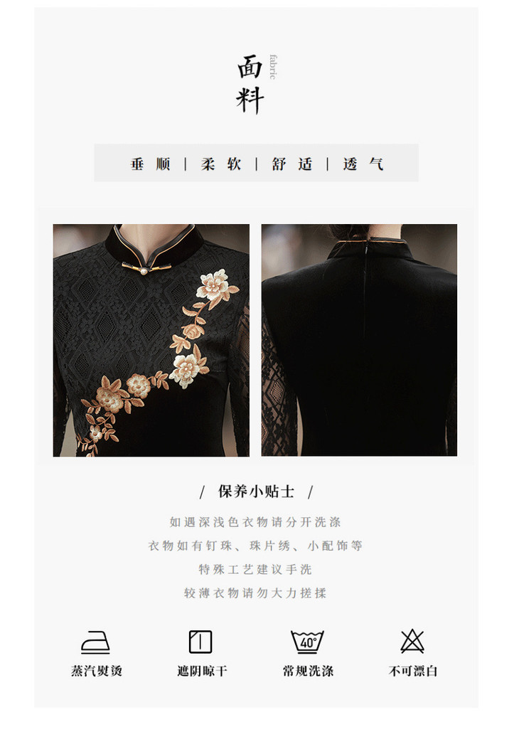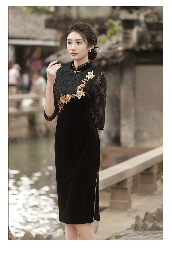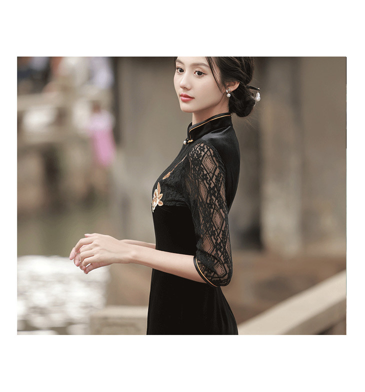 新款金丝绒七分袖中长款蕾丝改良刺绣旗袍GR5087