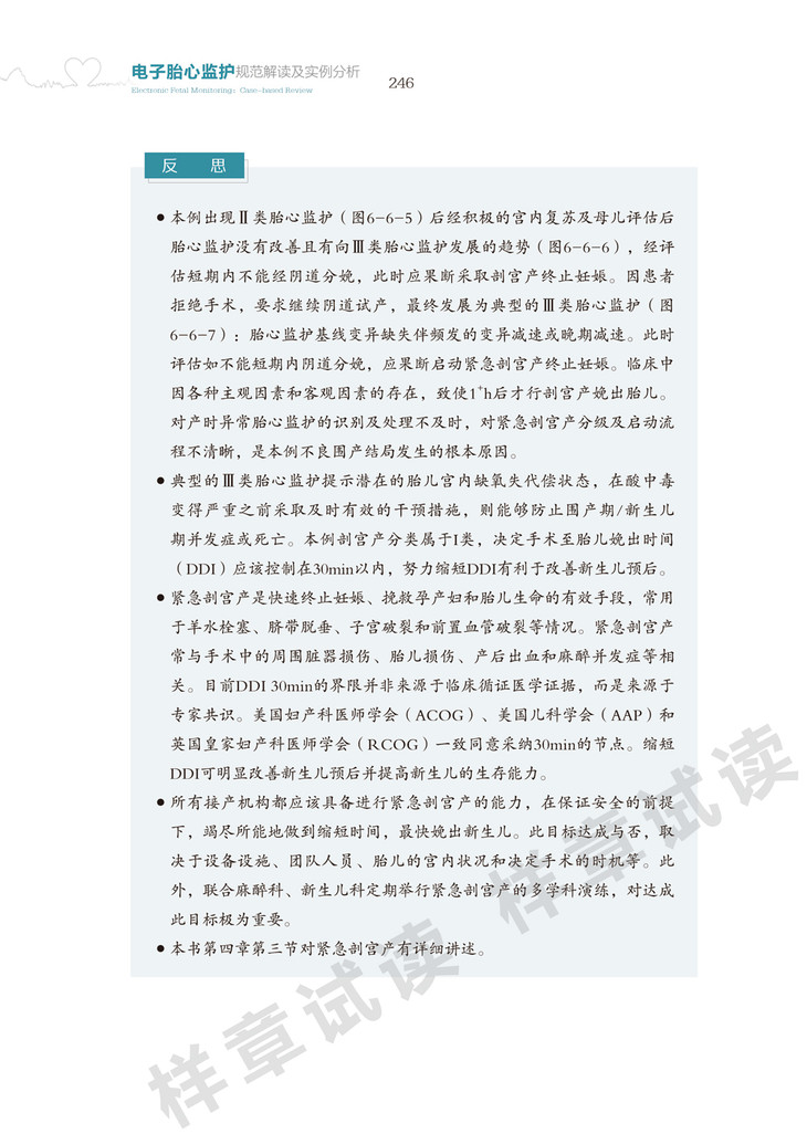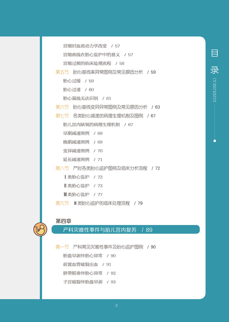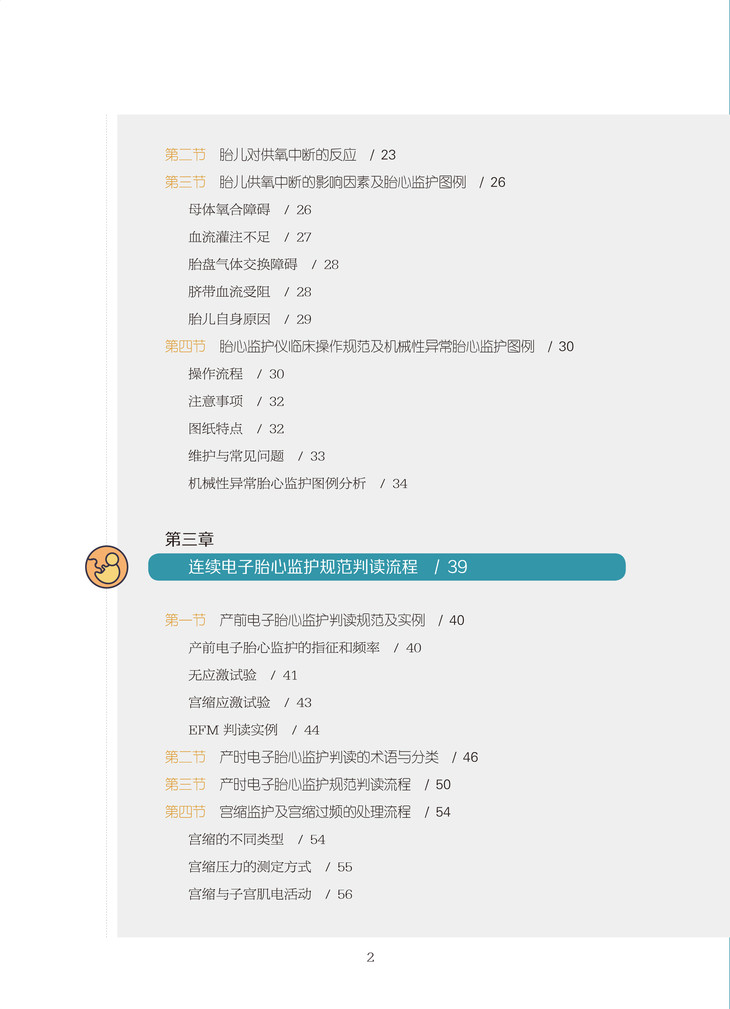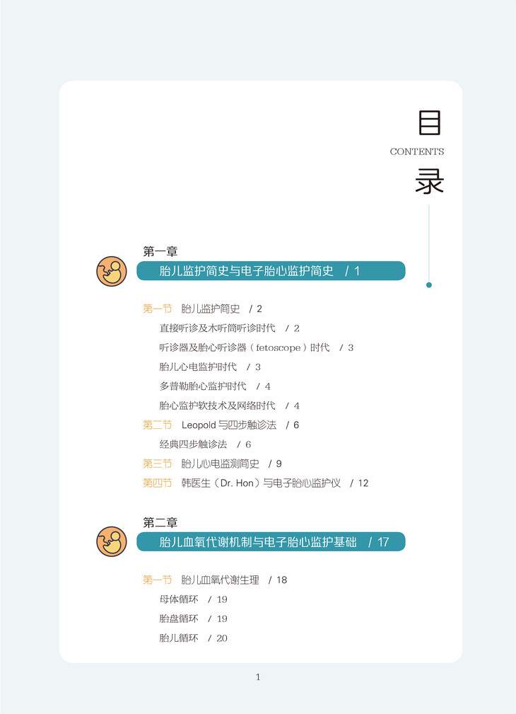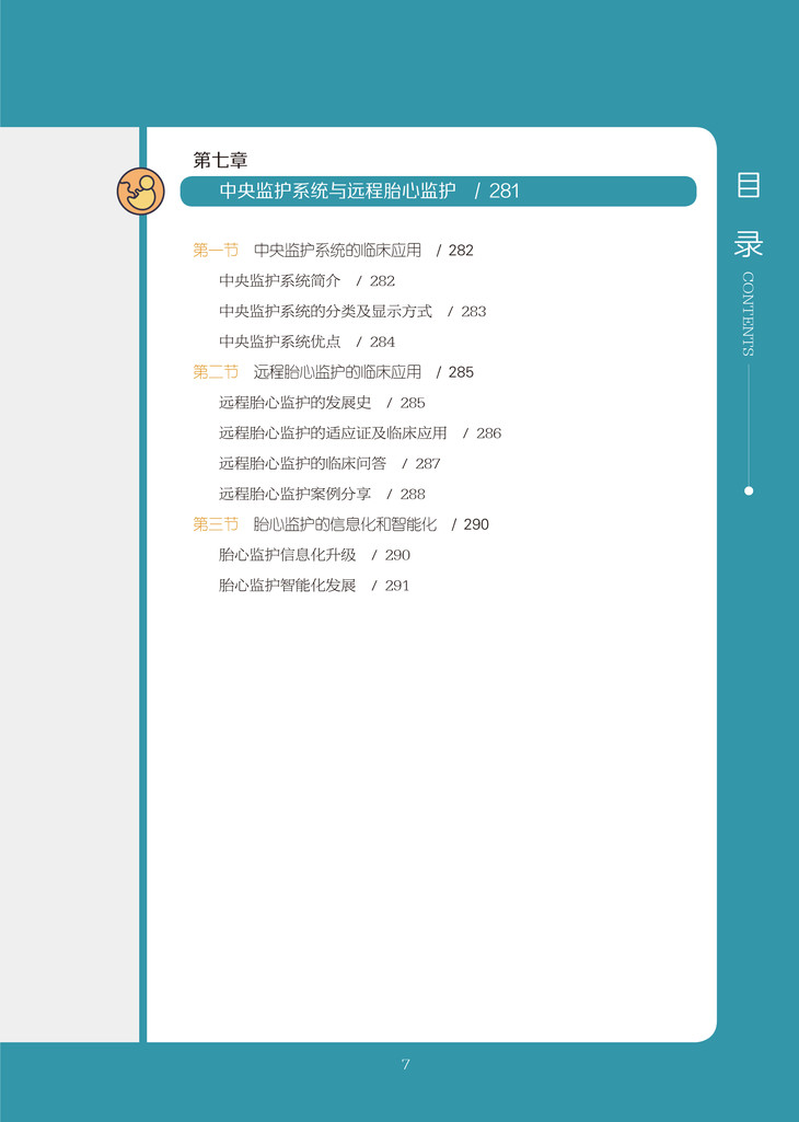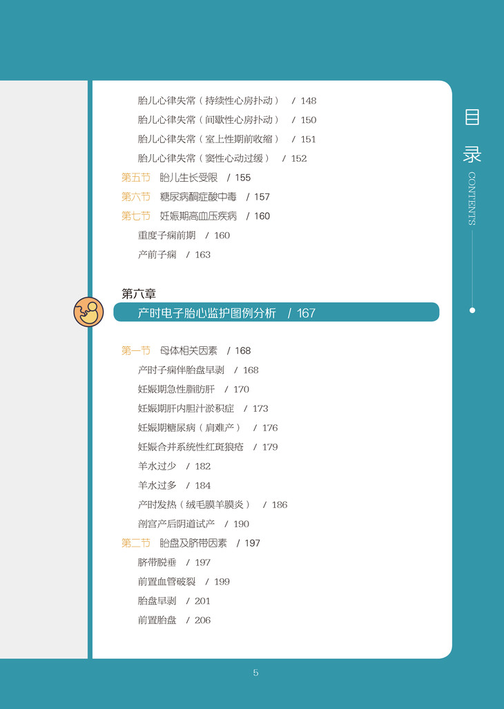 全书共分七章,第一章介绍了胎儿监护简史与电子胎心监护简史,此后两章详细阐述了胎儿血氧代谢生理及电子胎心监护基础、连续电子胎心监护规范判读流程。第四章着眼于产科灾难性事件的应对措施,体现了宫内复苏的重要意义;第五章以经典病例为引,展现了产科常见疾病及危急重症的典型或不典型胎监图例,详细阐示其判读要点及处理流程;第六章回归母体、胎儿及胎盘脐带三要素,选取临床典型案例,在产程中对胎监变化进行追踪式分析,并且还原了对不良妊娠结局病例、医源性干预病例进行动态分析的全过程。值得指出的是第五章、第六章中笔者结合不同病例,利用“知识点回顾”和“反思”的模式进行知识点梳理,并结合最新国际诊疗指南分析,巩固知识点。第七章介绍了中央监护系统与远程胎监的应用。