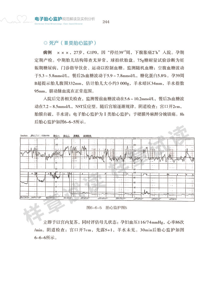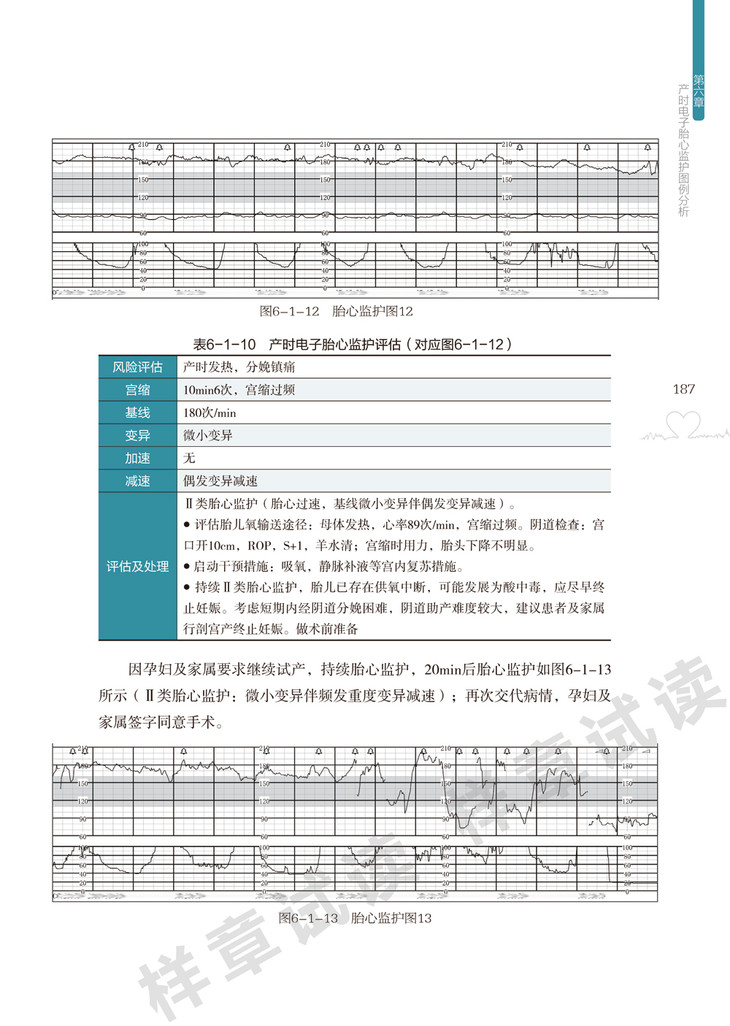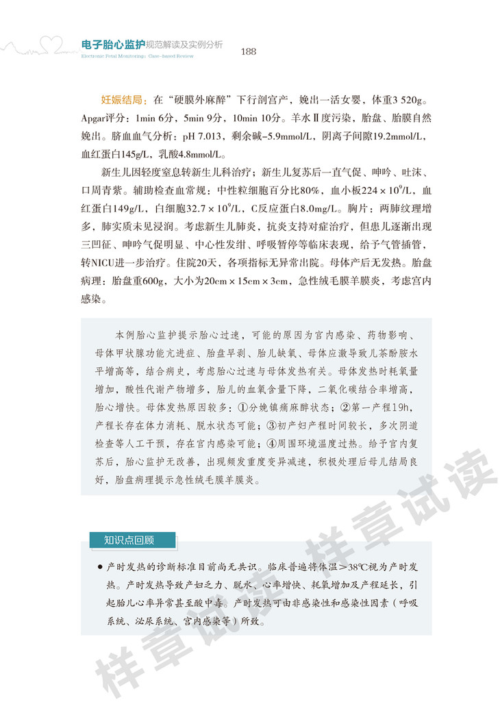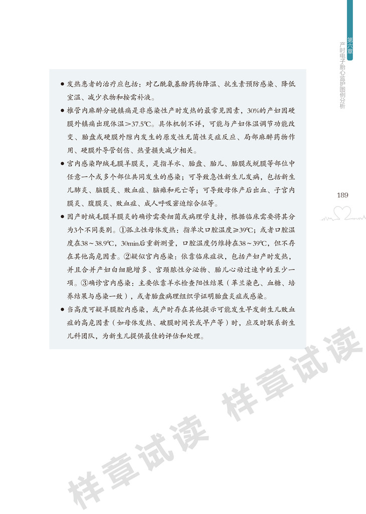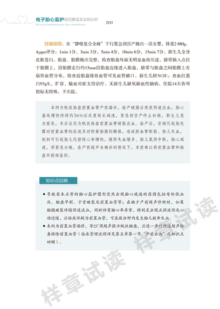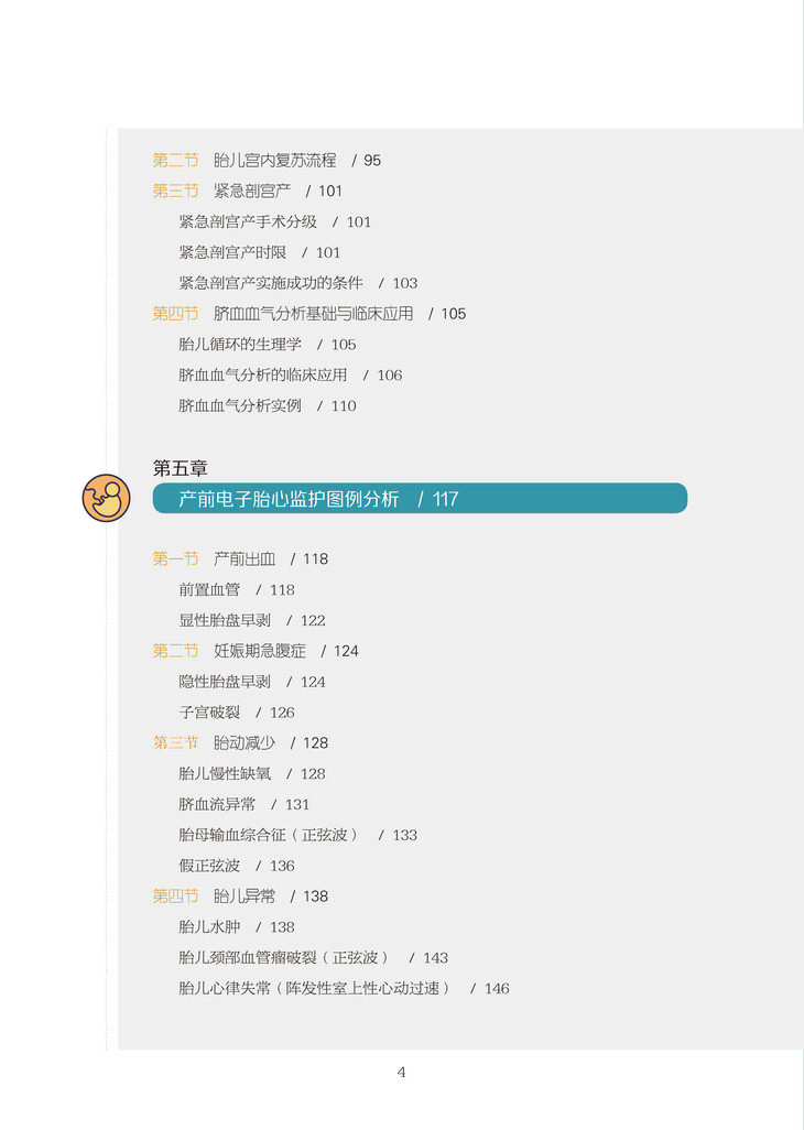全书共分七章,第一章介绍了胎儿监护简史与电子胎心监护简史,此后两章详细阐述了胎儿血氧代谢生理及电子胎心监护基础、连续电子胎心监护规范判读流程。第四章着眼于产科灾难性事件的应对措施,体现了宫内复苏的重要意义;第五章以经典病例为引,展现了产科常见疾病及危急重症的典型或不典型胎监图例,详细阐示其判读要点及处理流程;第六章回归母体、胎儿及胎盘脐带三要素,选取临床典型案例,在产程中对胎监变化进行追踪式分析,并且还原了对不良妊娠结局病例、医源性干预病例进行动态分析的全过程。值得指出的是第五章、第六章中笔者结合不同病例,利用“知识点回顾”和“反思”的模式进行知识点梳理,并结合最新国际诊疗指南分析,巩固知识点。第七章介绍了中央监护系统与远程胎监的应用。