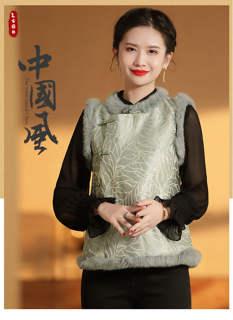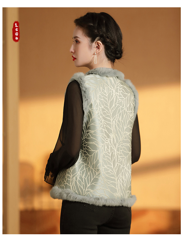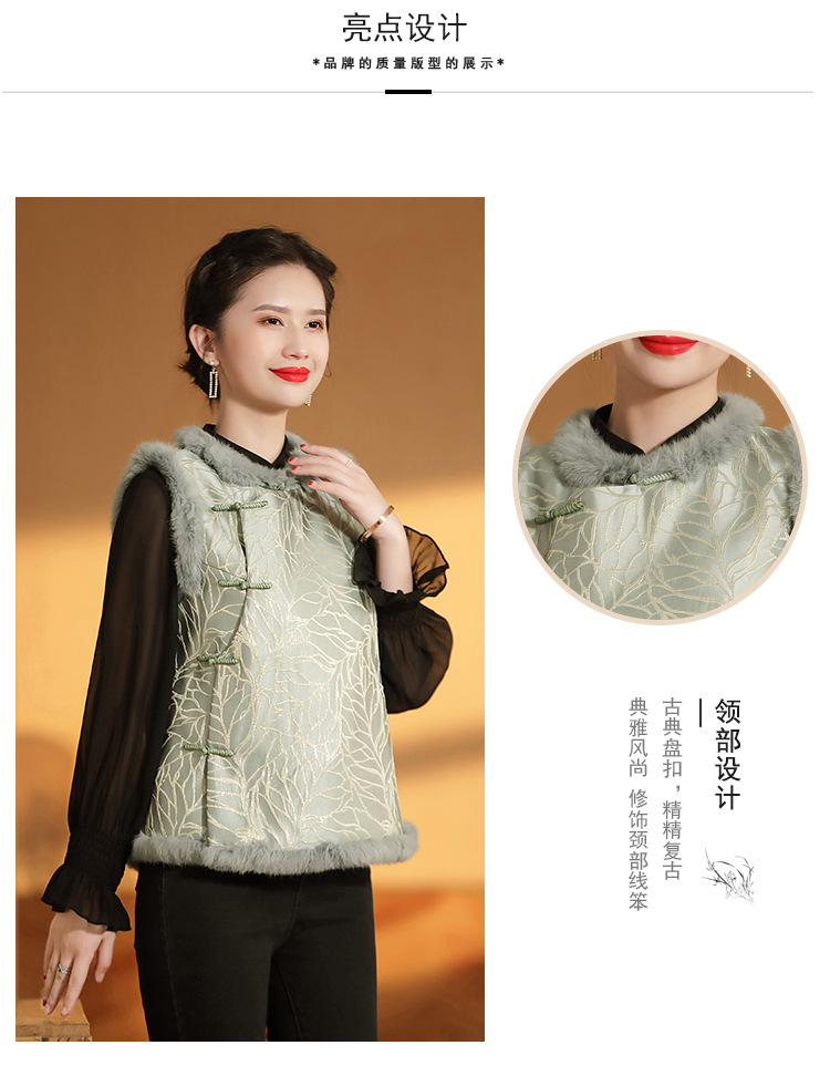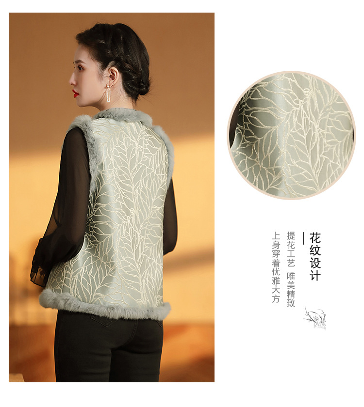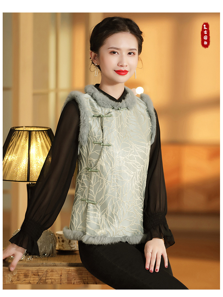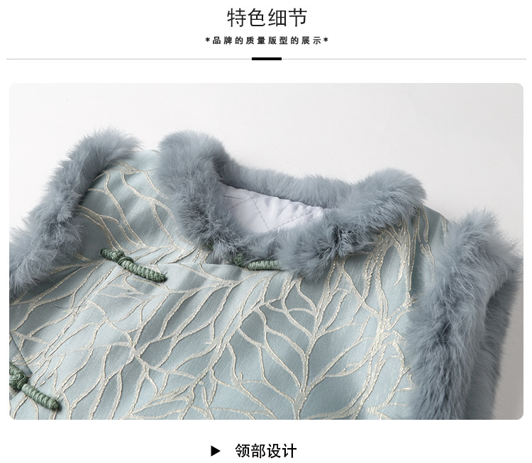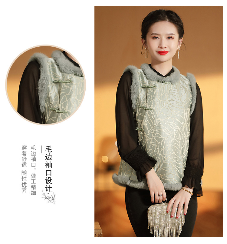 AYK-QF-200805提花粉兰叶骨夹棉无袖马甲女拼接毛边立领唐装上衣冬国潮女装