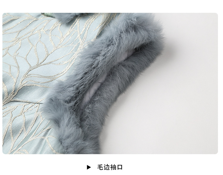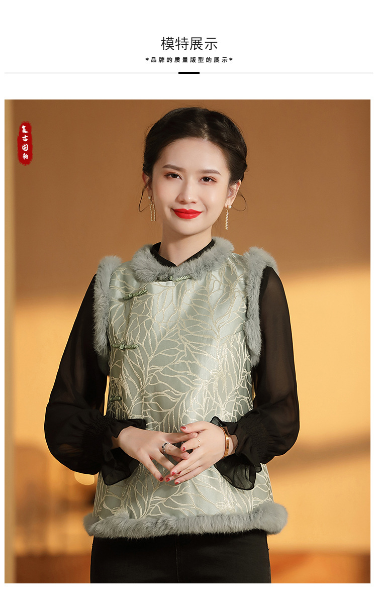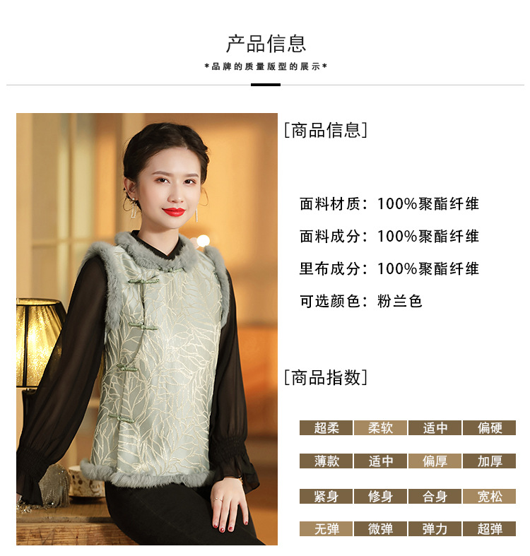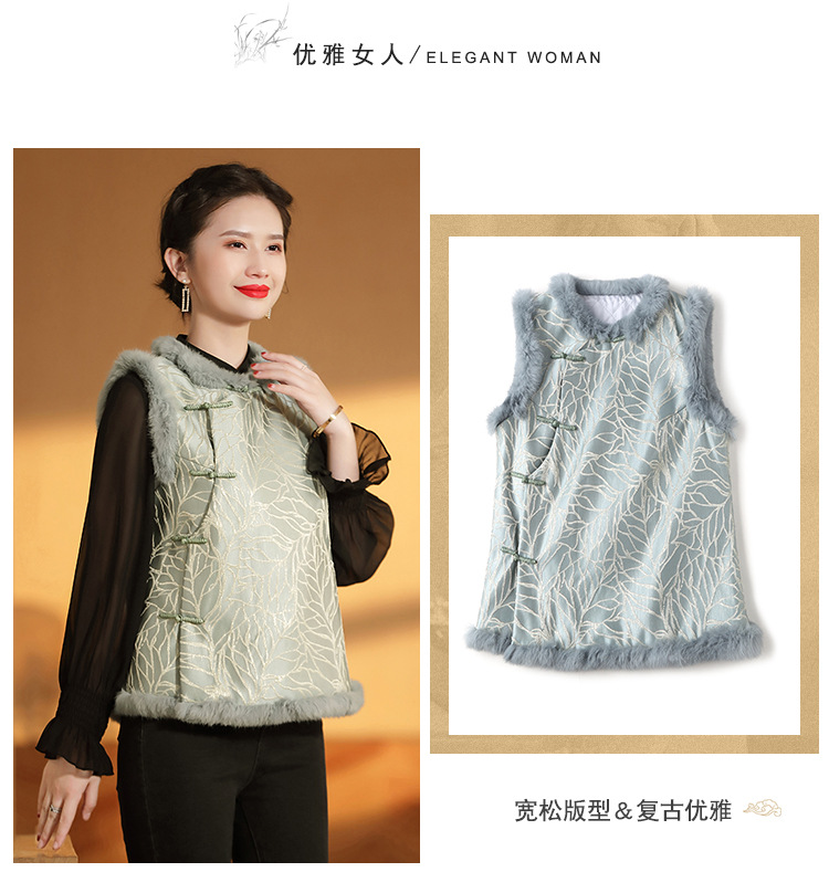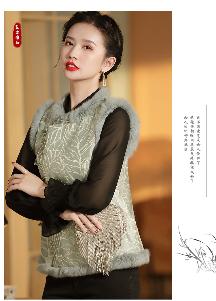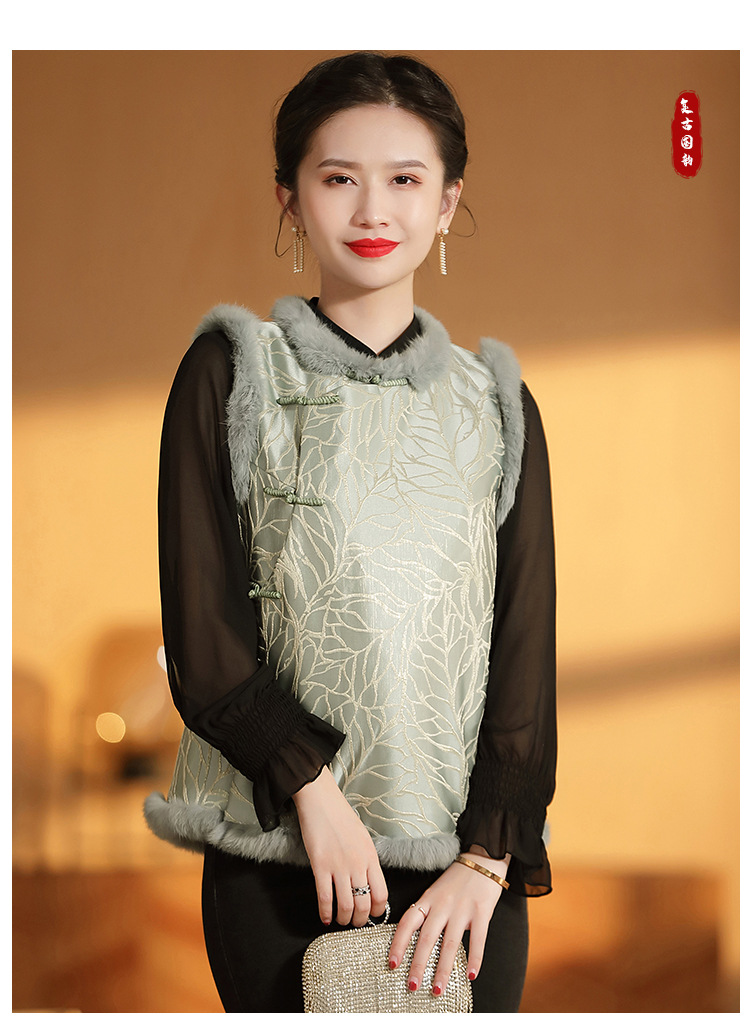 AYK-QF-200805提花粉兰叶骨夹棉无袖马甲女拼接毛边立领唐装上衣冬国潮女装