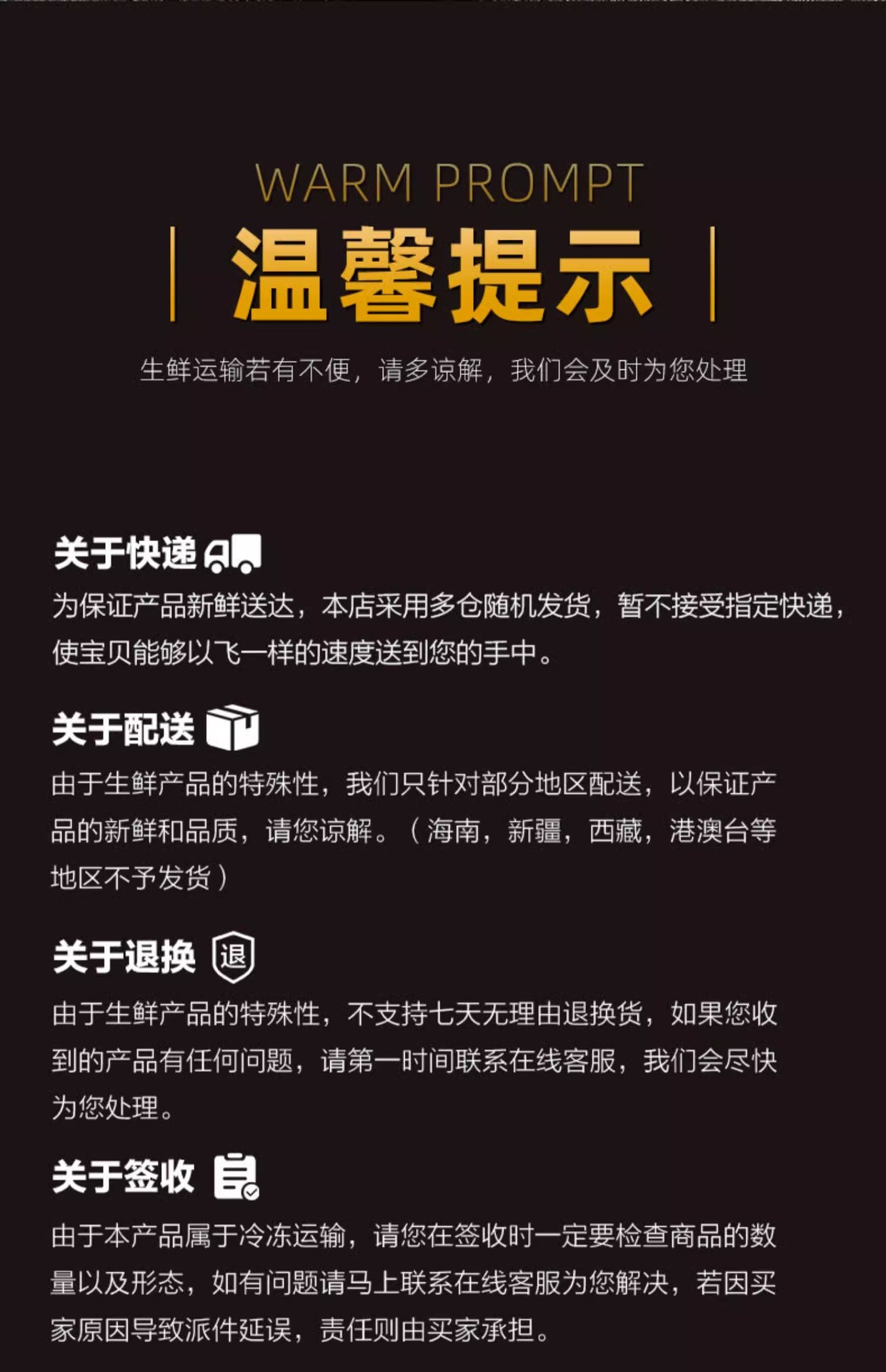 【关于售后】因产品的特殊性(生鲜冻品类),不支持七天无理由退货,收到后如有少货,破损等情况,请签收后24小时内联系客服处理!