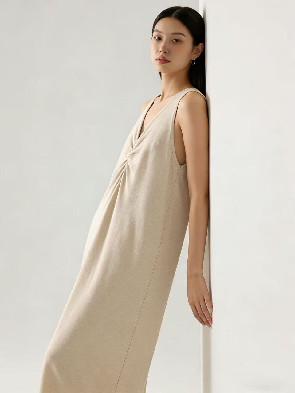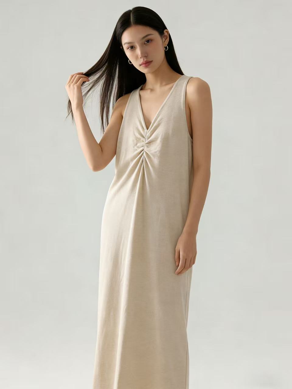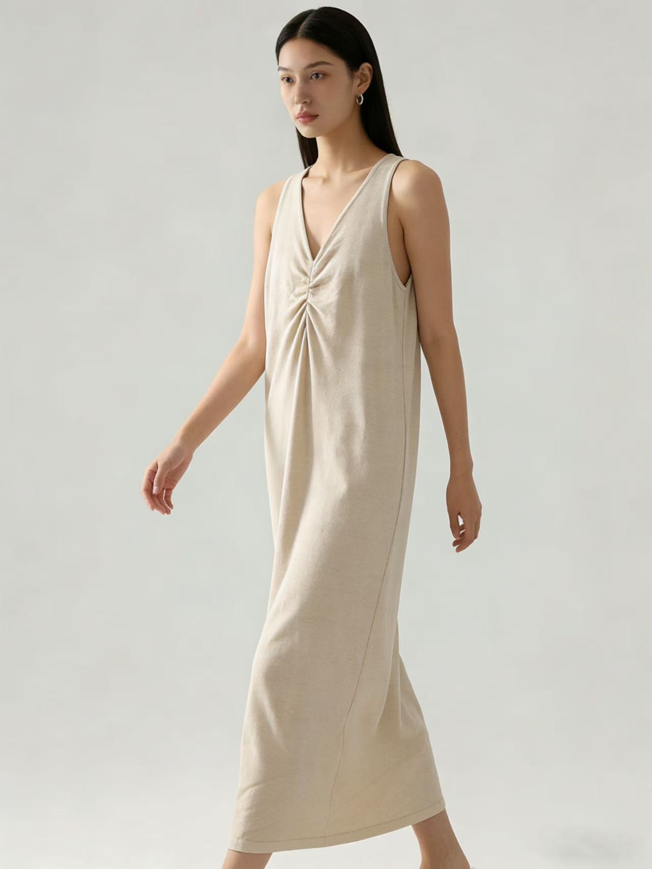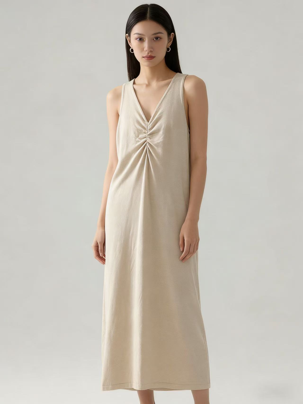 418良粉节|2026 活动爆款【自营】衣周期~(超软糯)020 V领褶皱设计感针织长款背心连衣裙-喜出