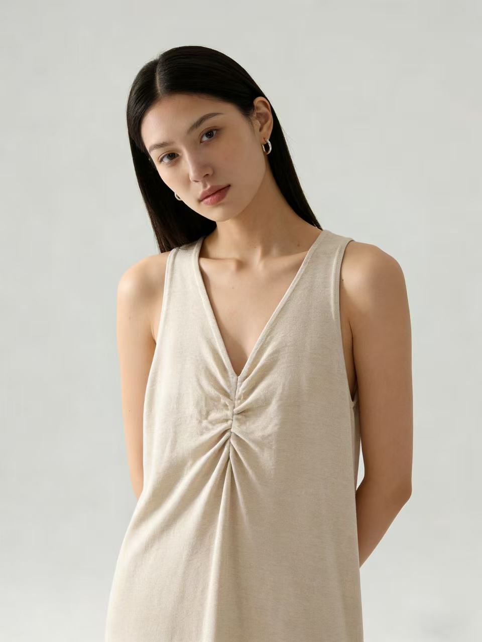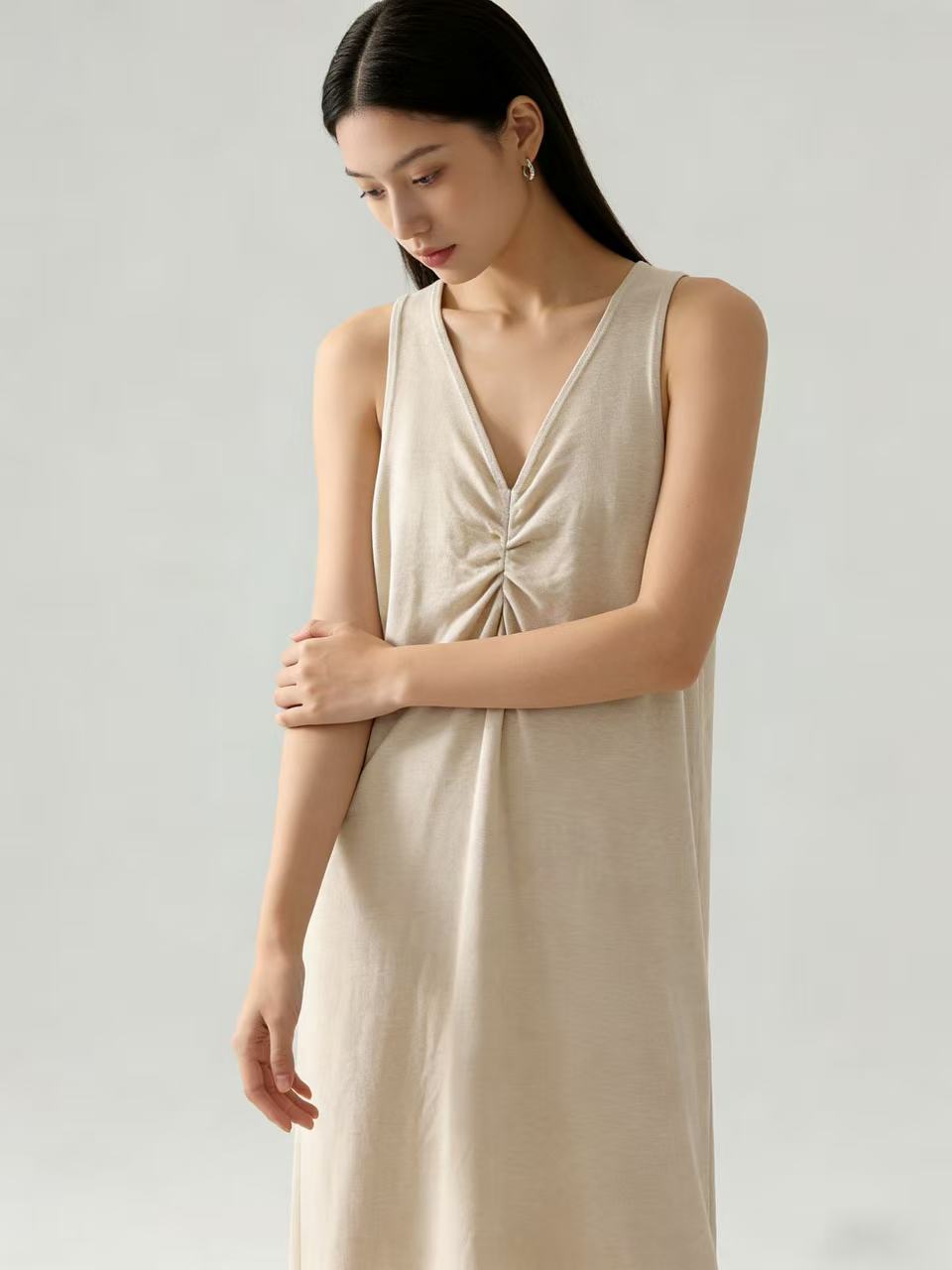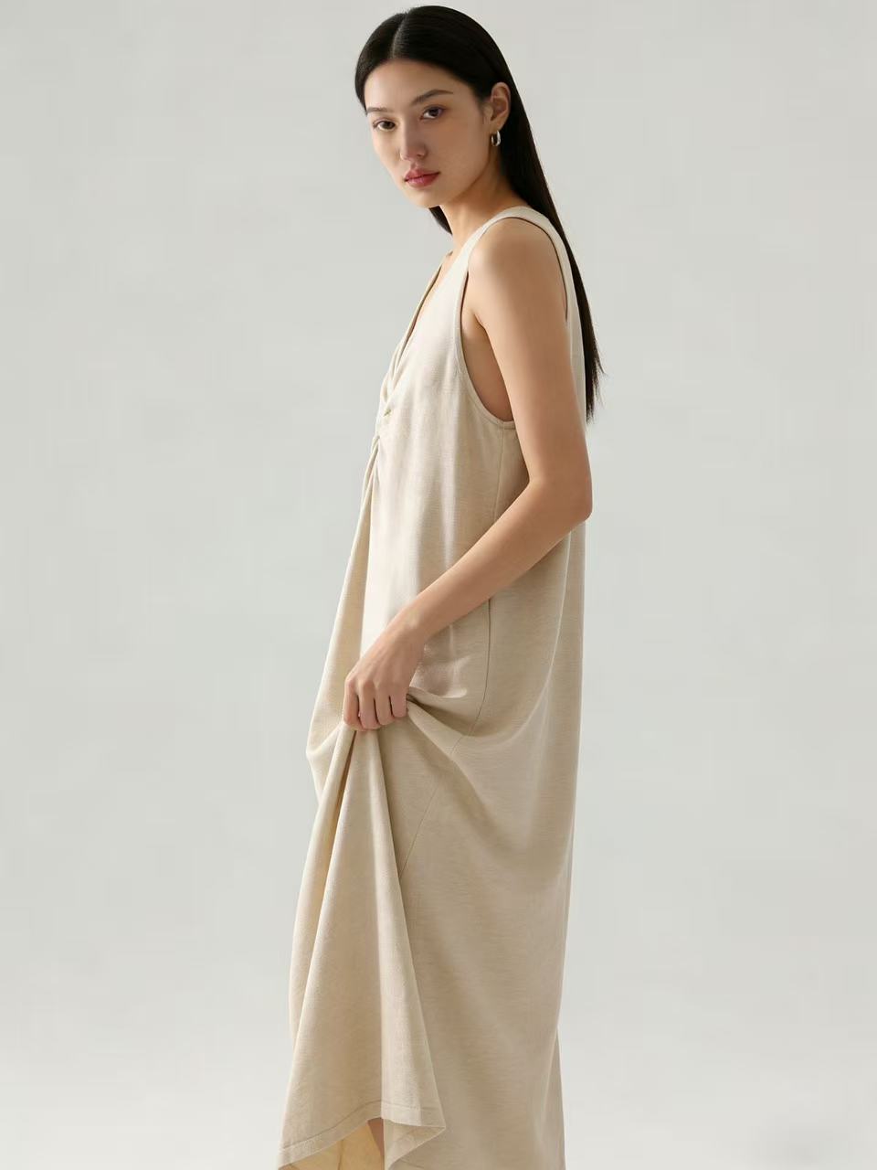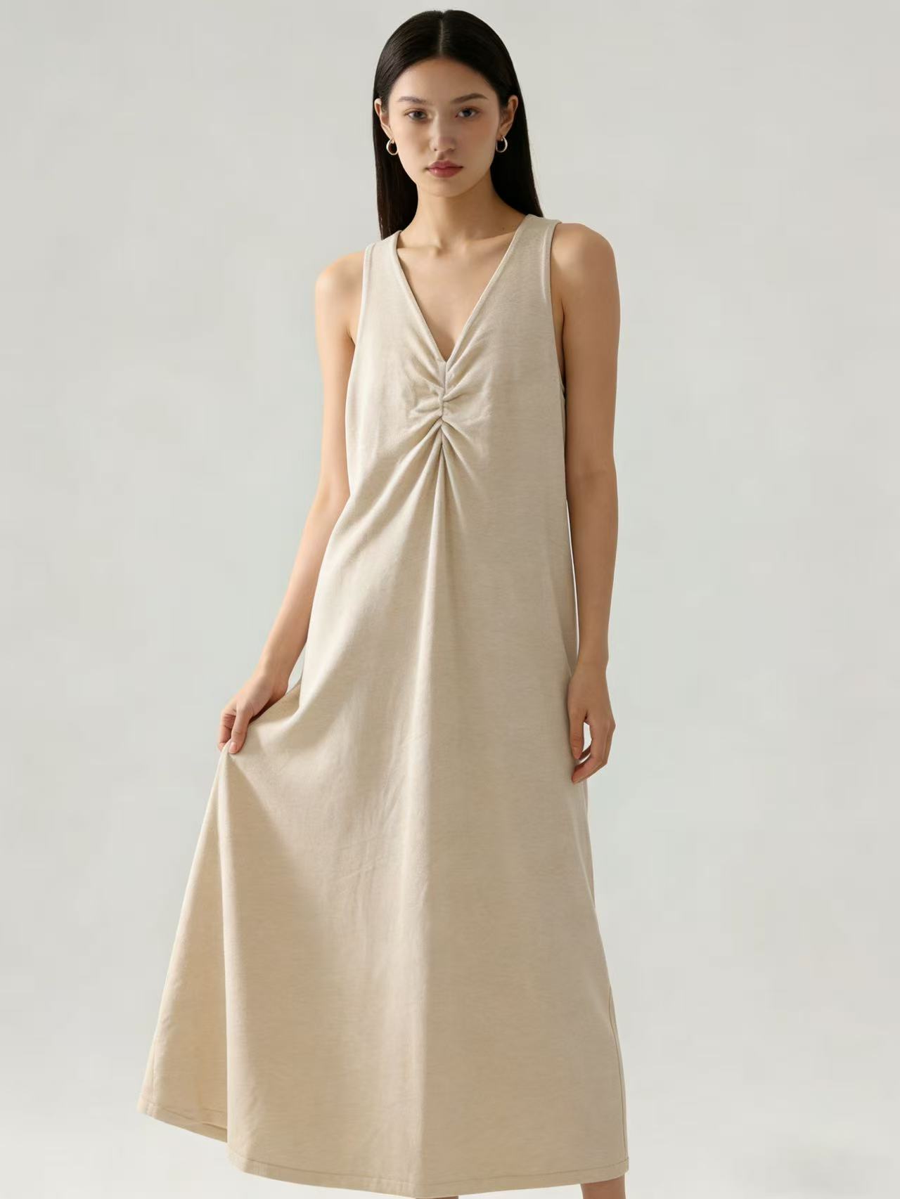 418良粉节|2026 活动爆款【自营】衣周期~(超软糯)020 V领褶皱设计感针织长款背心连衣裙-喜出