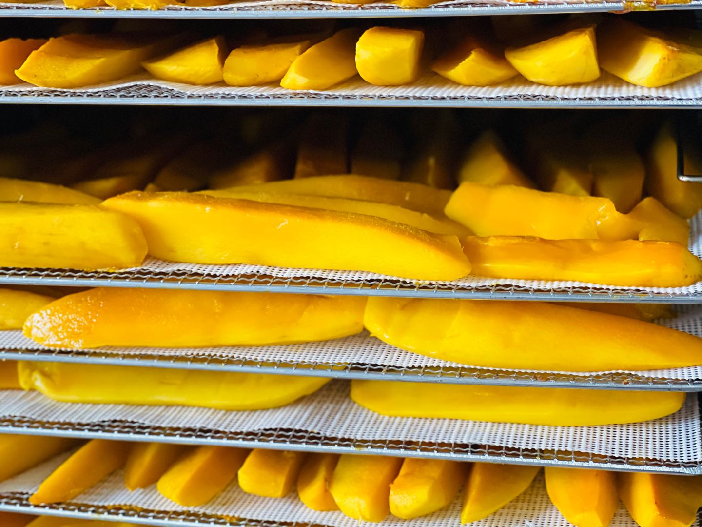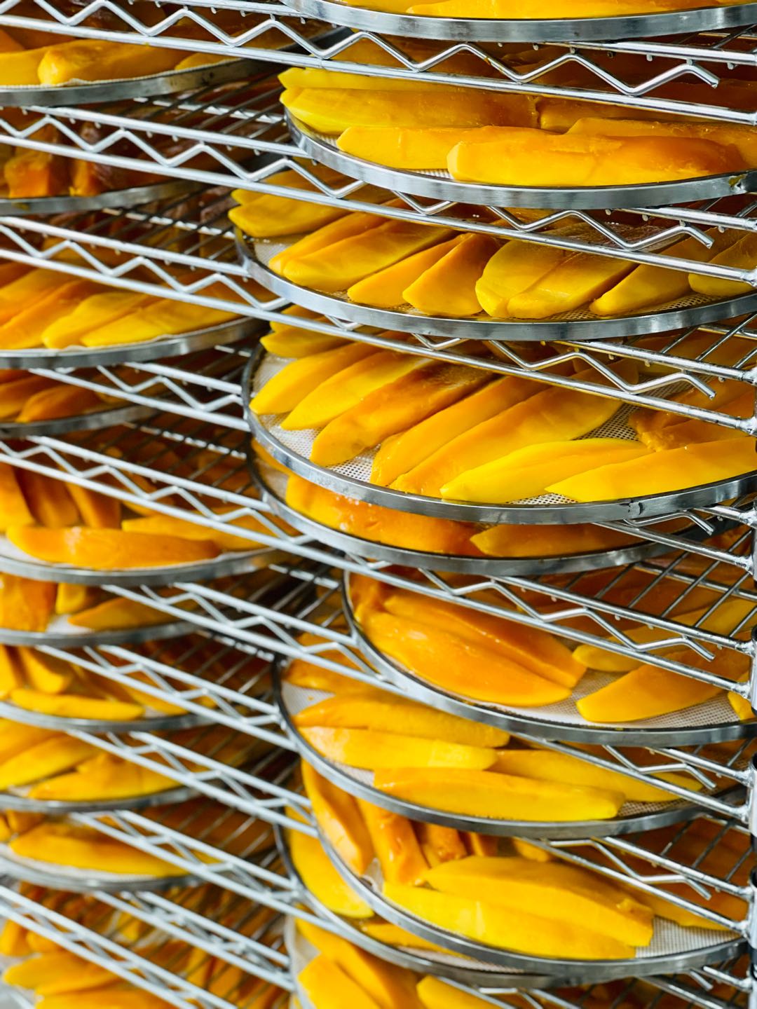 1200斤全熟芒果切片铺盘+400度用电+6个人工~期间需要不间断的观察调整烘箱温湿度,17-20个小时后,再将每一片芒果干从烘盘上取下,冷却、装袋、装箱、打包、发货