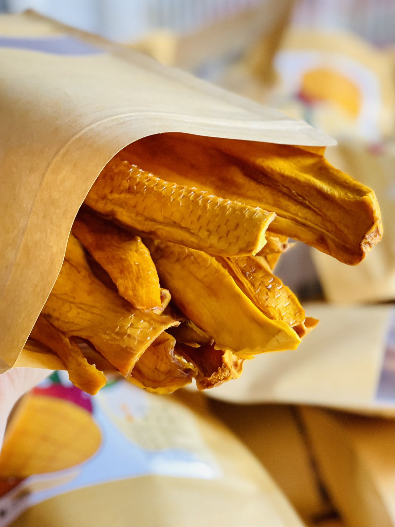 我们的芒果干是鲜切大块果肉直接烘干的,12斤新鲜芒果才可以烘出一斤成品