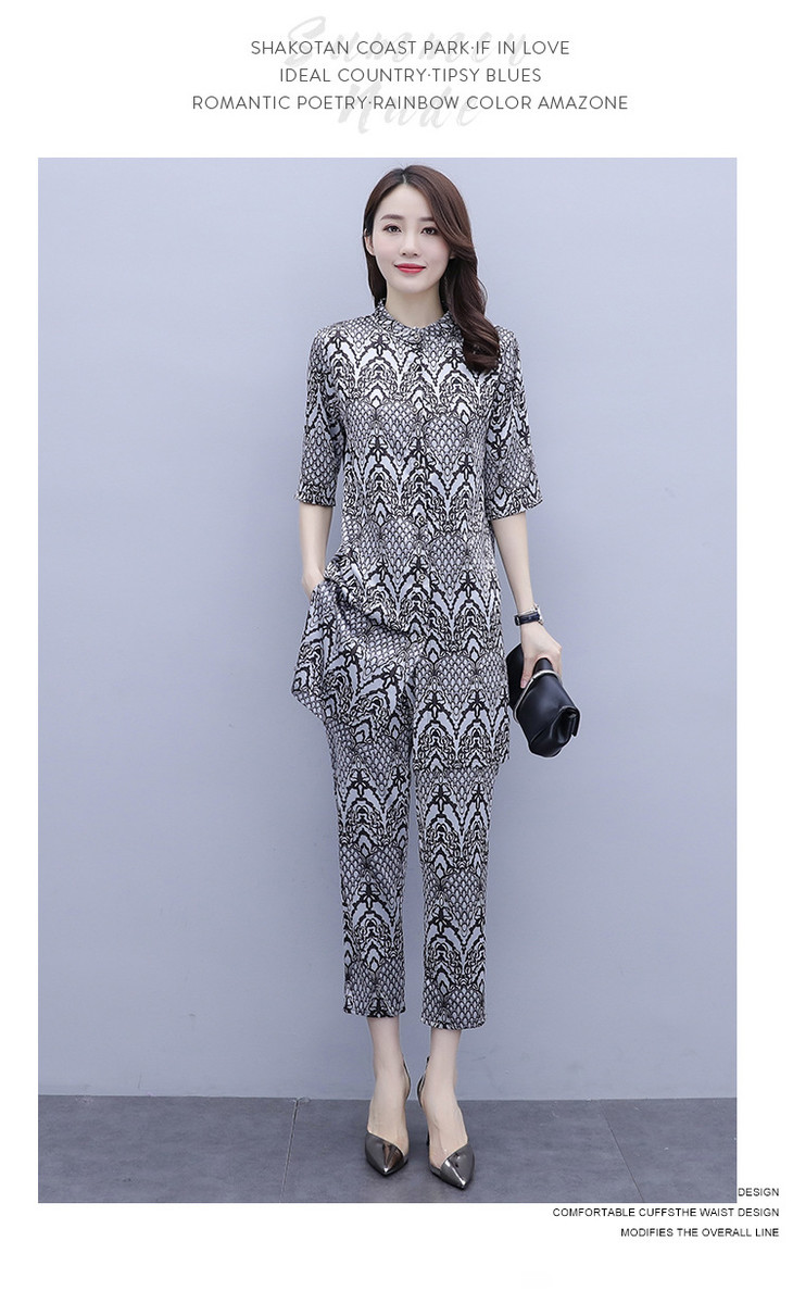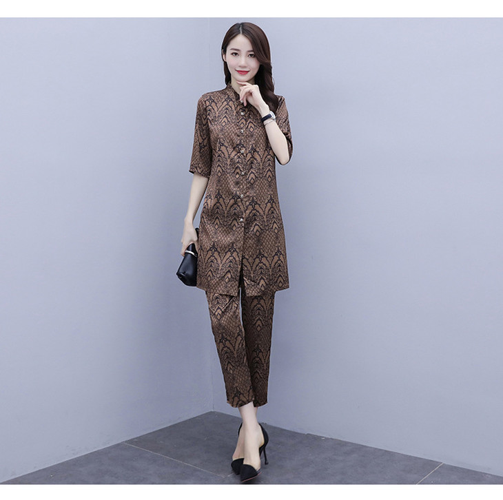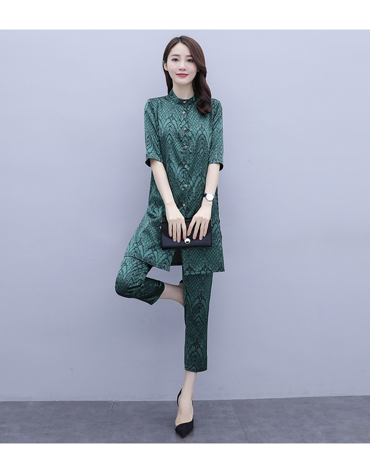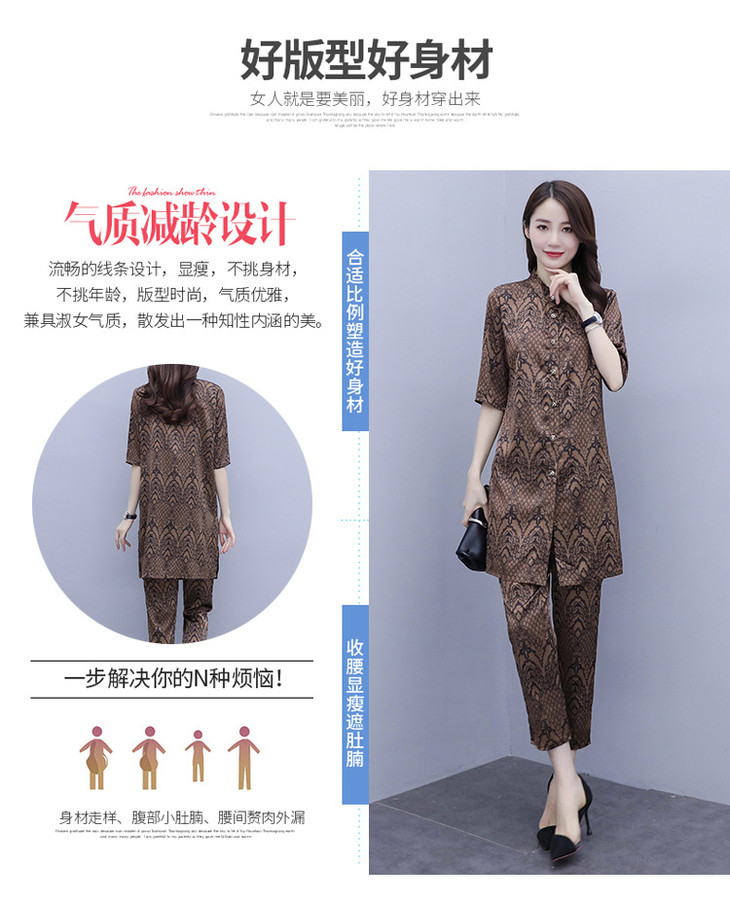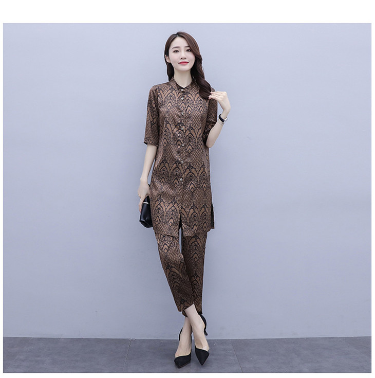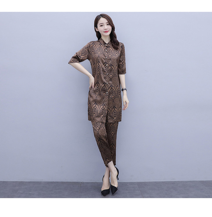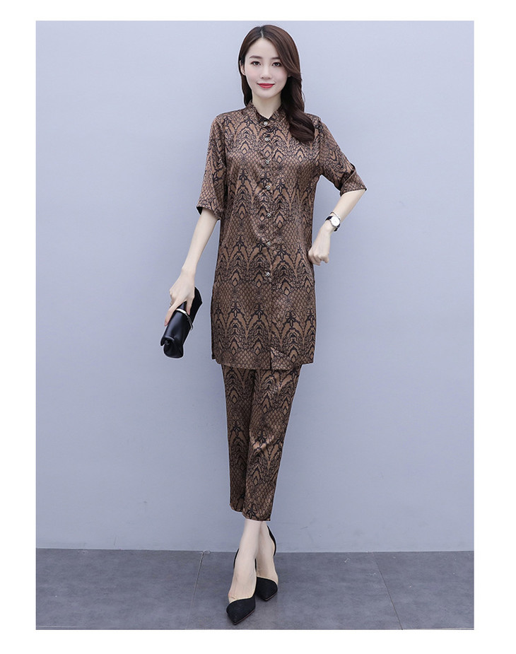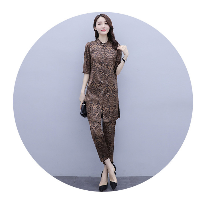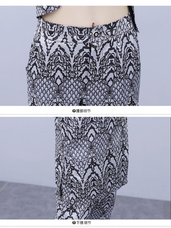 HT-2090新款女休闲时尚缎面印花套装洋气显瘦开衫两件套