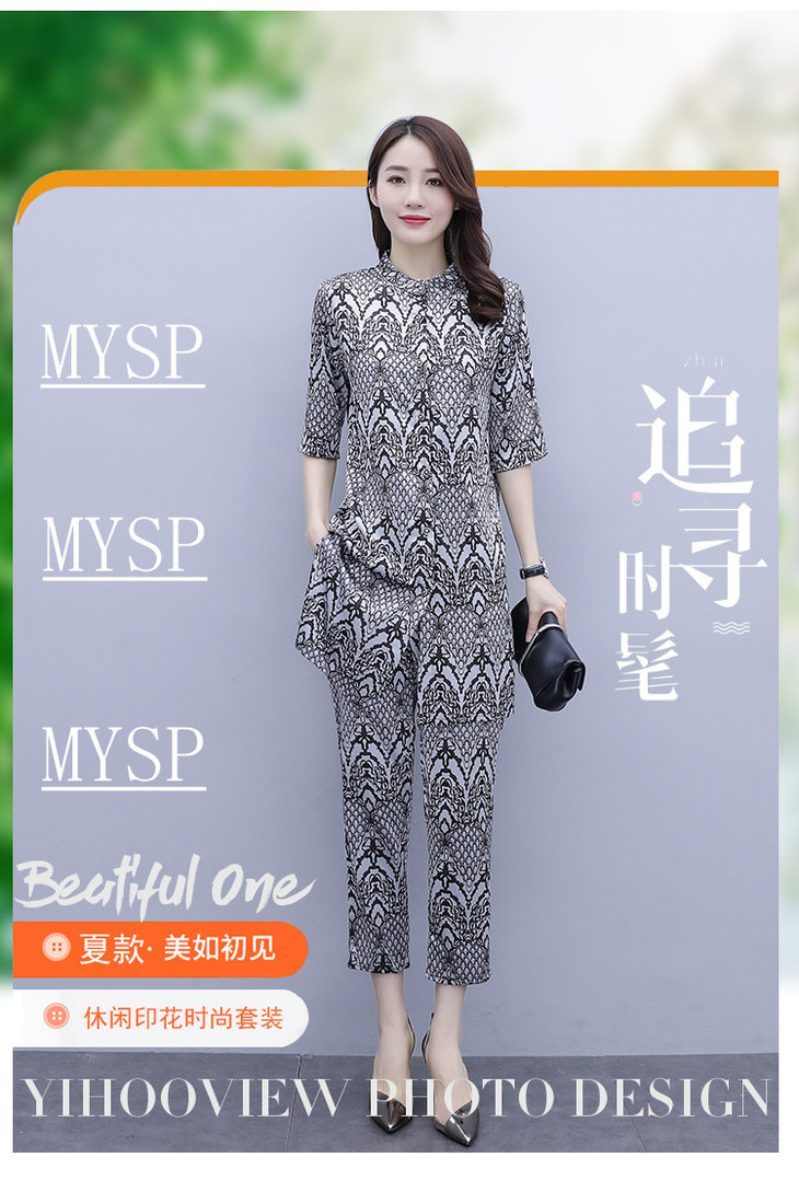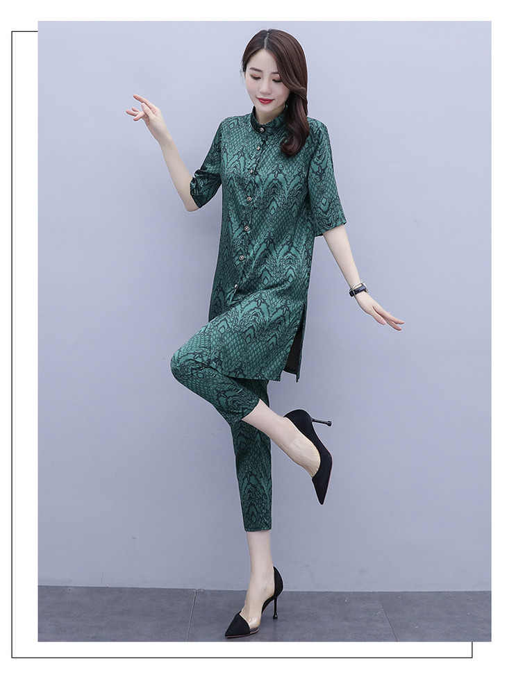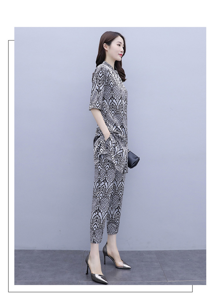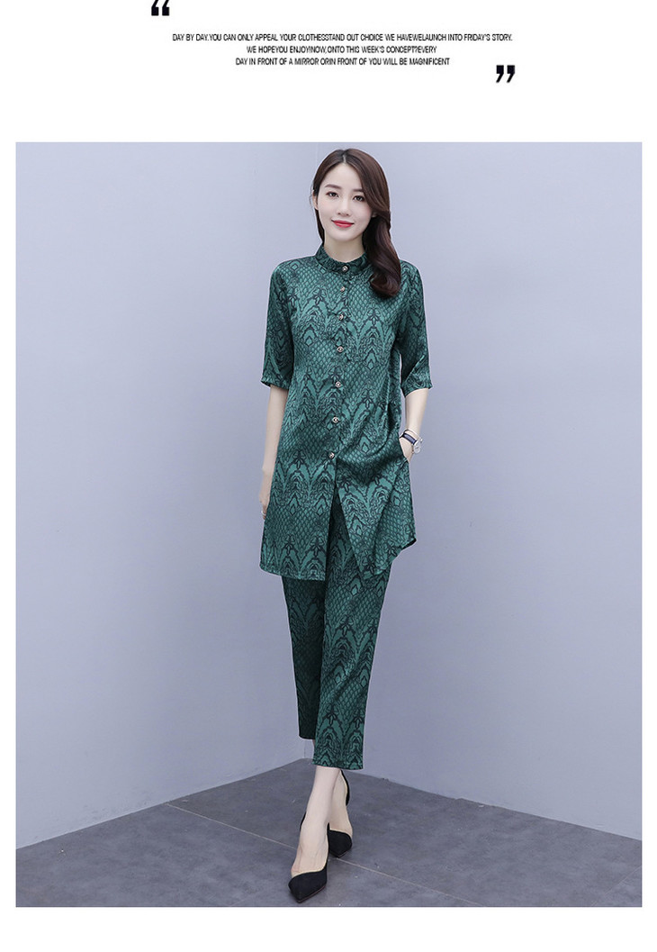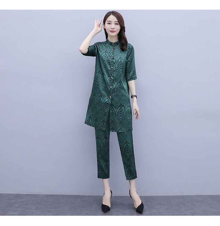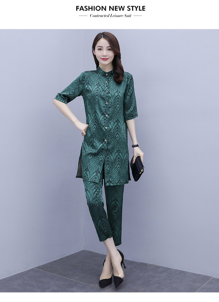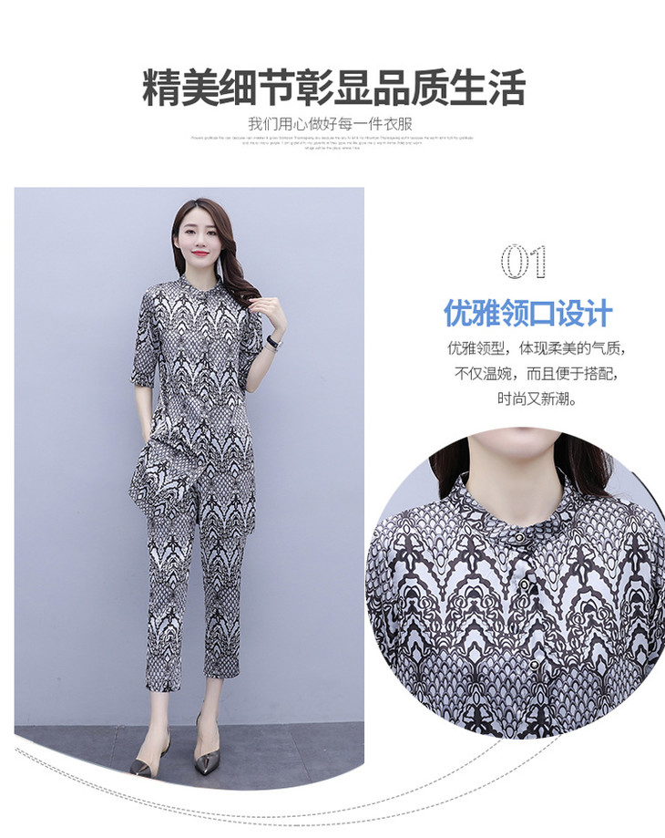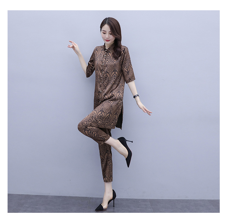 HT-2090新款女休闲时尚缎面印花套装洋气显瘦开衫两件套