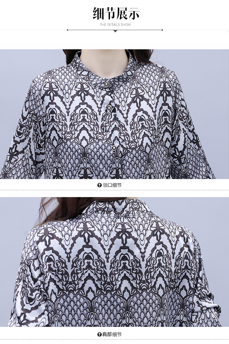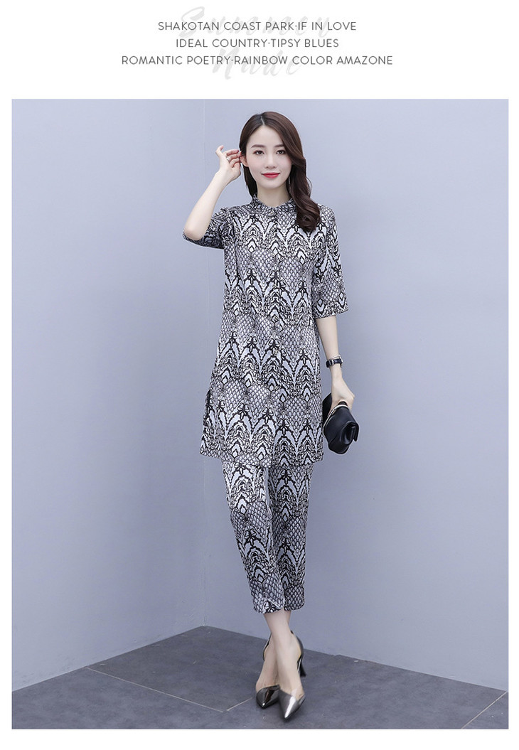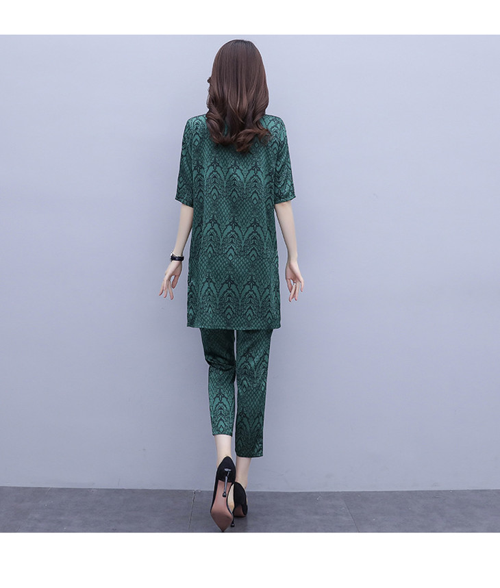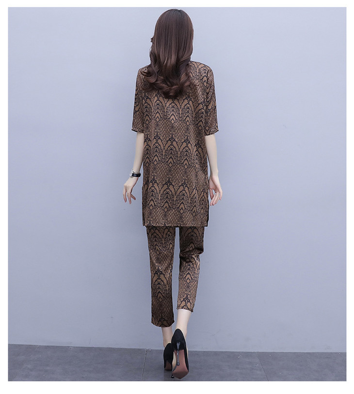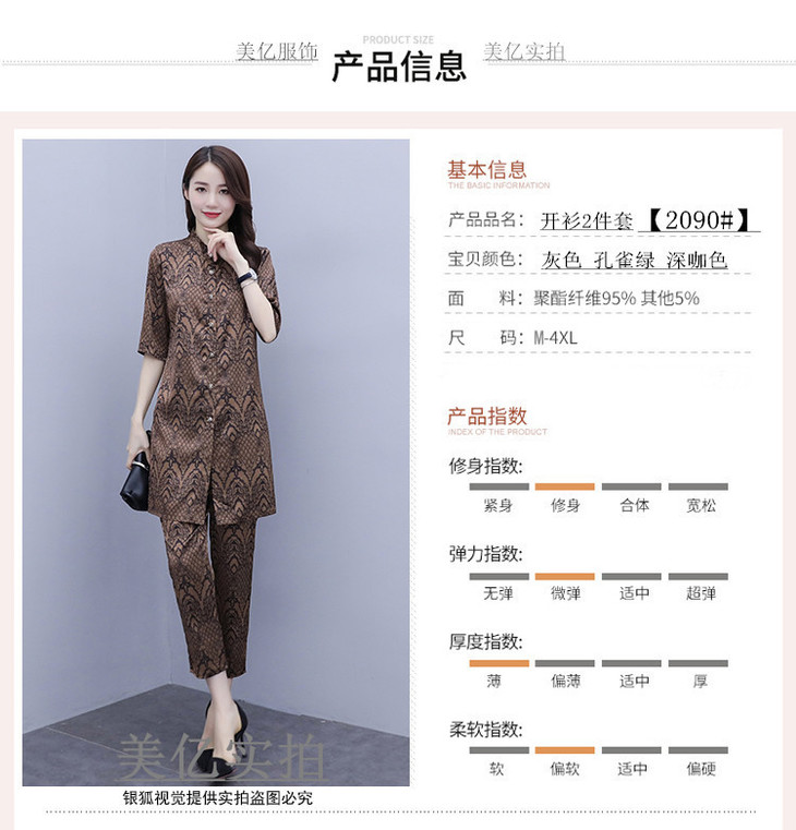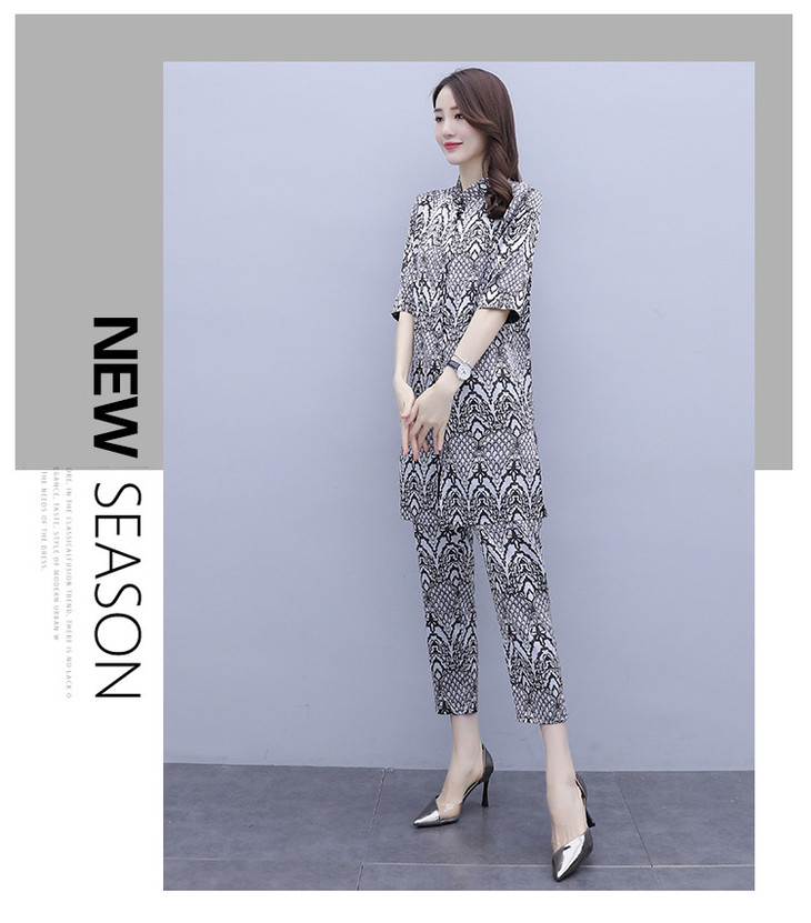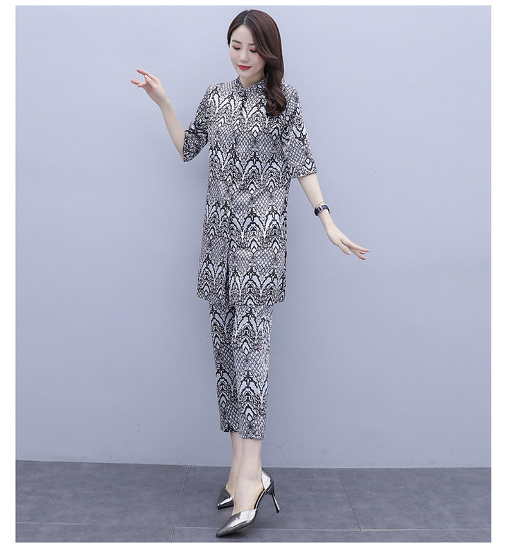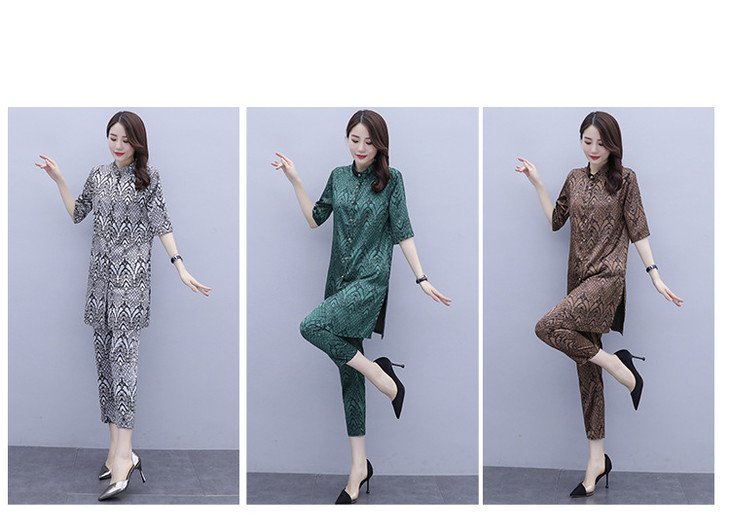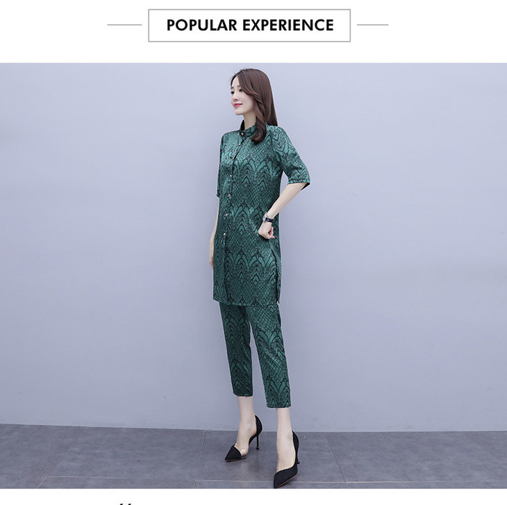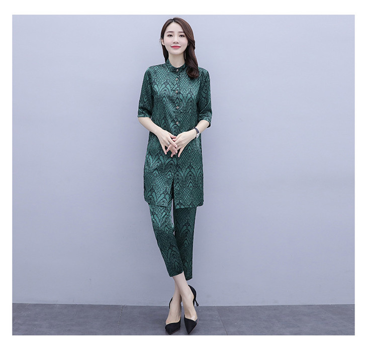 HT-2090新款女休闲时尚缎面印花套装洋气显瘦开衫两件套
