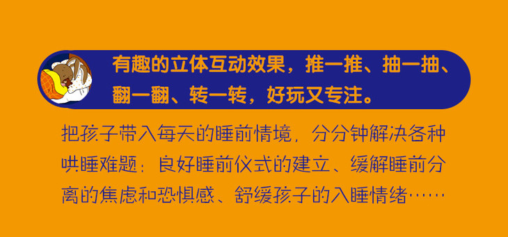 1.通过代入感强的互动绘本故事培养独立睡眠习惯,顺利度过分床过渡期,缓解睡前焦虑和恐惧感,解决孩子哄睡难,睡前拖拉、哭闹、黏人等问题。