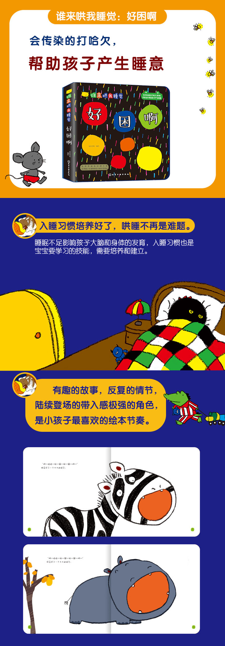 “啊——哈哈——好——困——好——困——啊——”大恐龙打起了大大的哈欠,河马打起了大大的哈欠,熊打起了大大的哈欠,斑马打起了大大的哈欠,兔子打起了大大的哈欠,猫打起了大大的哈欠,小老鼠打起了大大的哈欠??该睡觉了。通过打哈欠的有趣故事,在反射动作中帮助孩子营造轻松的睡前环境,培养睡意。
