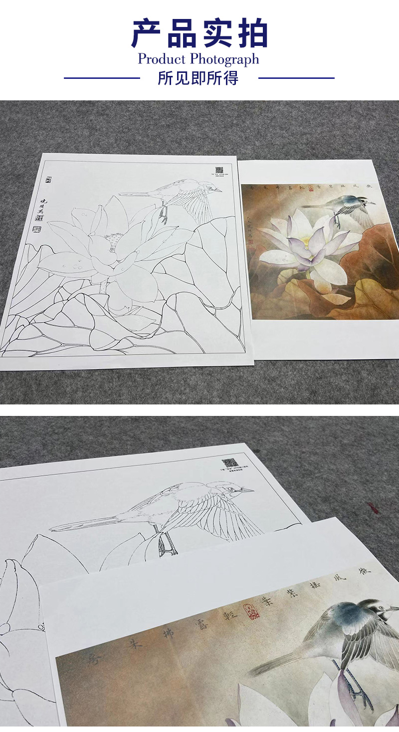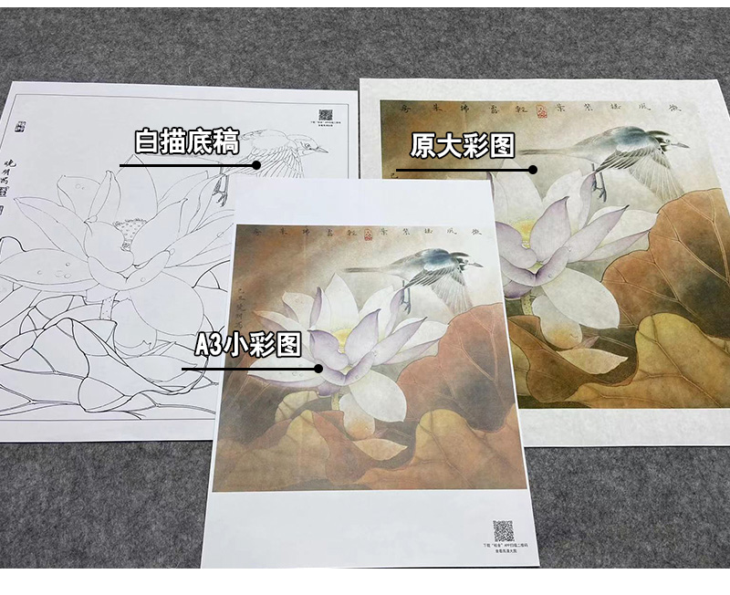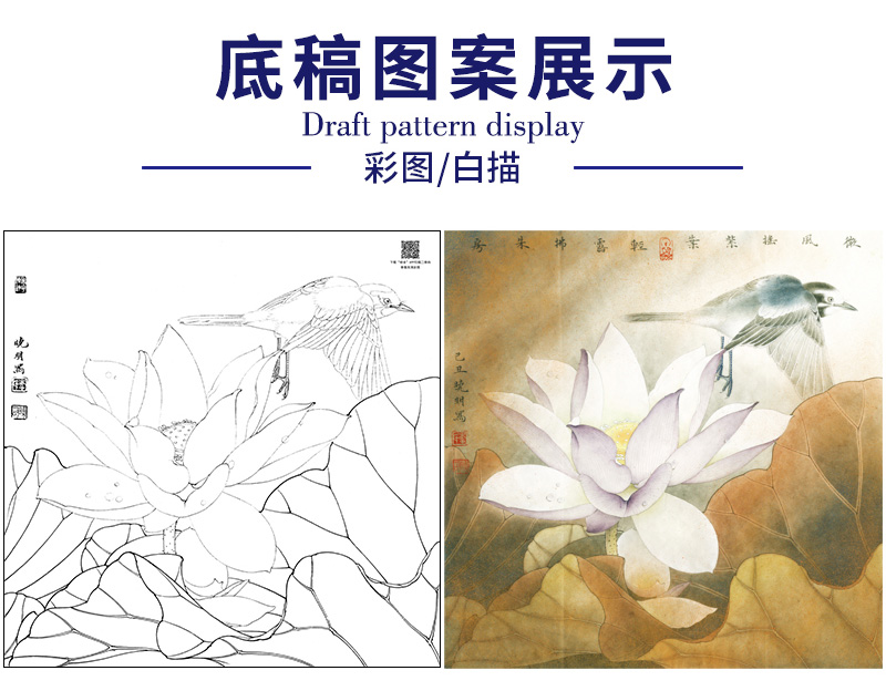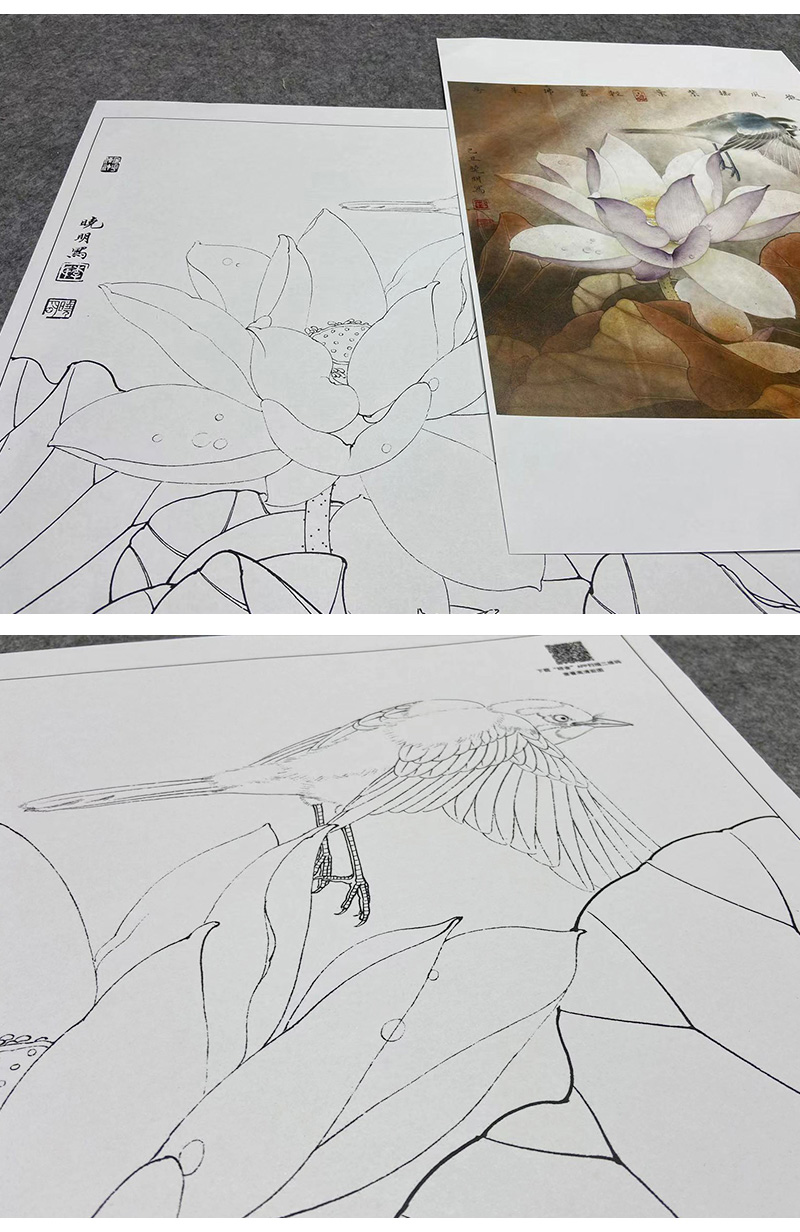 【大彩图】李晓明工笔画白描底稿斗方小品《紫荷白鹡鸰》荷花临摹勾线花鸟线稿K094