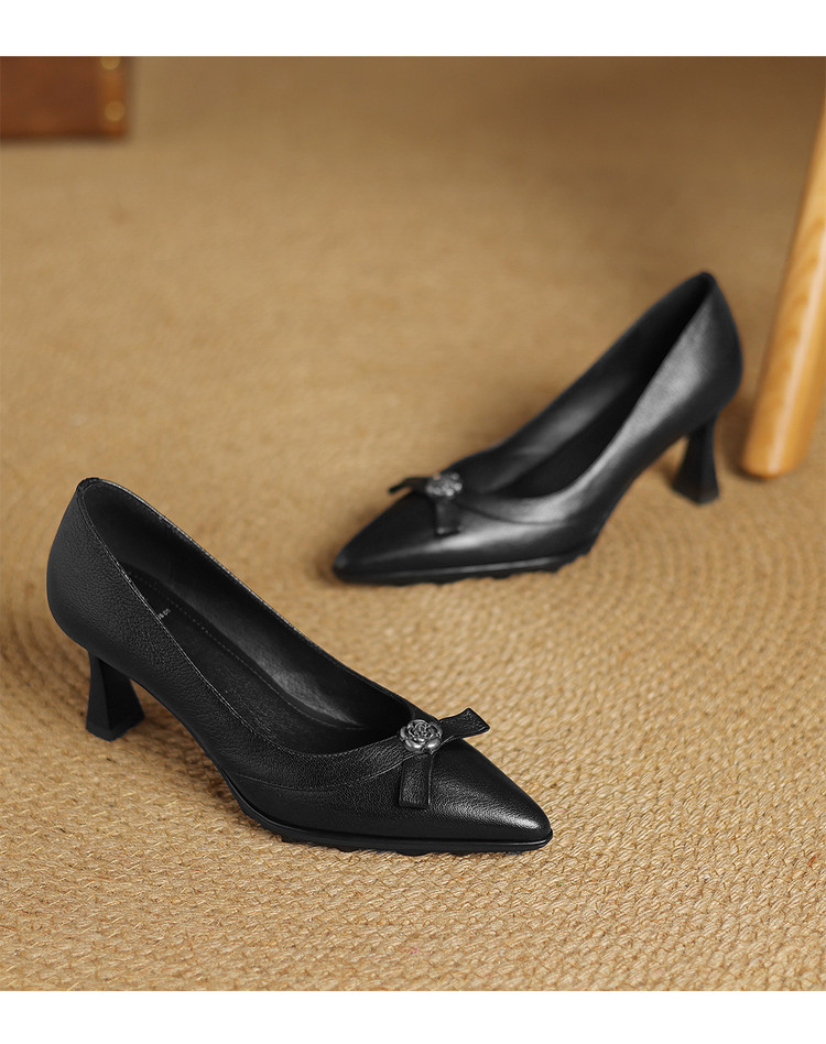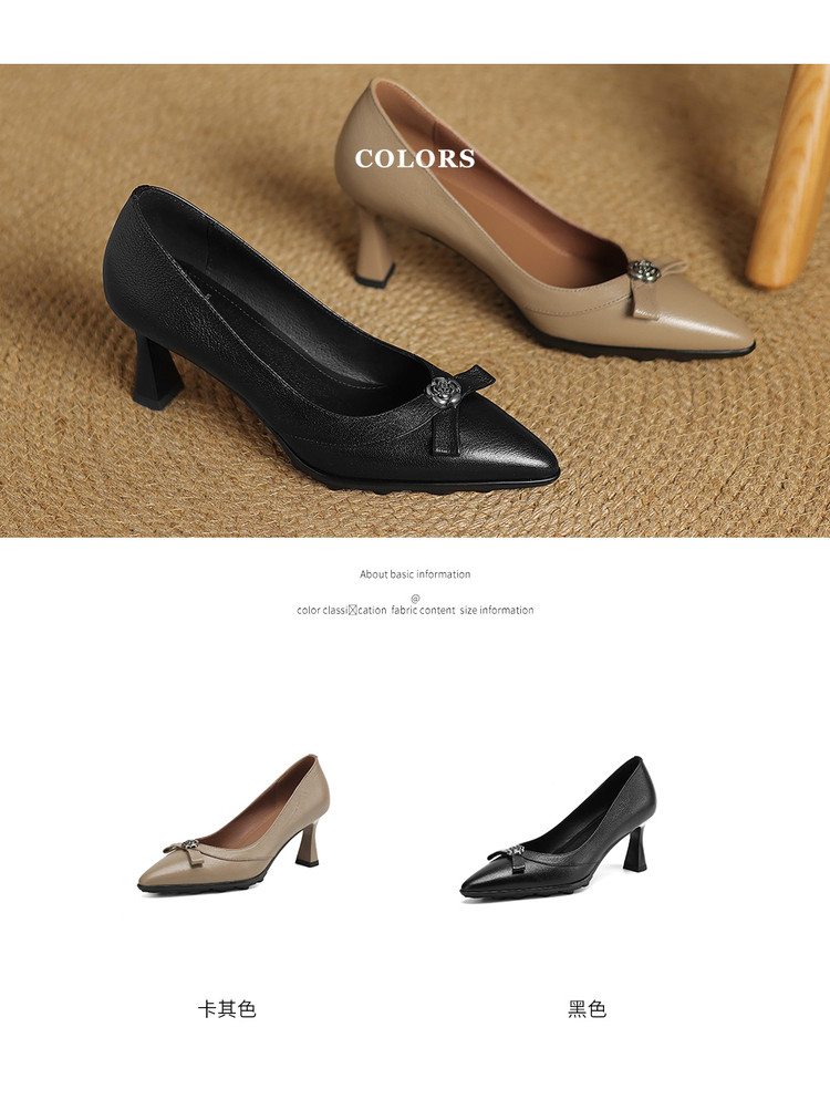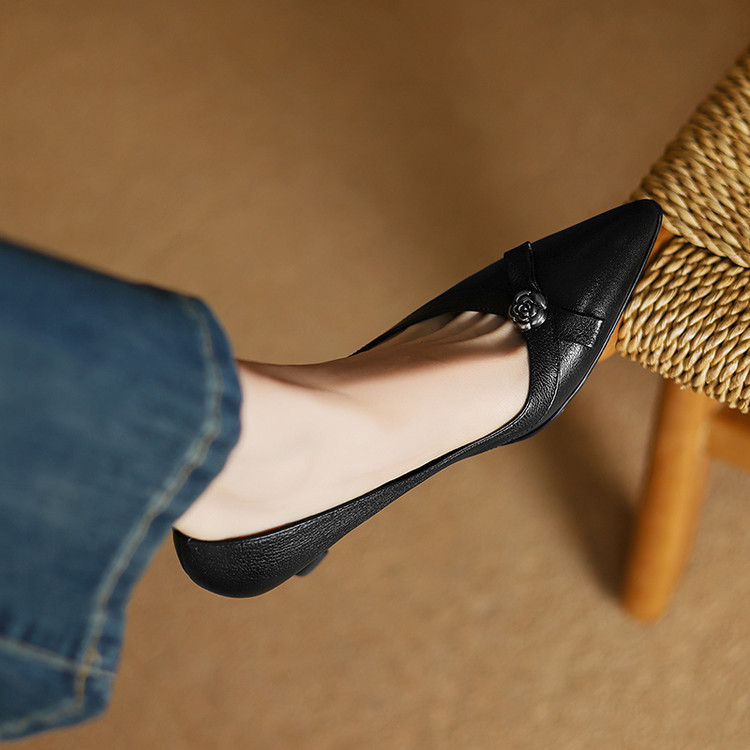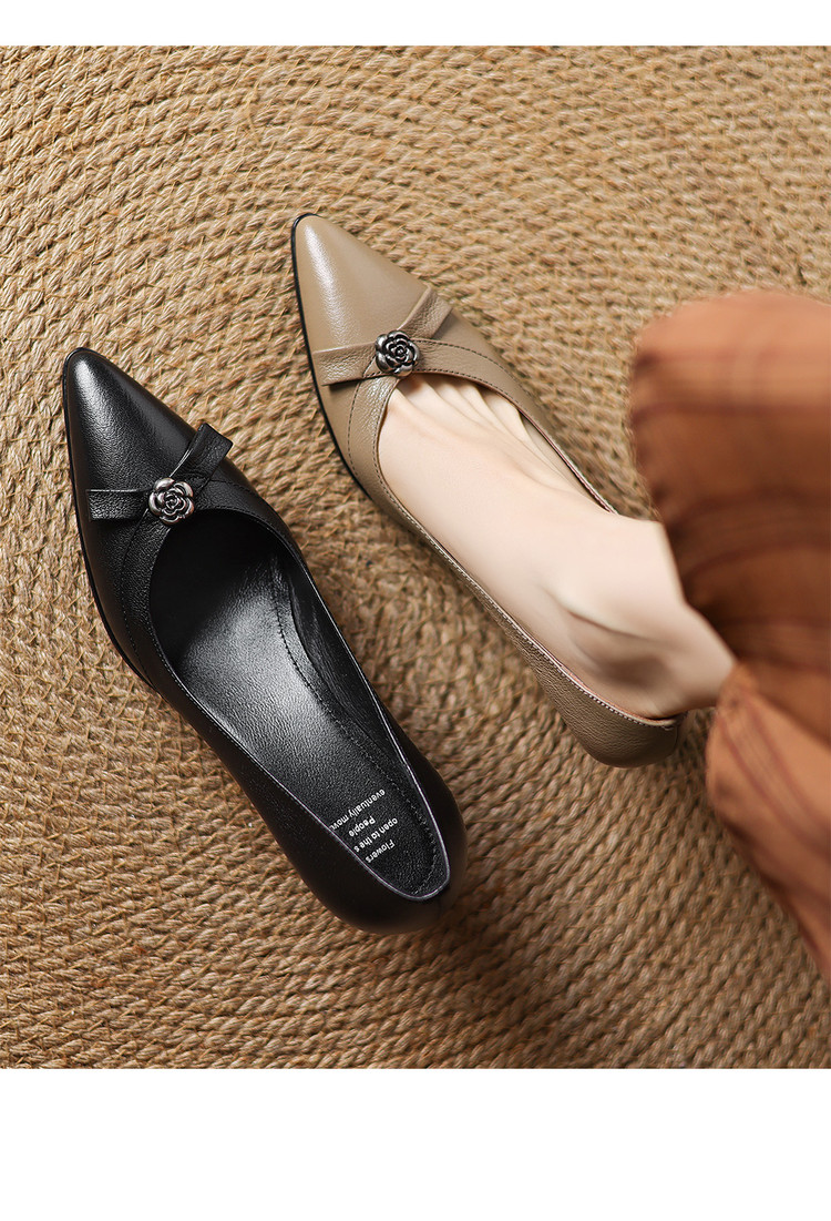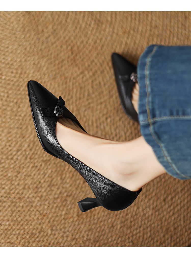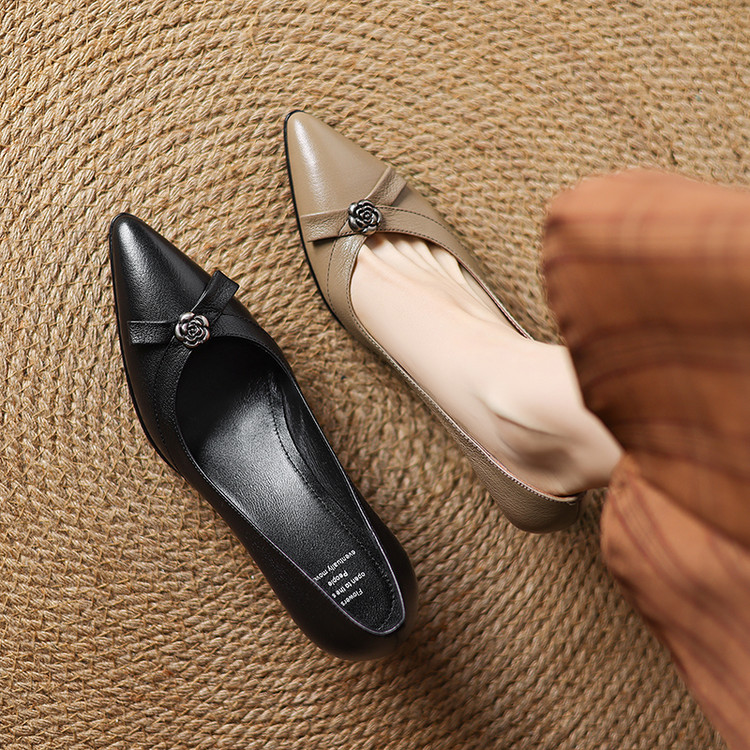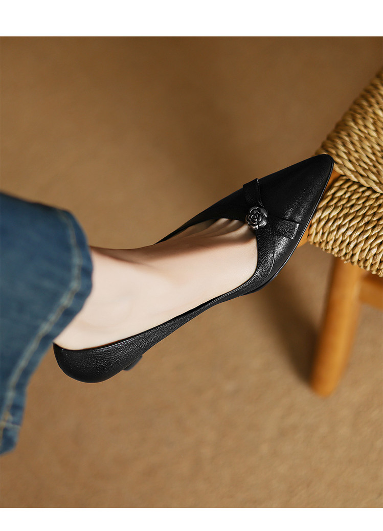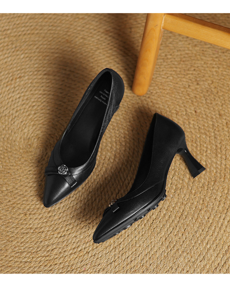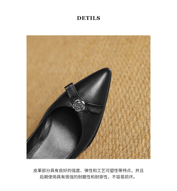 【预售5天】更舒适防滑厚底质感十足羊皮细高跟尖头真皮浅口花朵单鞋女QQJFG&JZ-1739F
