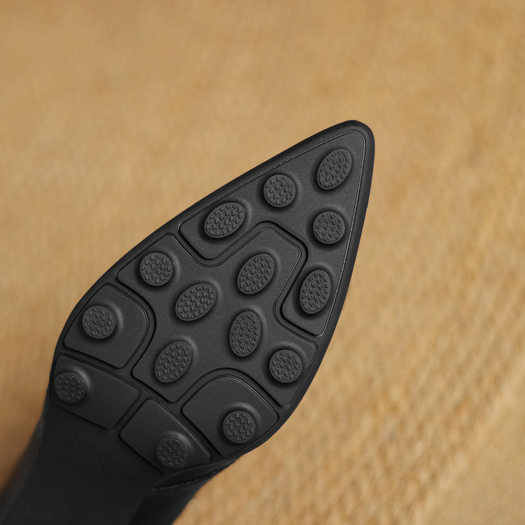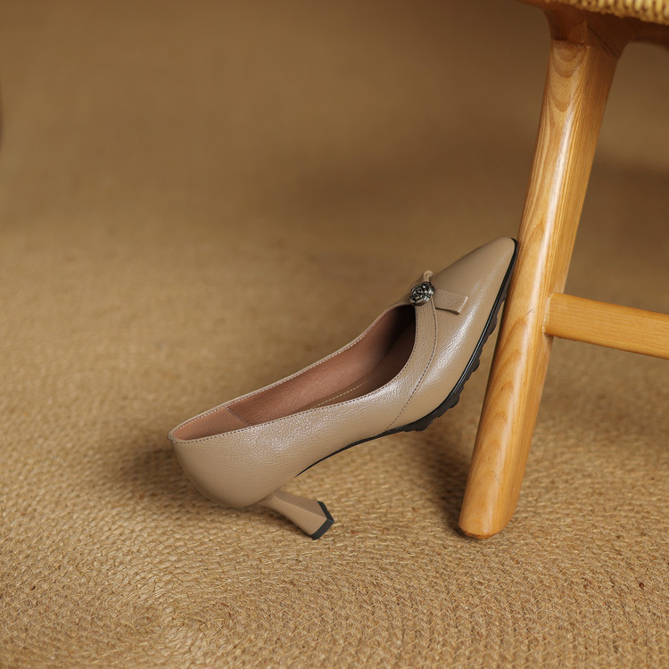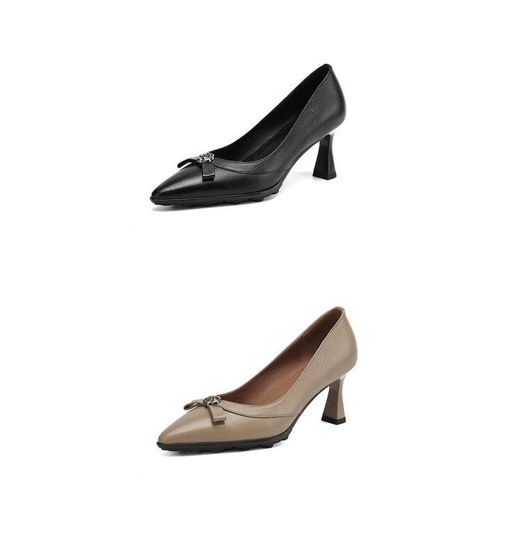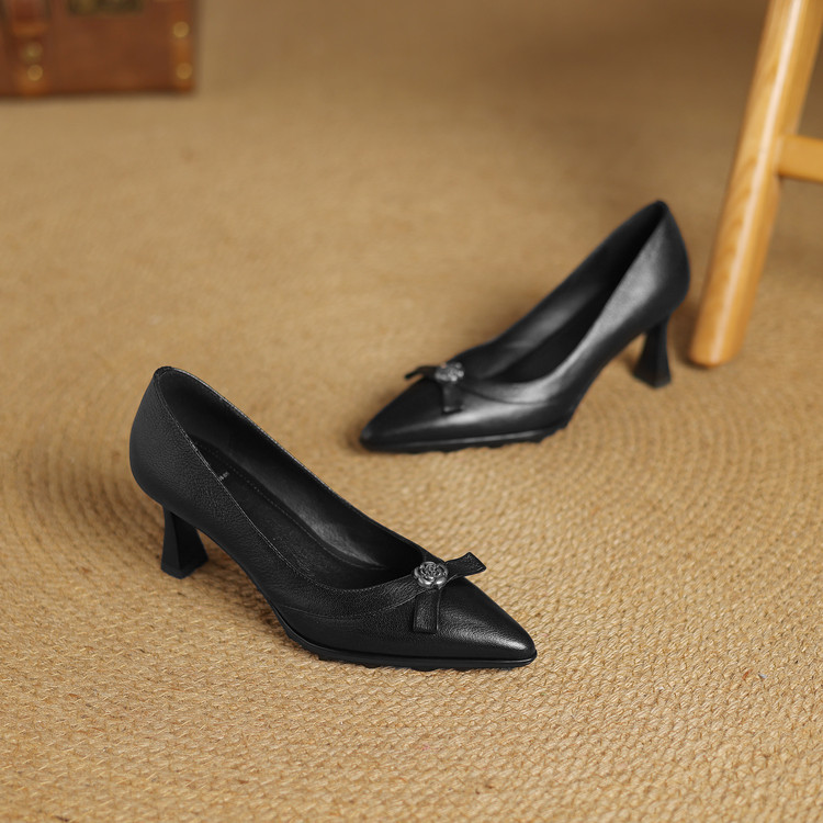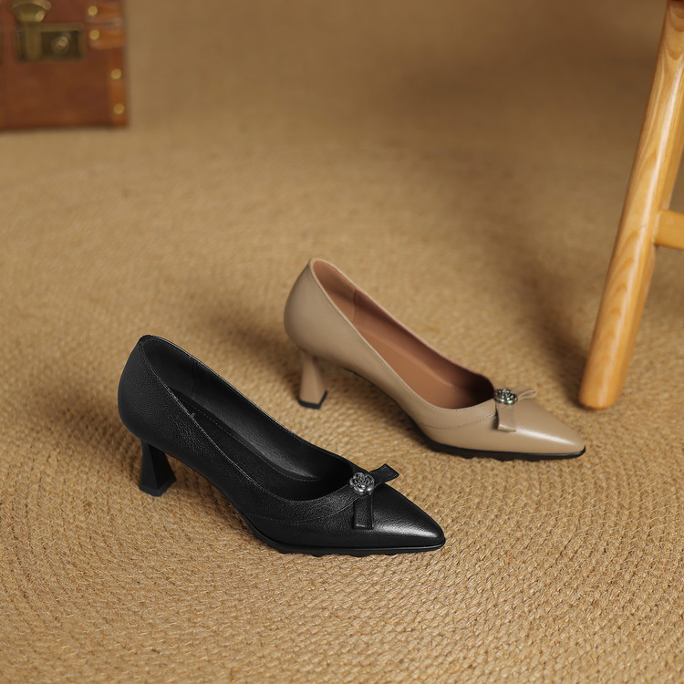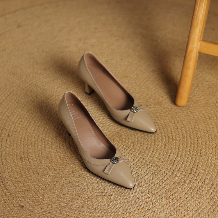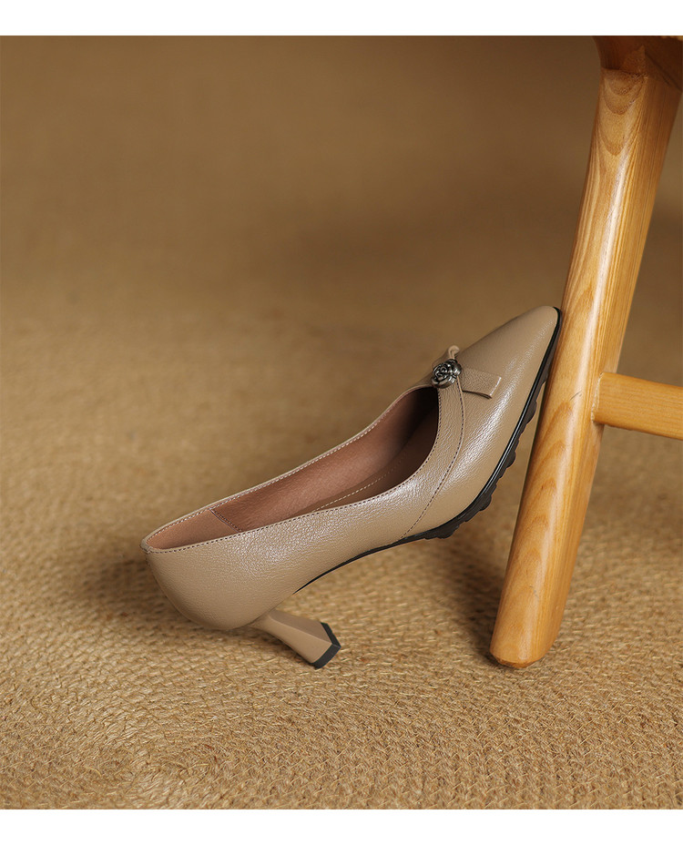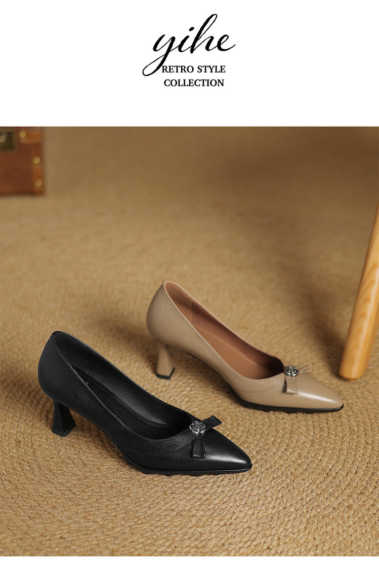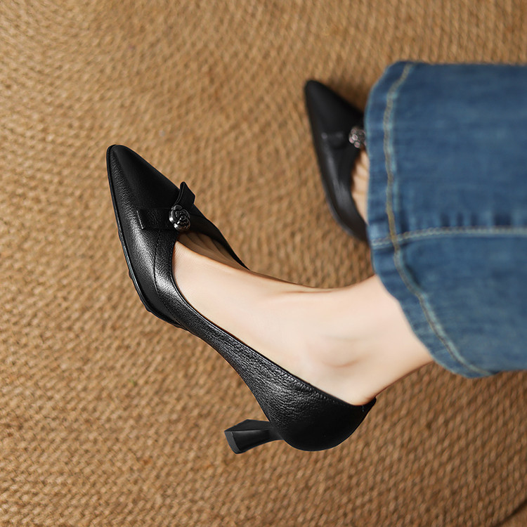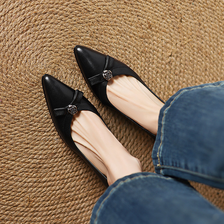 【预售5天】更舒适防滑厚底质感十足羊皮细高跟尖头真皮浅口花朵单鞋女QQJFG&JZ-1739F