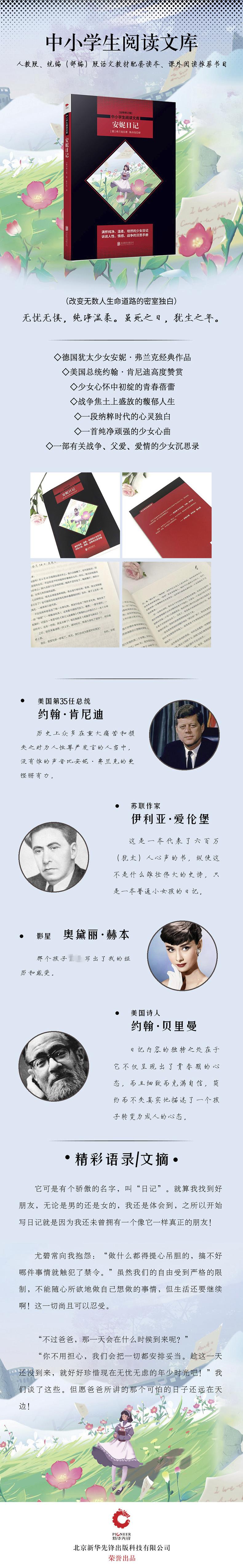 "少女心怀中初绽的青春蓓蕾 战争焦土上盛放的馥郁人生 ★德国犹太少女安妮·弗兰克备受推崇的儿童文学作品。 ★美国总统约翰·肯尼迪高度赞誉。 ★一部有关战争、父爱、爱情的少女沉思录。 ★一段纳粹时代的心灵独白,一首纯净顽强的少女心曲,一本改变无数人生命道路的励志经典。 “无忧无惧,纯净温柔。虽死之日,犹生之年。”"