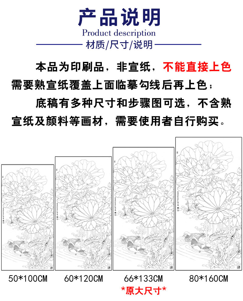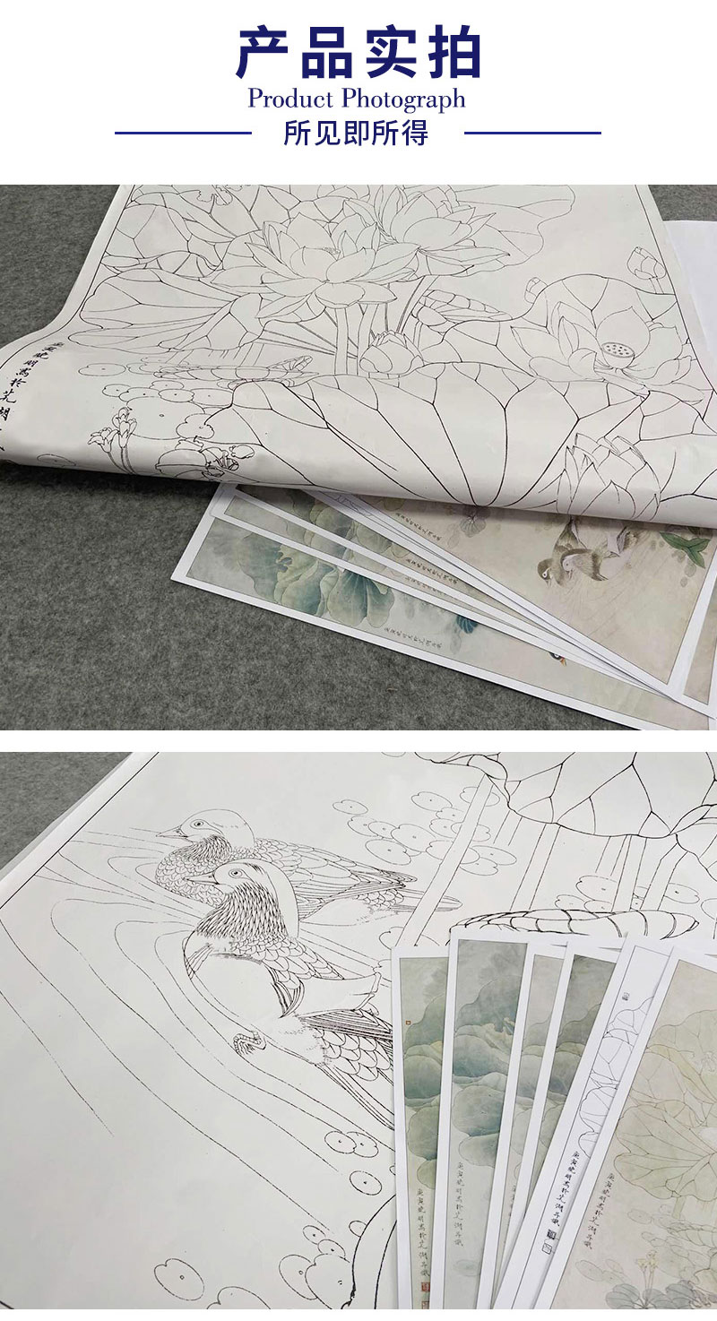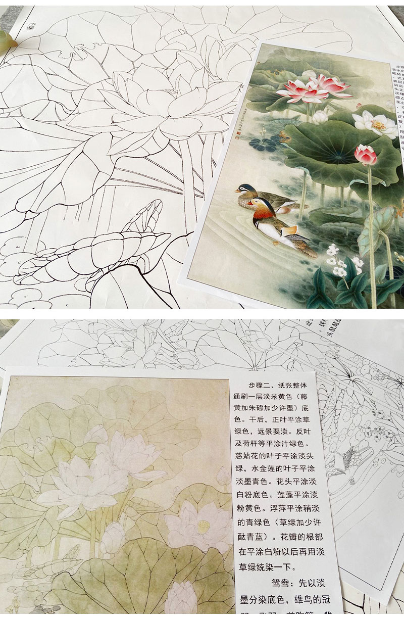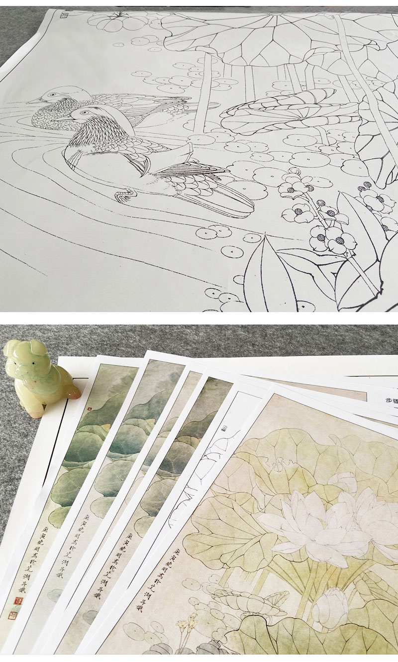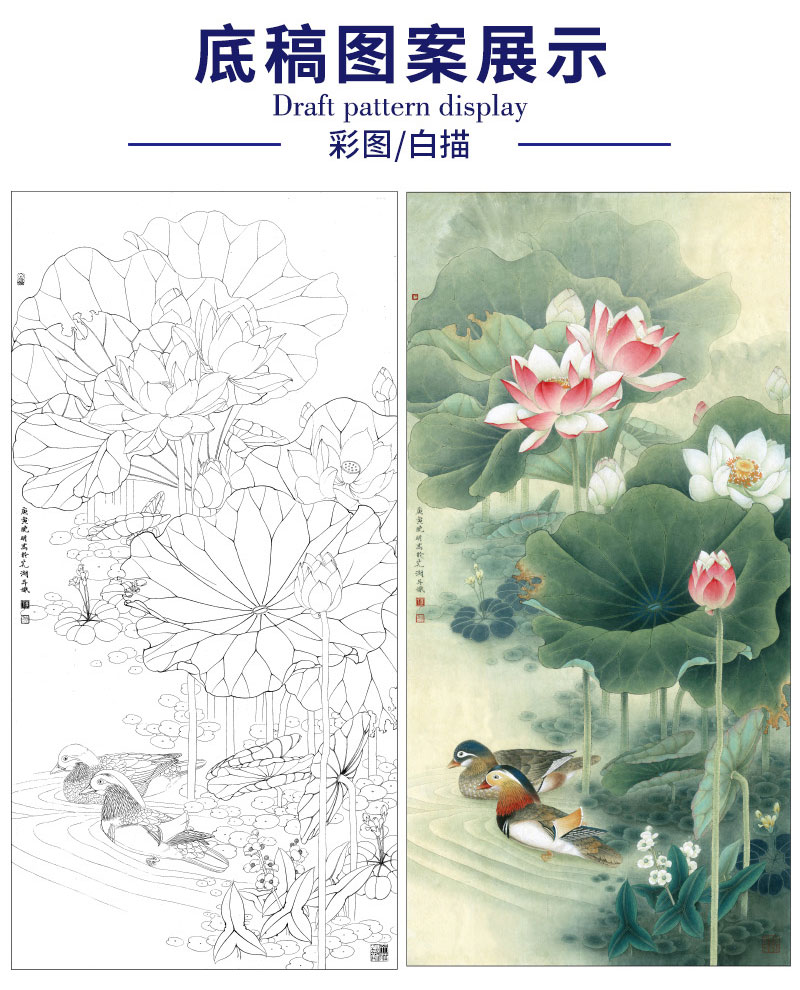 【有步骤、大彩图】李晓明工笔画白描底稿《荷塘鸳鸯图》荷花初学者临摹花鸟线稿KE02