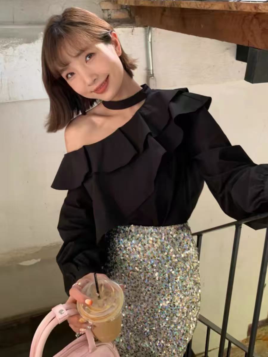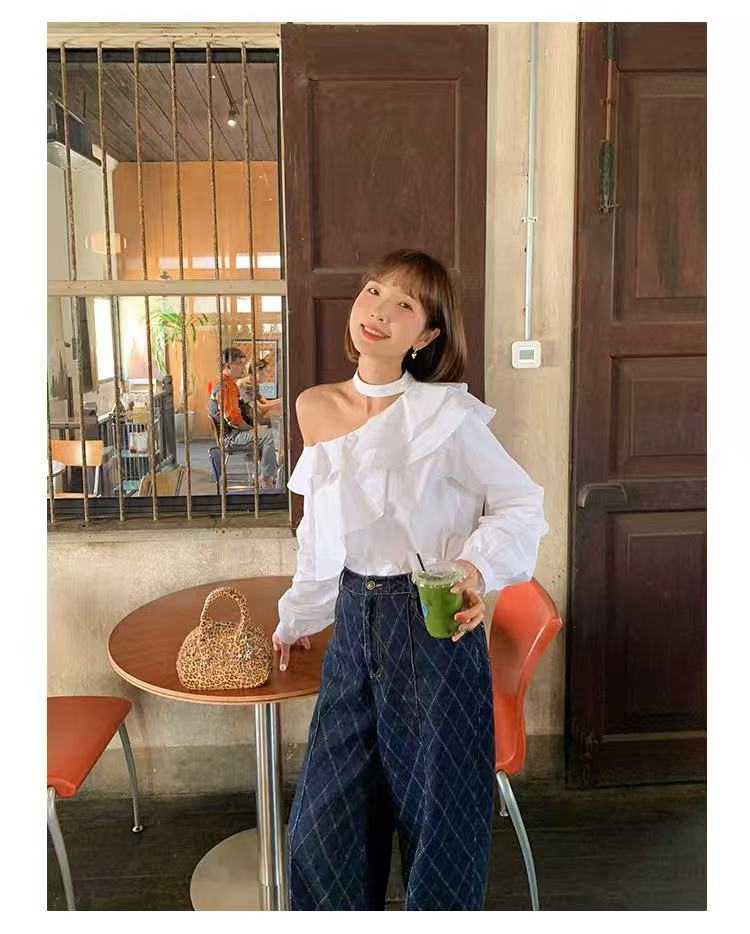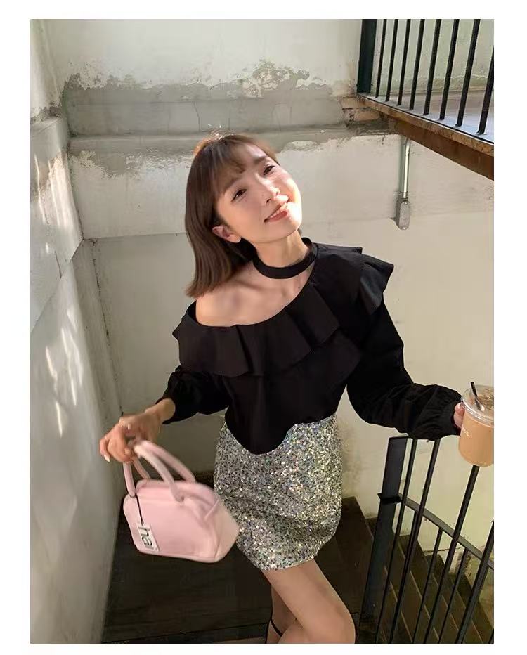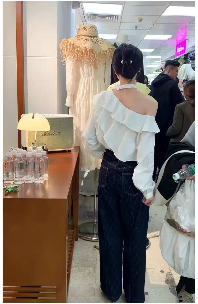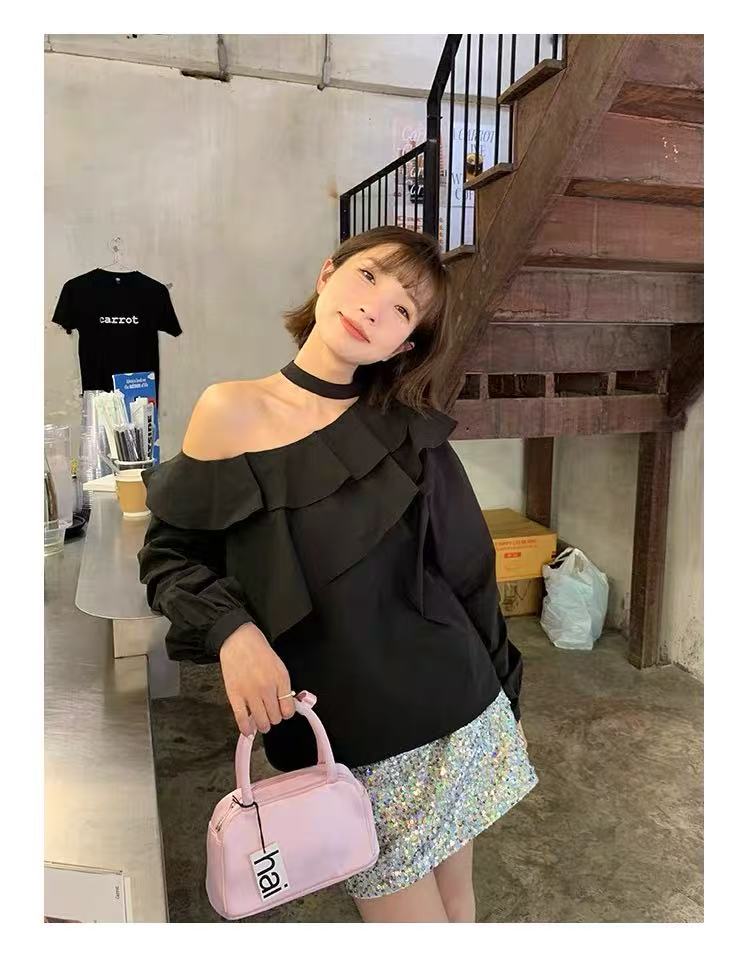 9.24清仓 设计师品牌-法式挂脖宽松荷叶边斜肩露肩上衣女长袖小衫-喜出