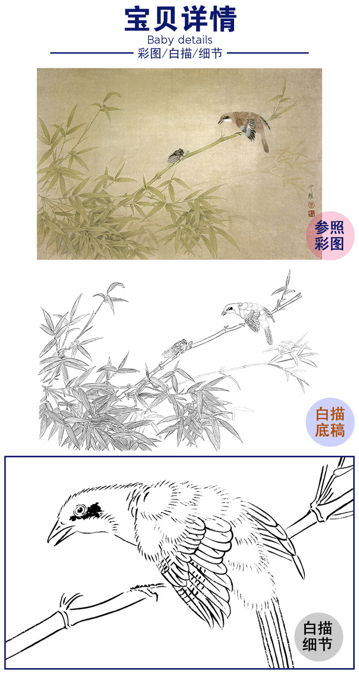 横幅工笔花鸟白描底稿-周中耀《松鸦尔何来》-多种白描尺寸可选-ZT19