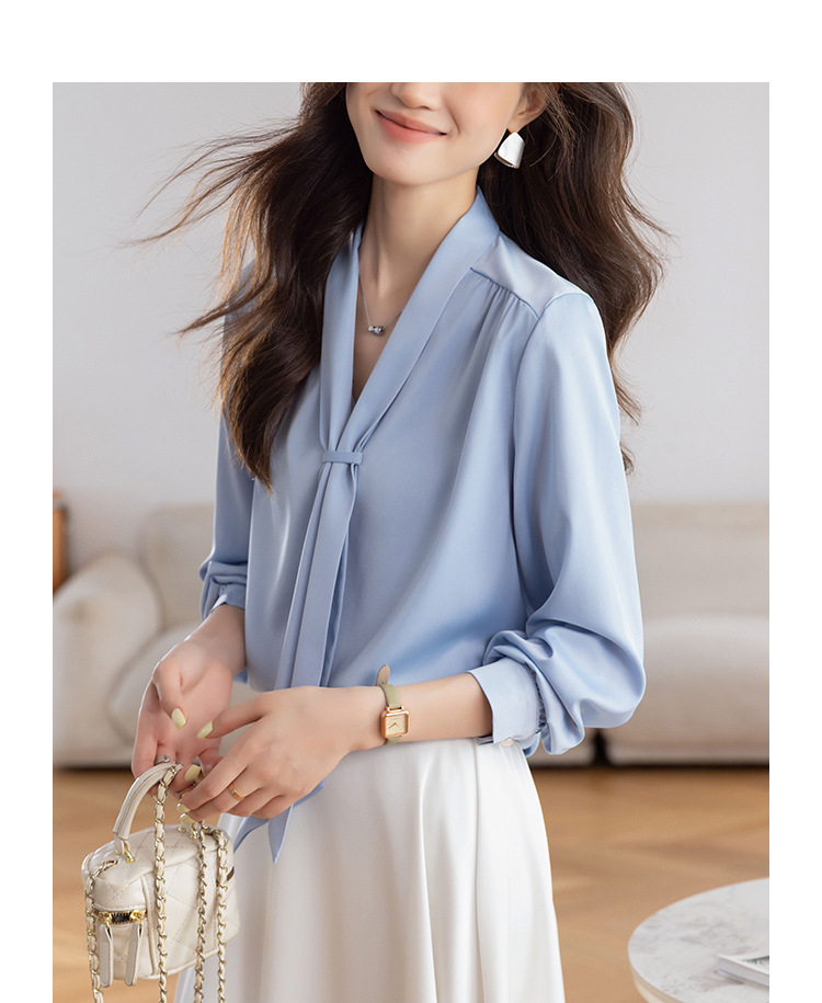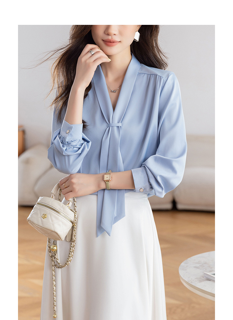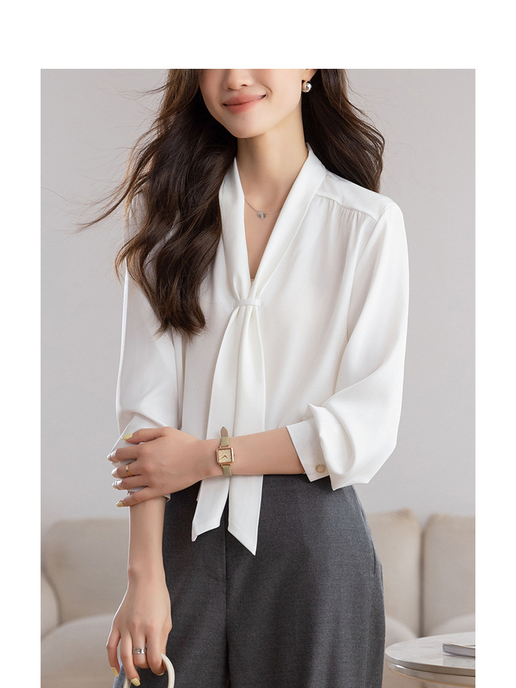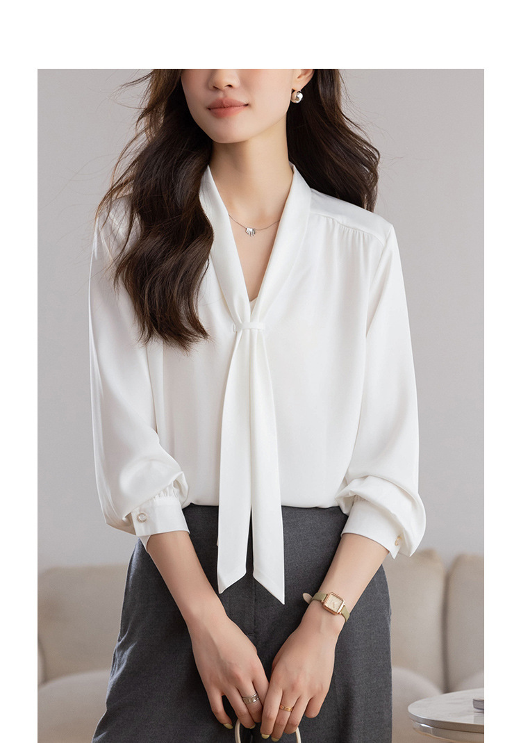 KQL 617T8332法式V领白衬衫长袖设计感飘带上衣衬衣