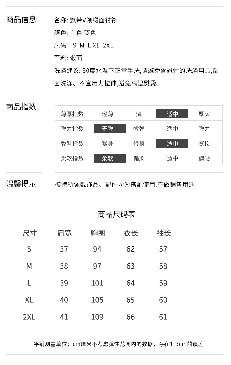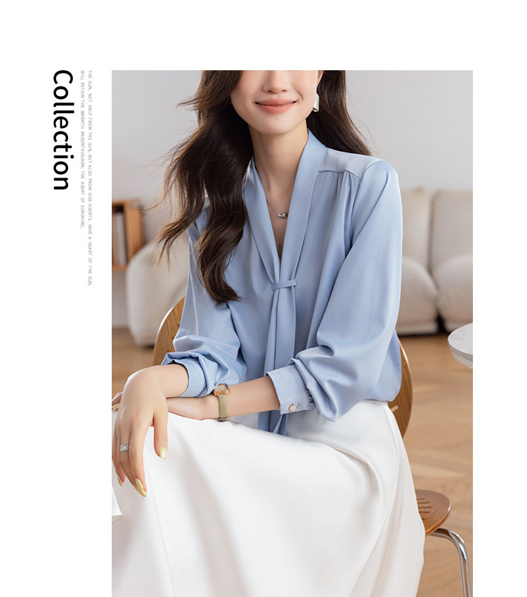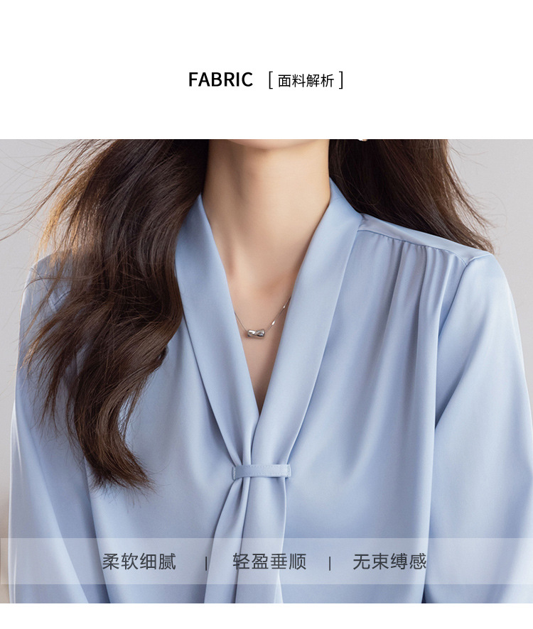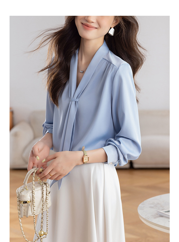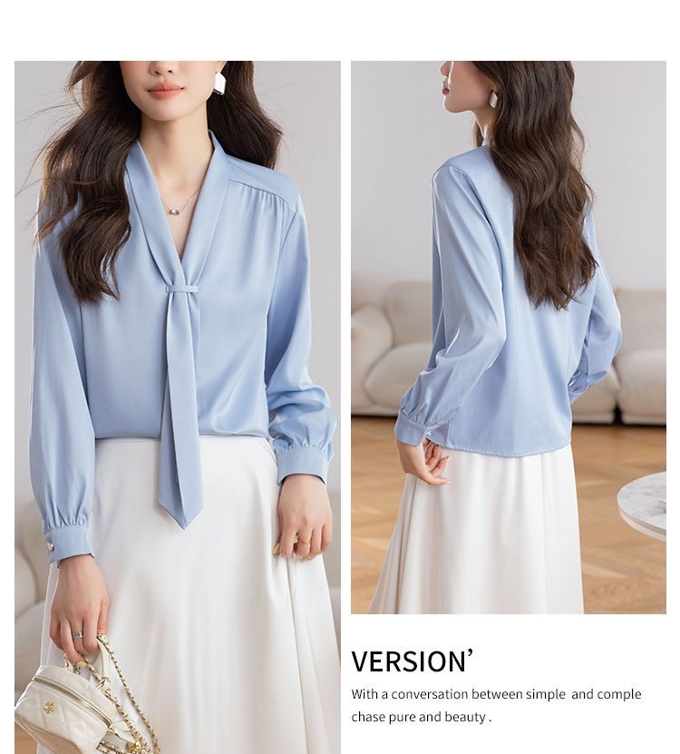 KQL 617T8332法式V领白衬衫长袖设计感飘带上衣衬衣