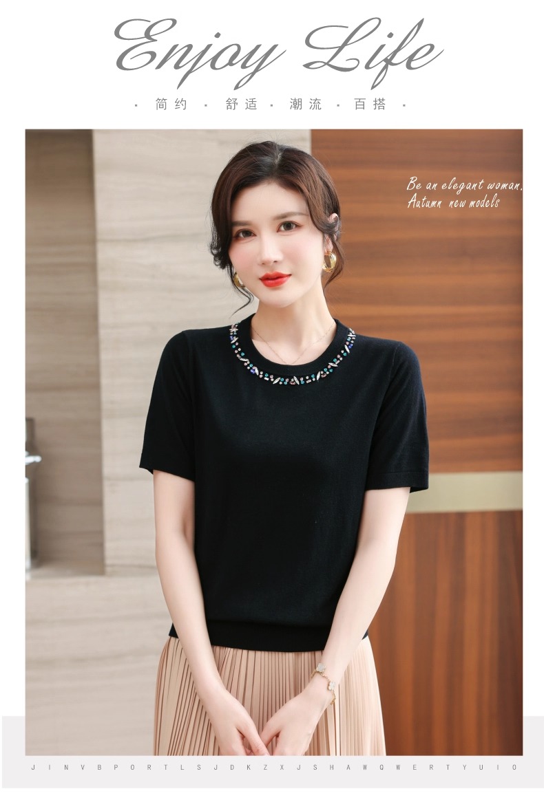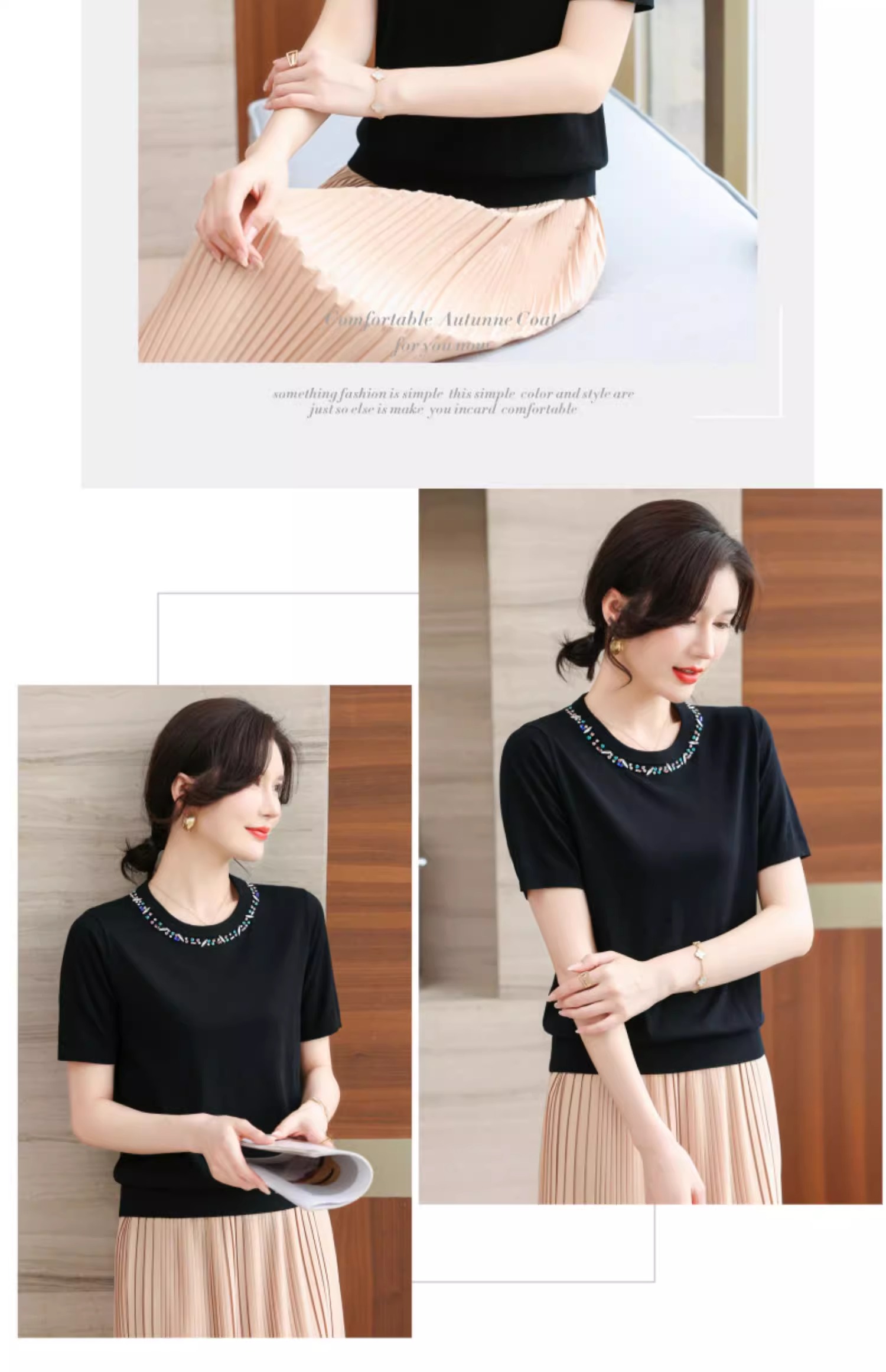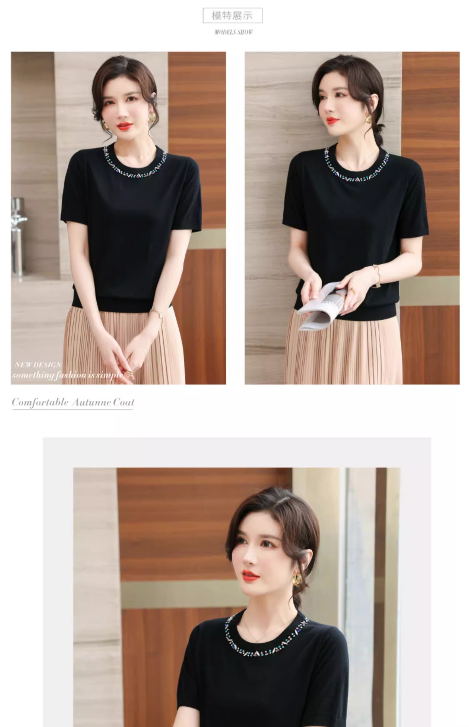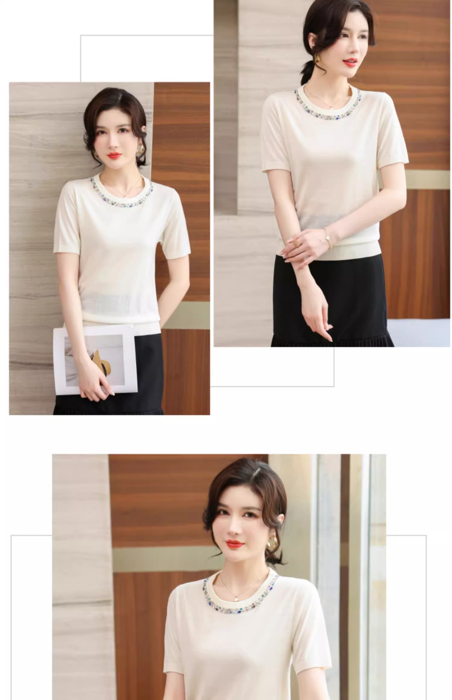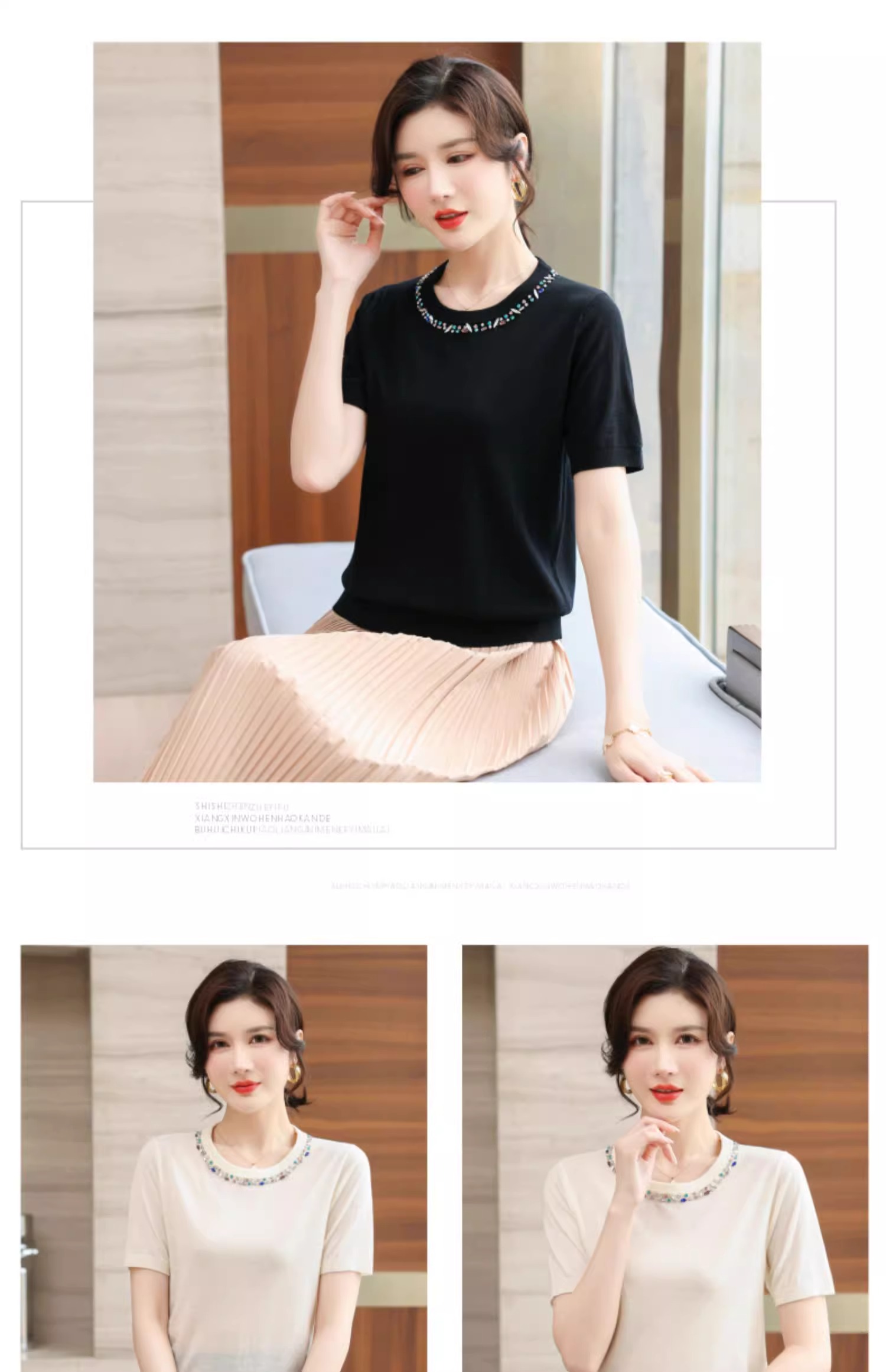 「老顾客开团福利」夏季冰丝针织短袖T恤2025夏季新款纯色重工钉珠圆领针织衫正肩显瘦上衣62442