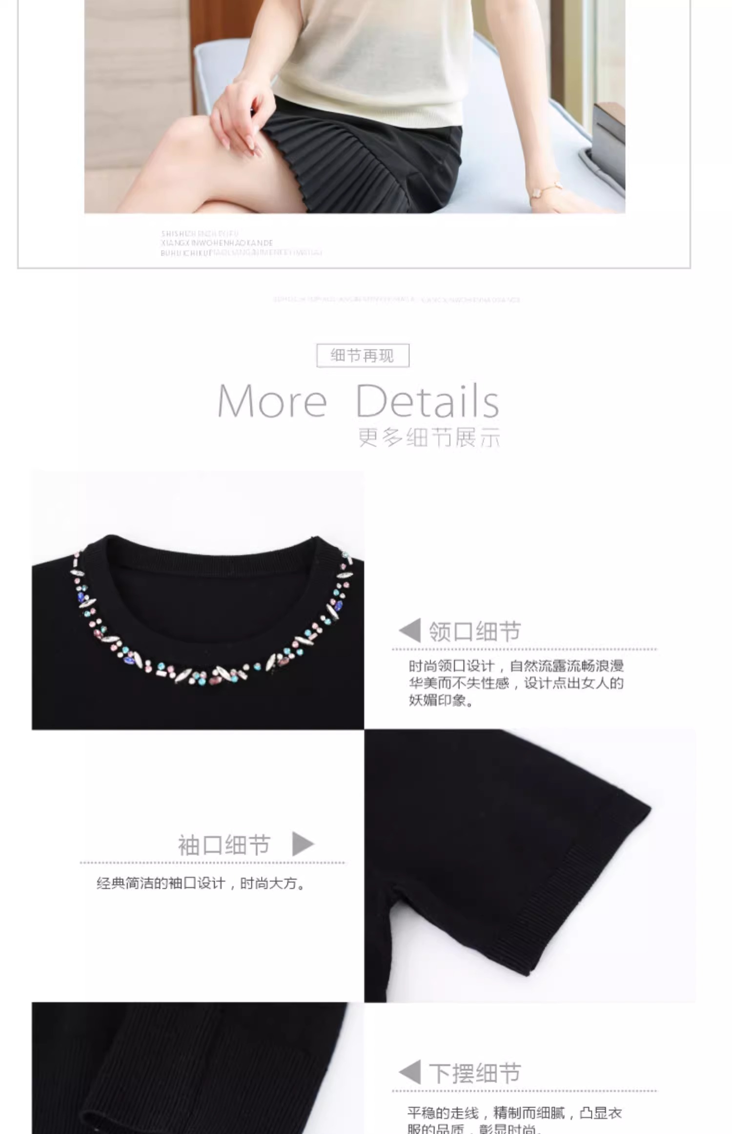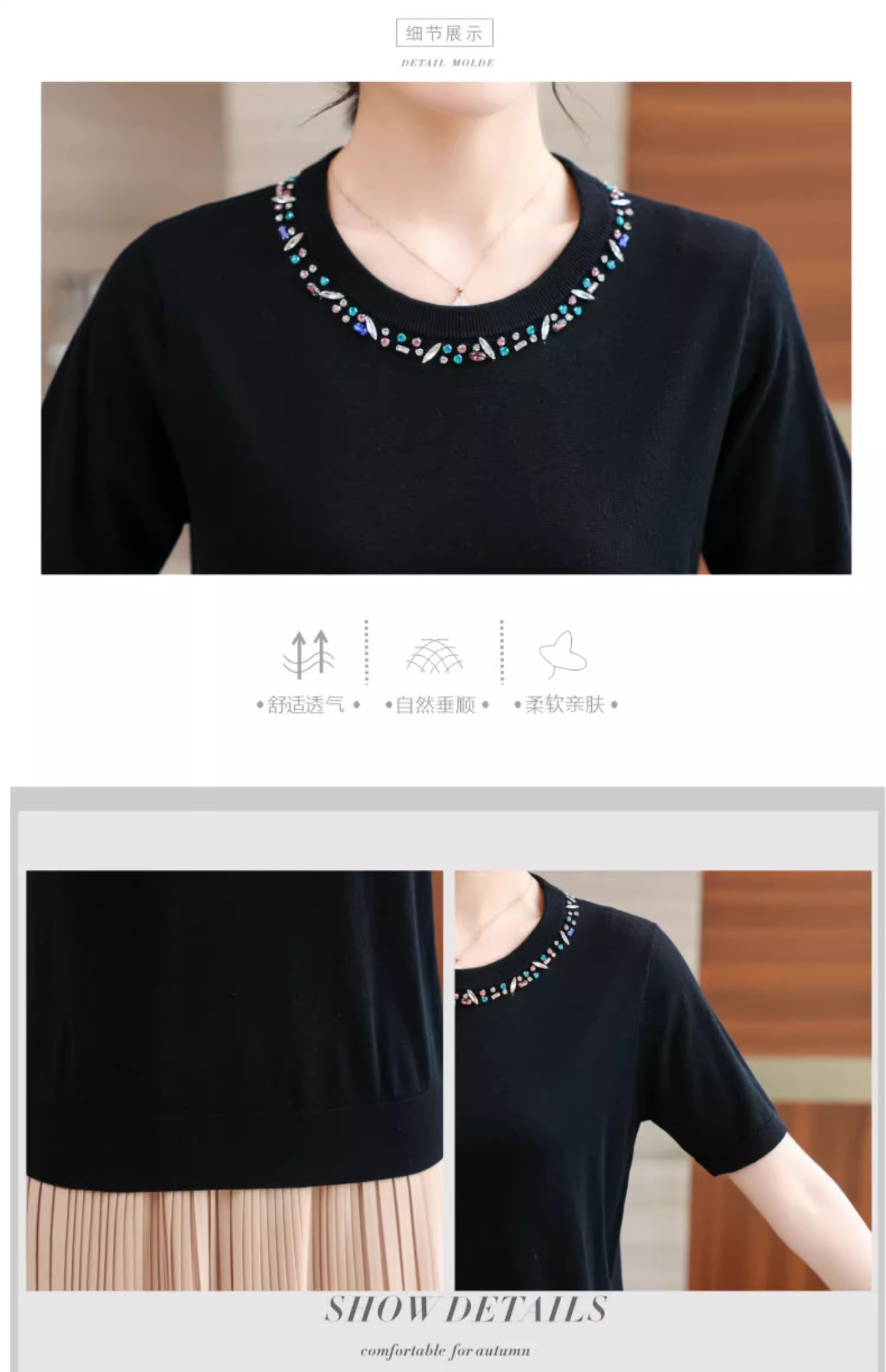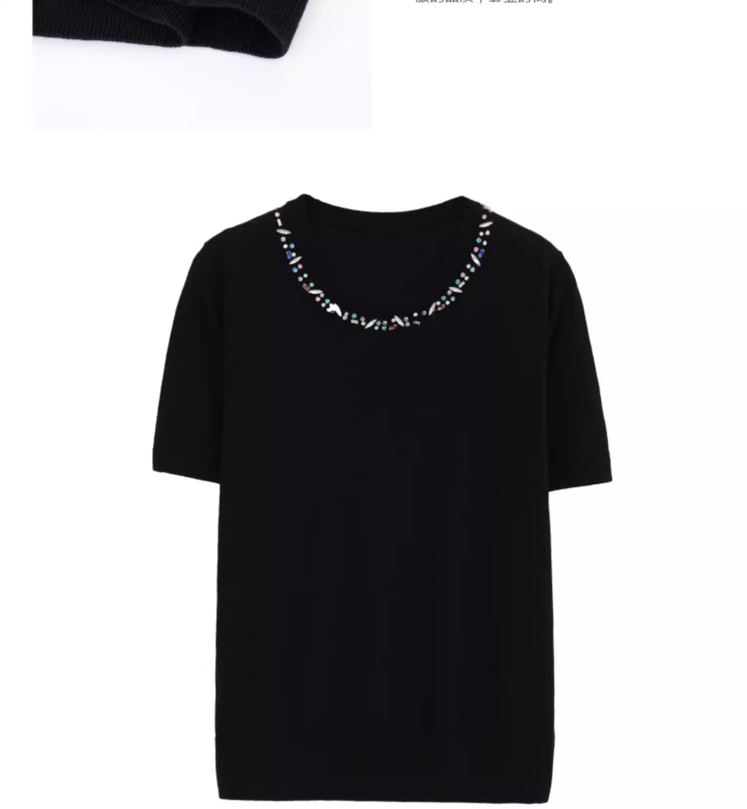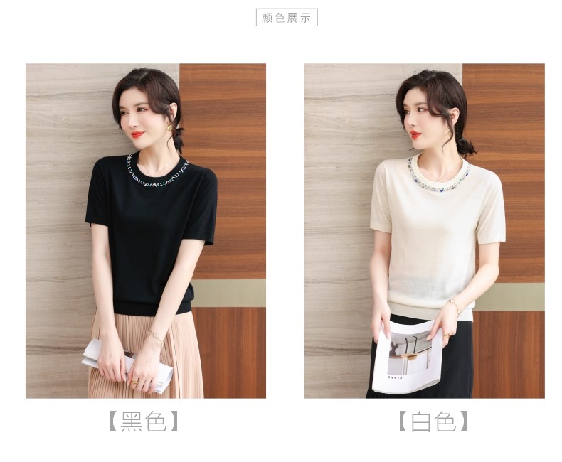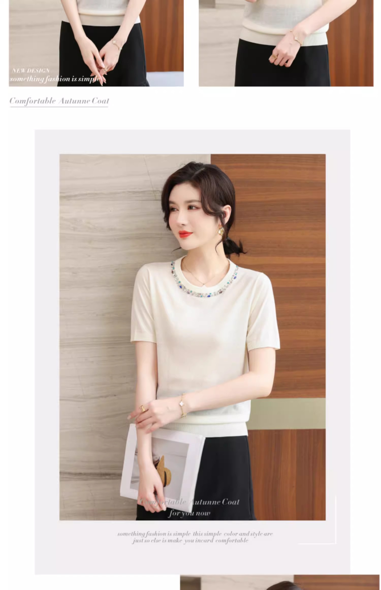 「老顾客开团福利」夏季冰丝针织短袖T恤2025夏季新款纯色重工钉珠圆领针织衫正肩显瘦上衣62442