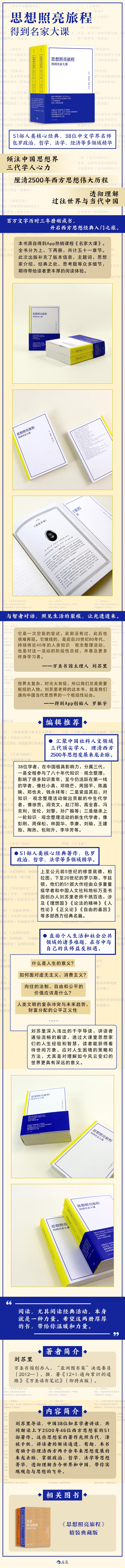 刘苏里导读,中国38位知名学者讲读,共同解读上下 2500 年46位西方思想家的 51 部著作。这些思想家的著作光照当代,泽被千秋,讲读者的解读通透、有趣,本书有助于你理清西方两千余年来思想发展的来龙去脉,掌握政治、哲学、法学等思想菁华,透彻理解当今世界和中国,带你实现观念与思想的飞升。