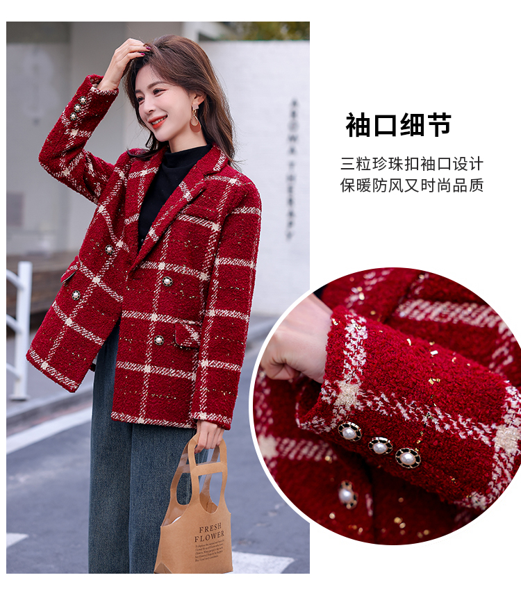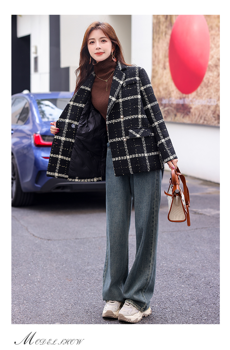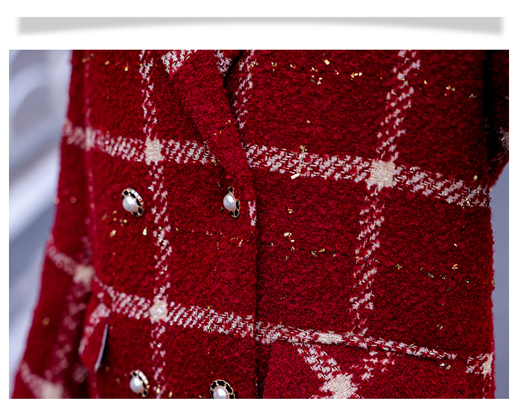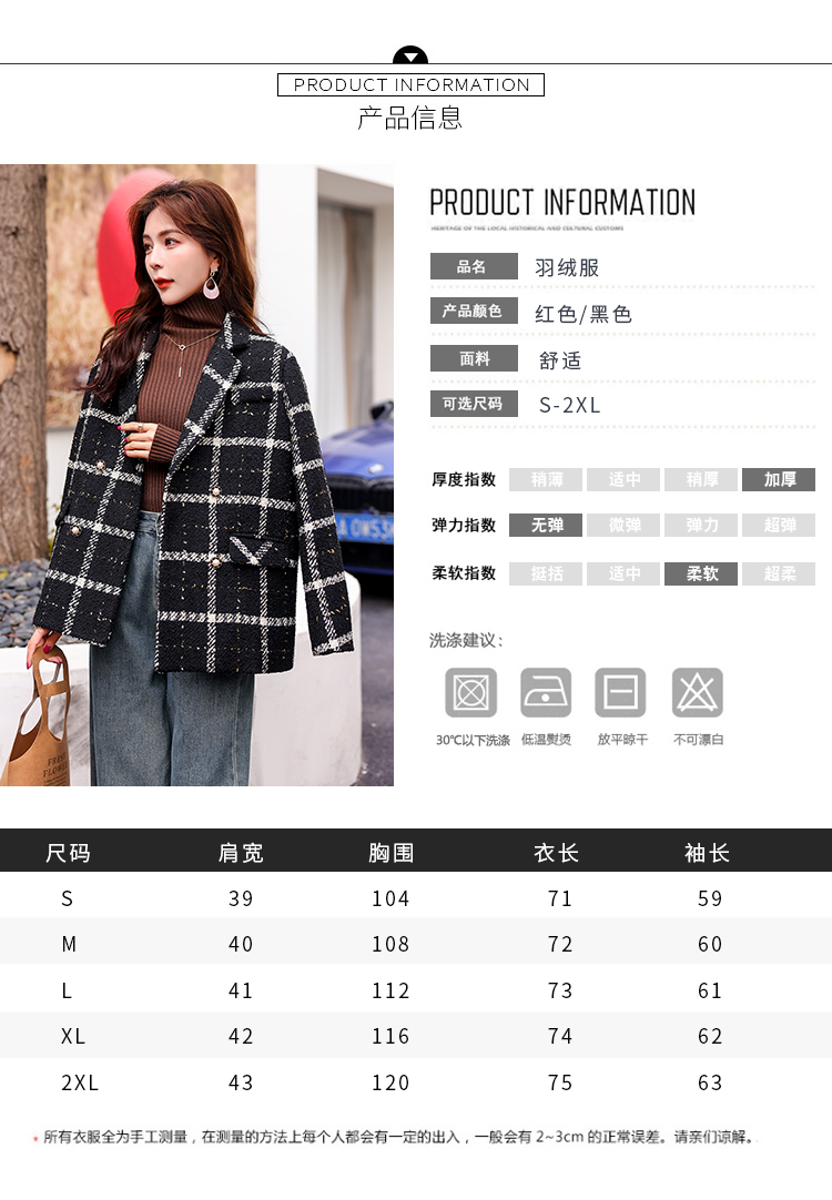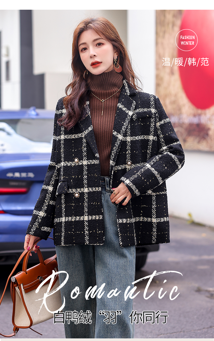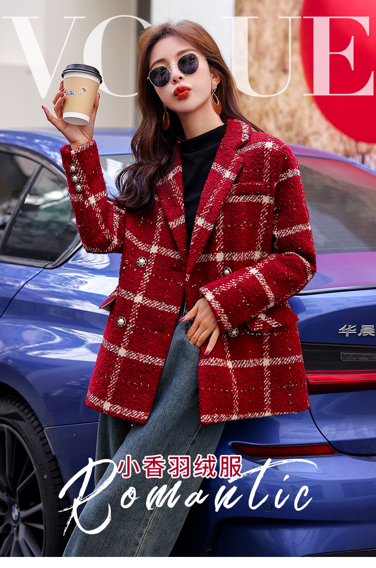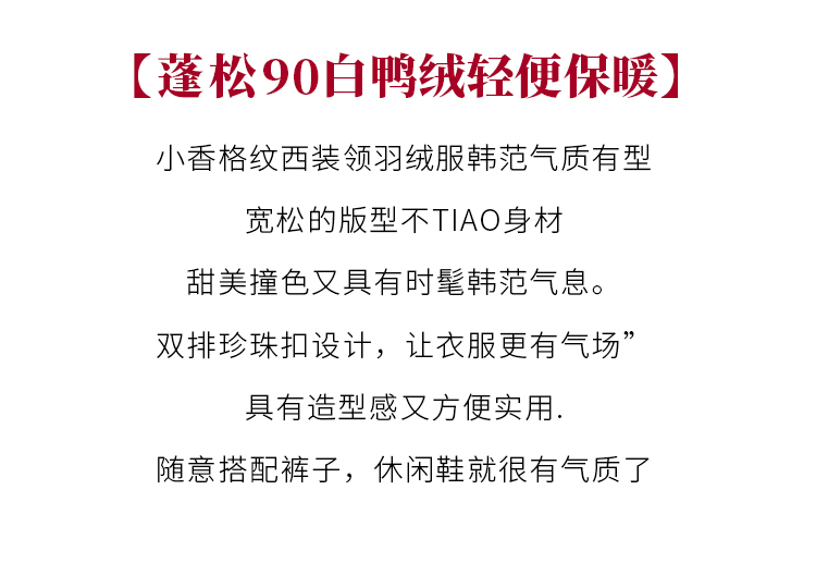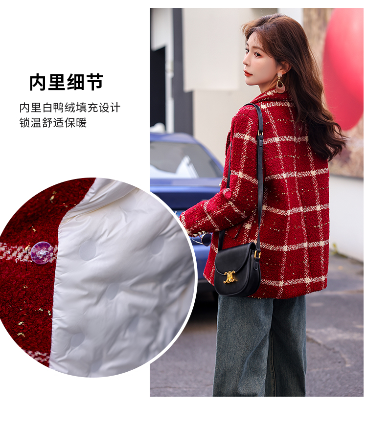冬季新款,小香风外套女气质粗花呢红格子加厚90白鸭绒羽绒服HR-MYL8205