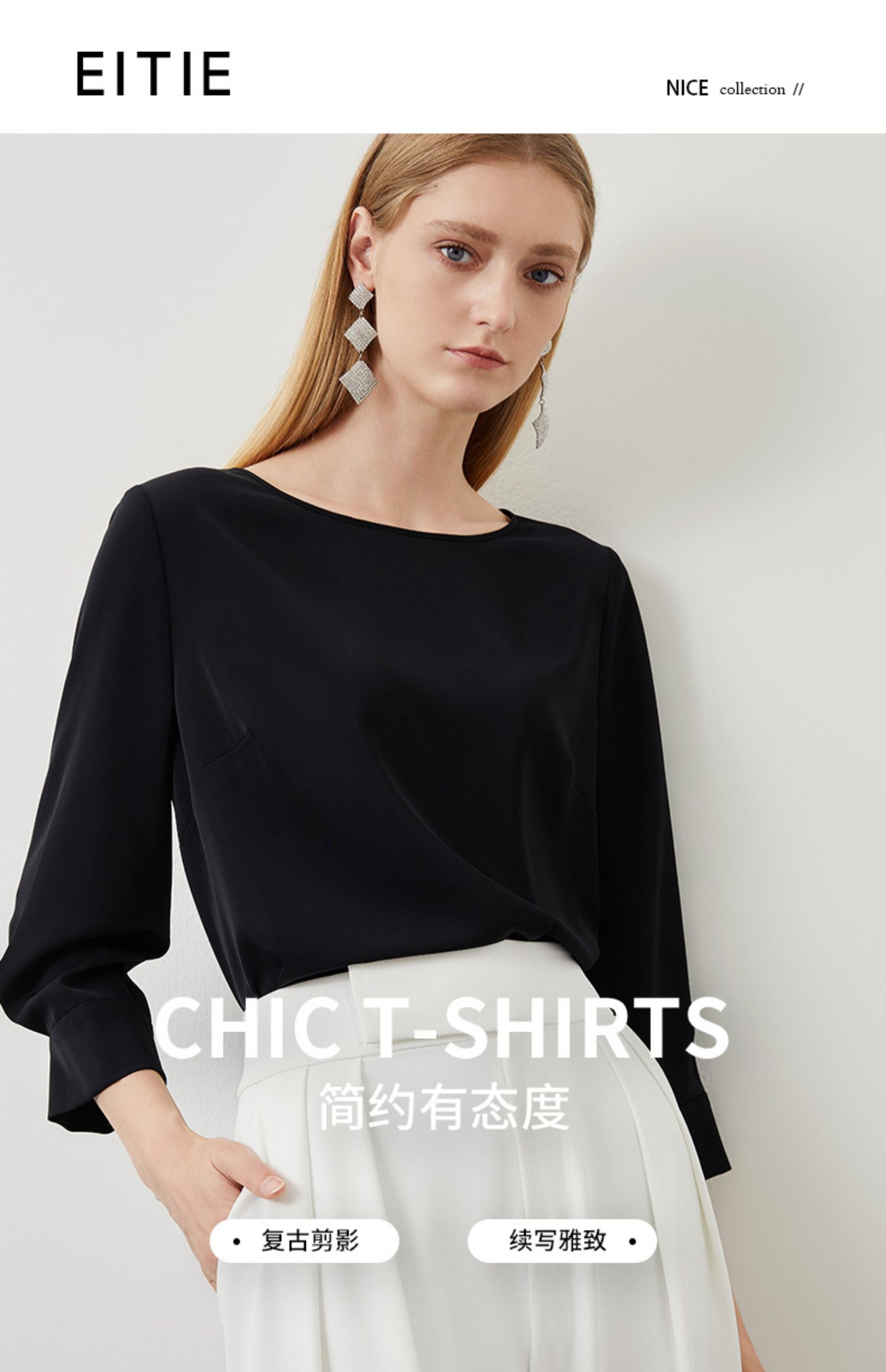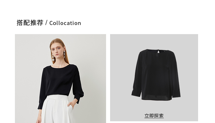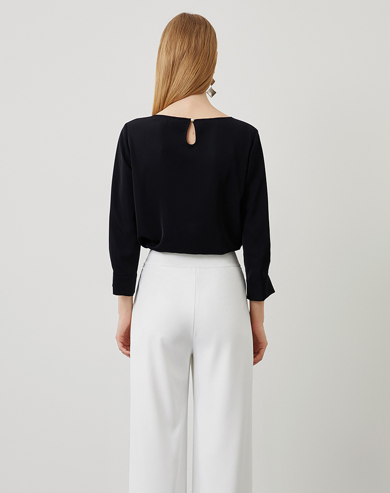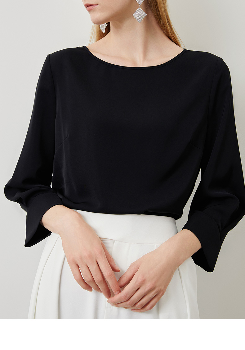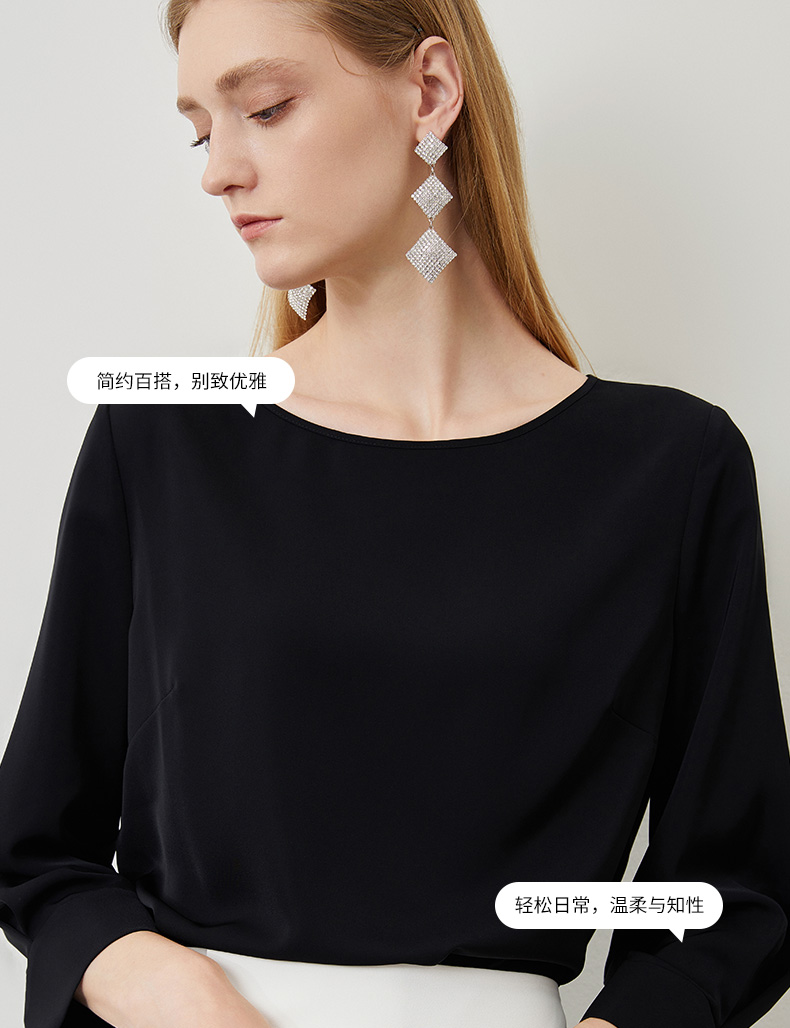EITIE爱特爱秋季新款气质百搭垂坠简约圆领通勤显瘦黑色上衣C2213010