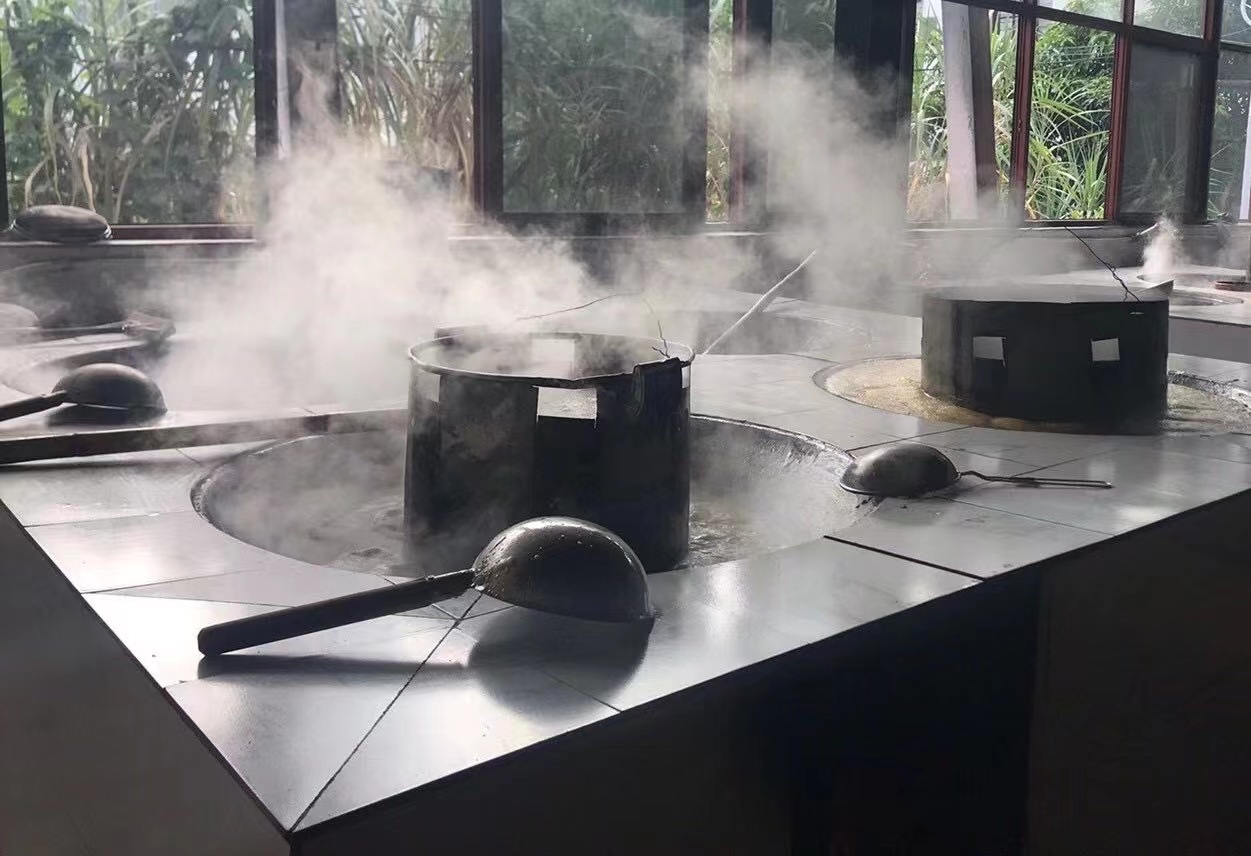 榨出的甘蔗汁通过一系列的过滤之后,倒入大锅,经开泡、赶水、过滤、舀瓢、打砂过程。过程中加入云南小黄姜粉。
