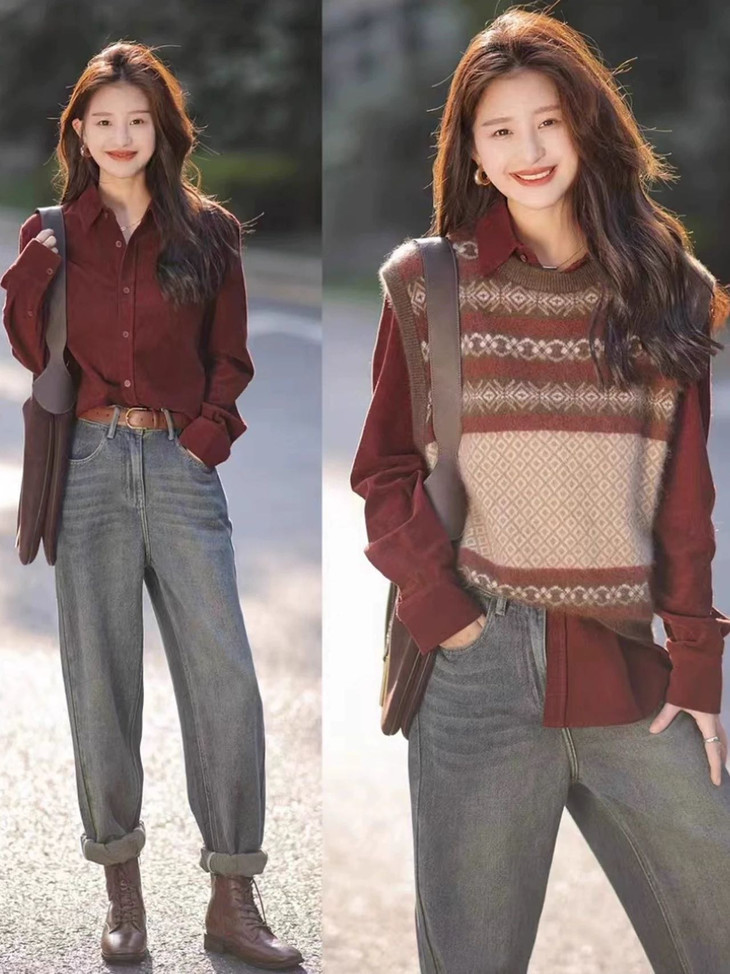 冬日里穿它,搭配蓝色牛仔裤,经典红蓝组合,将复古感与时髦感巧妙结合,打破沉闷,显白又高级。