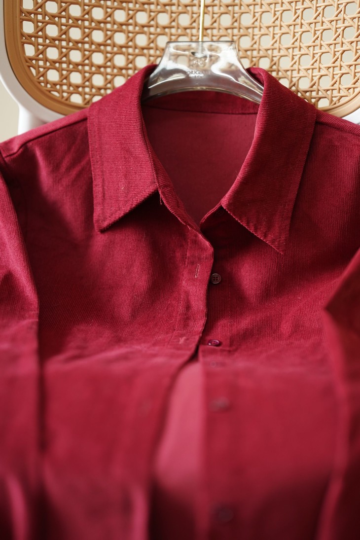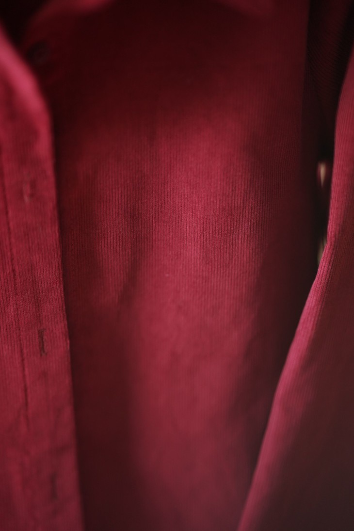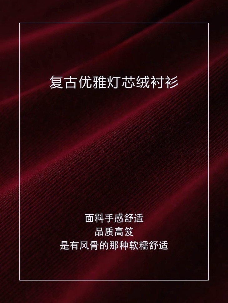 这款酒红衬衫选用的是高密细条灯芯绒面料