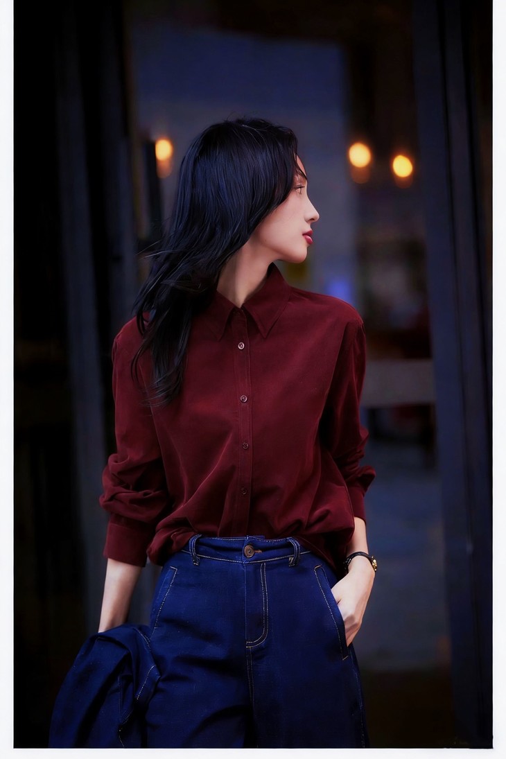 而且酒红色的包容性极强,搭配黑色、藏青、牛仔蓝都不会出错