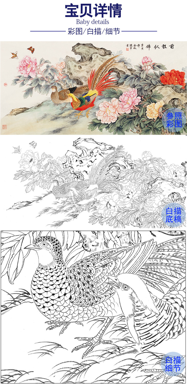陈军横幅工笔花鸟白描底稿-锦鸡花鸡图-多种白描尺寸可选 CJ43