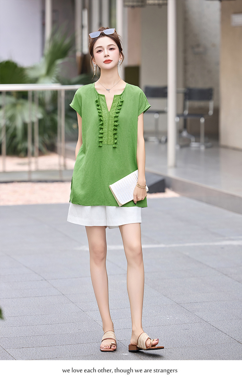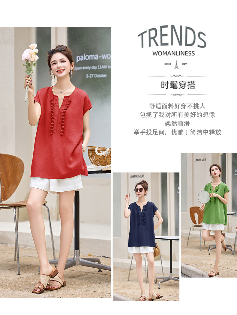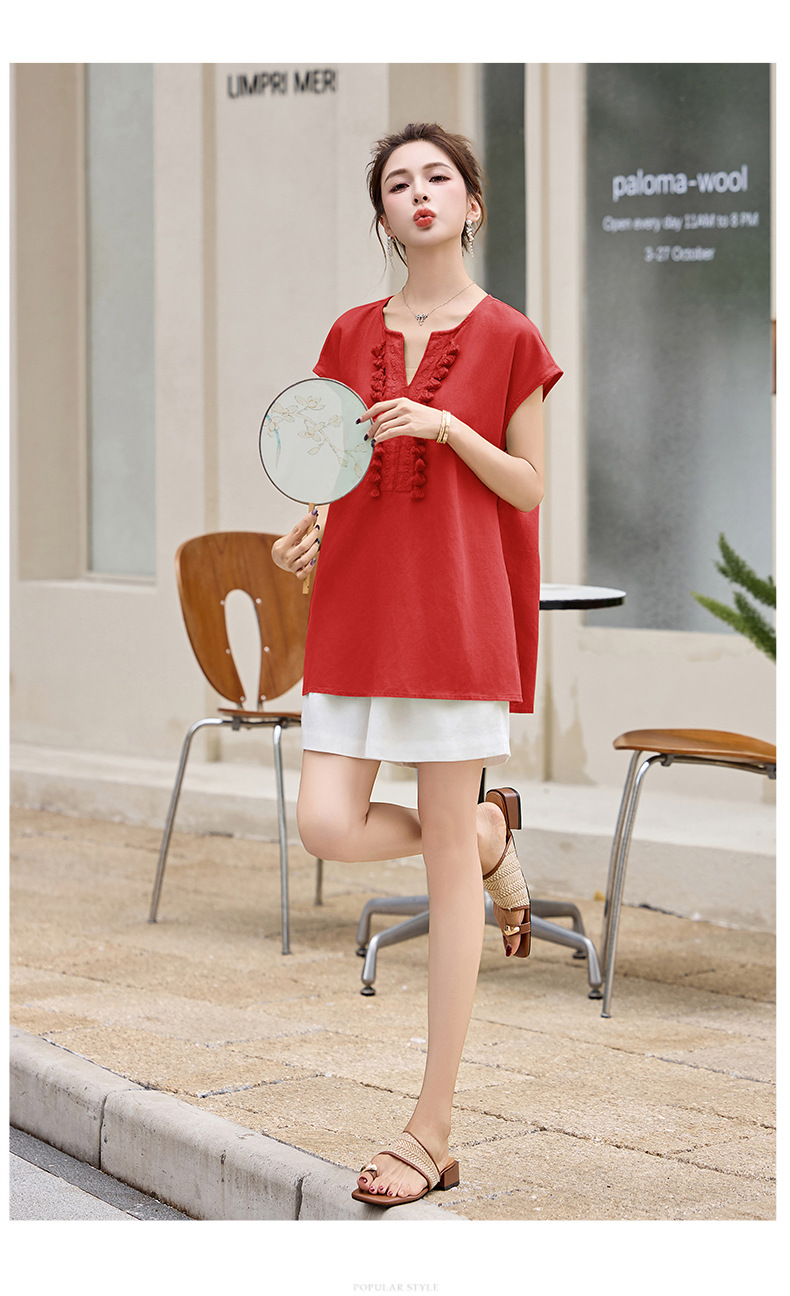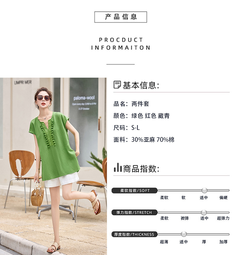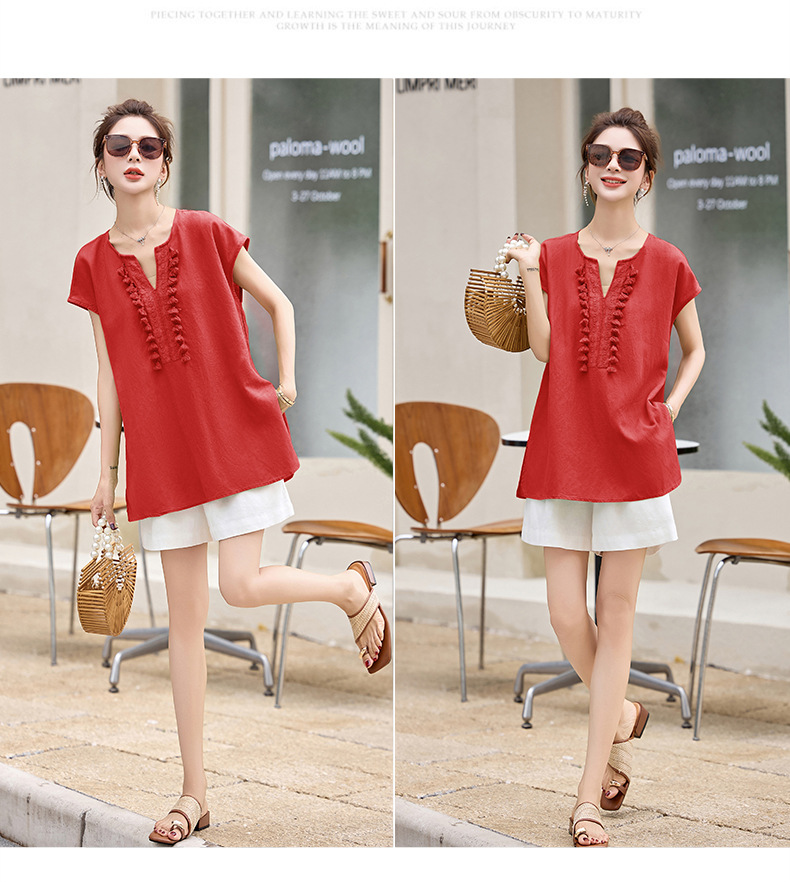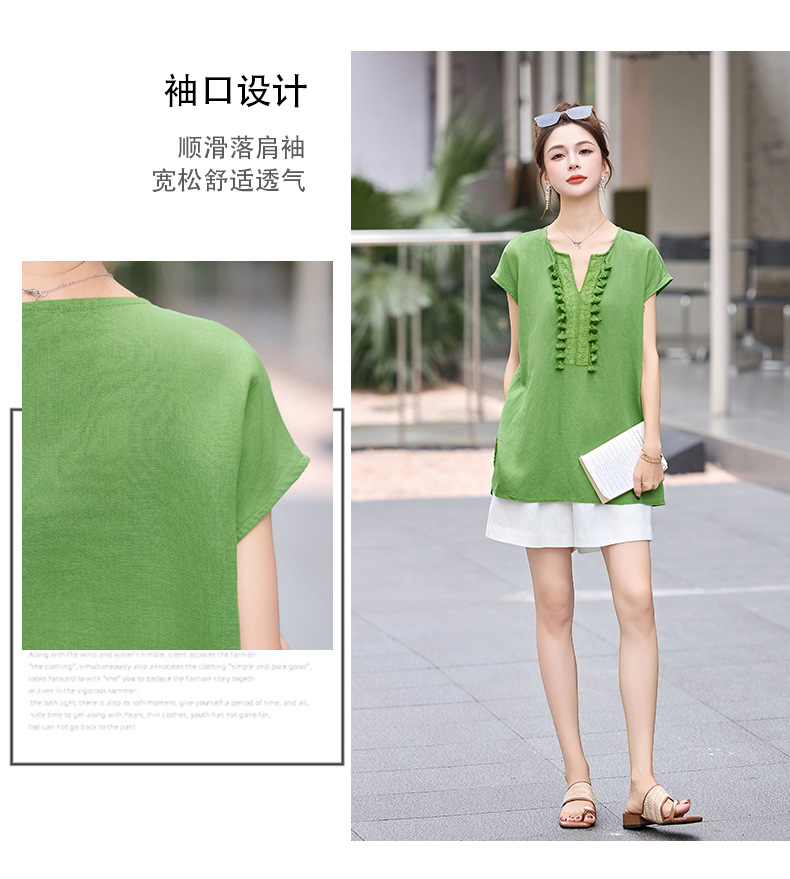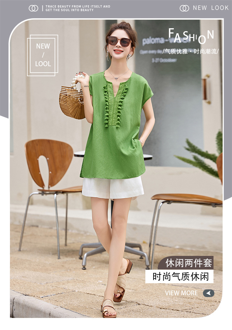 EHJY5090时尚棉麻短裤套装女2025夏季新款宽松气质V领流苏刺绣上衣两件套