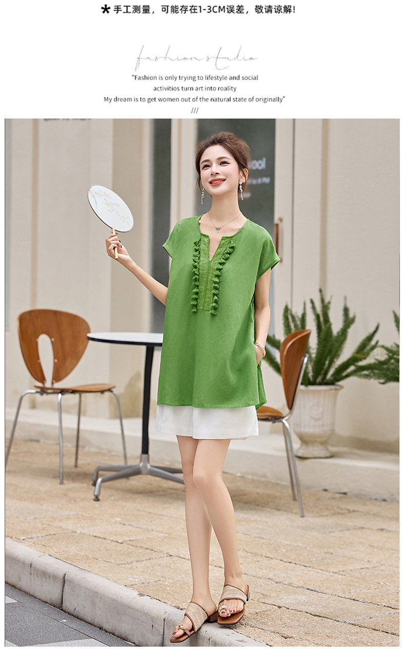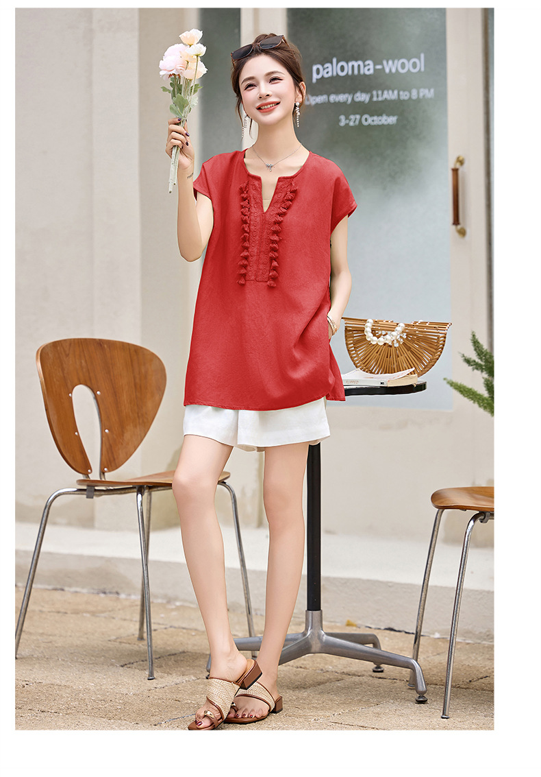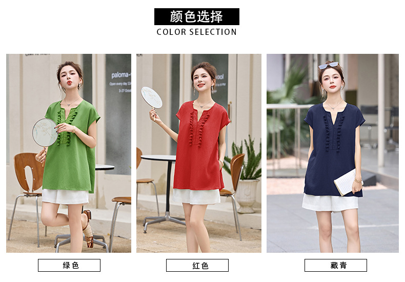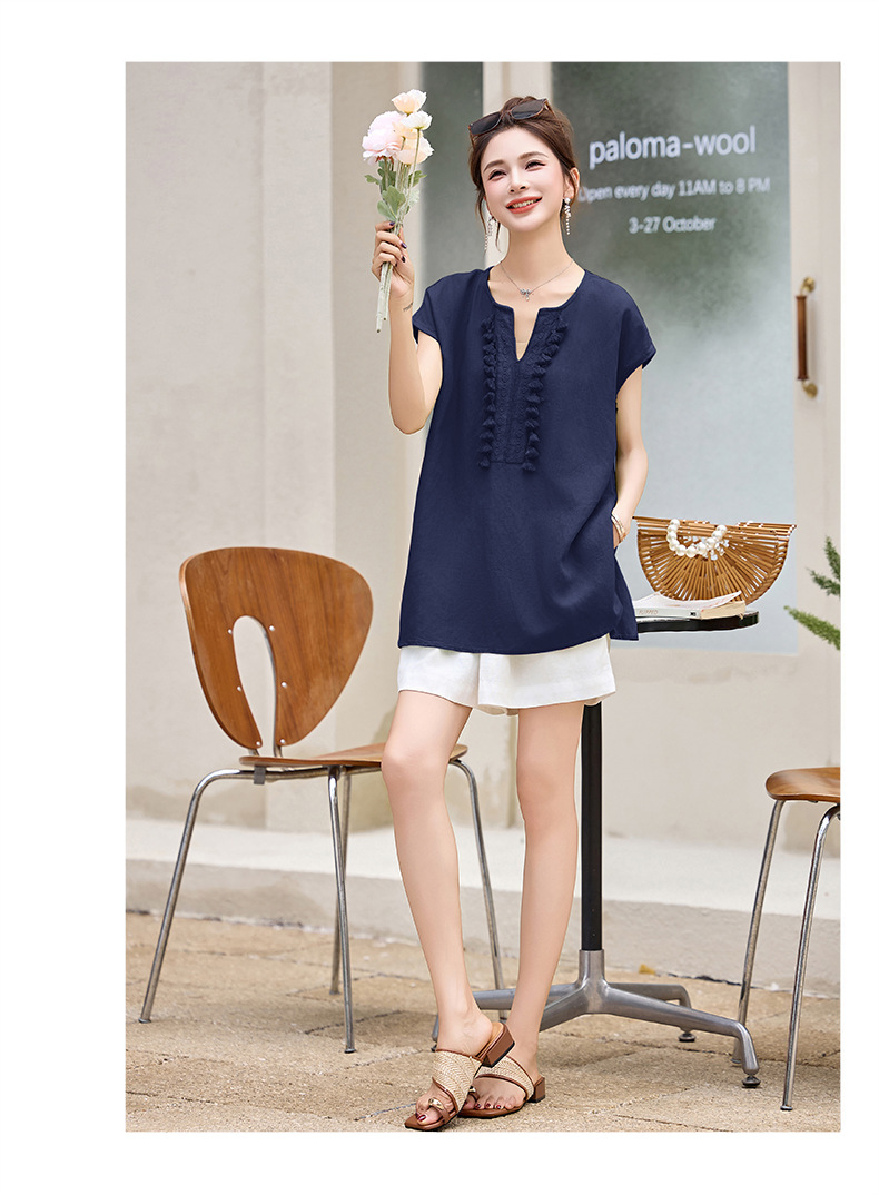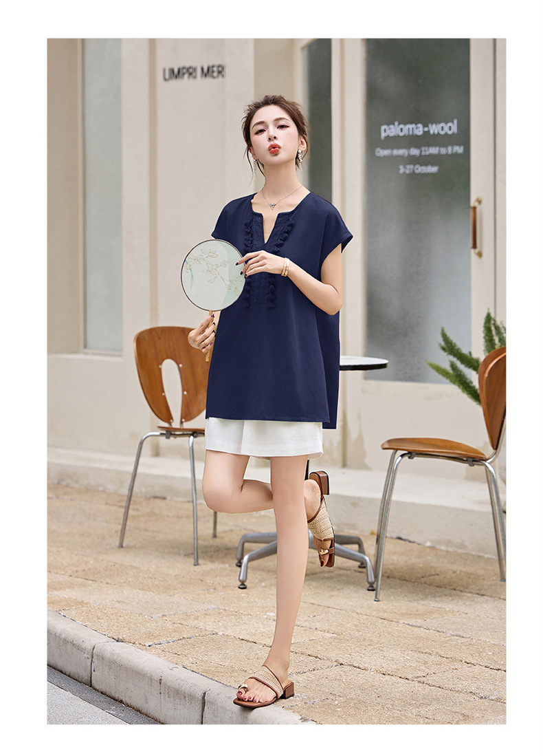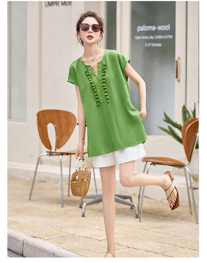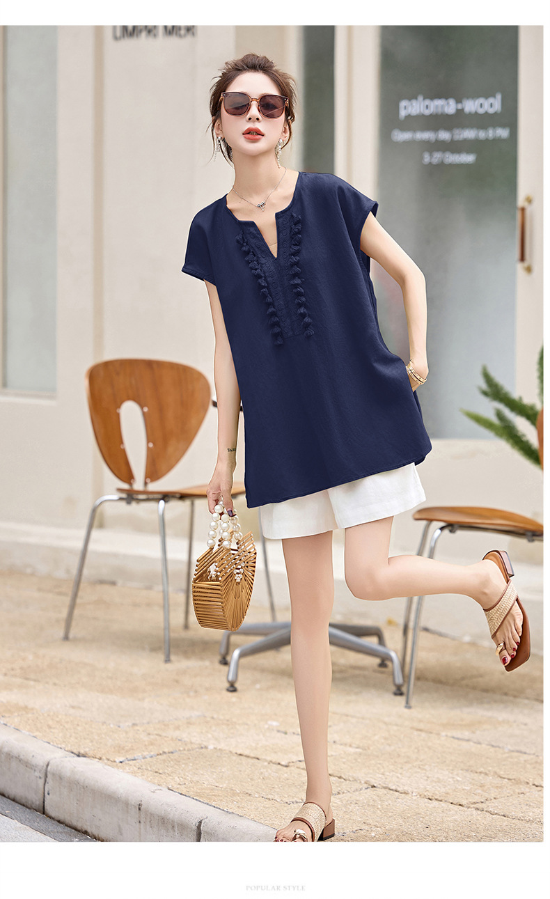 EHJY5090时尚棉麻短裤套装女2025夏季新款宽松气质V领流苏刺绣上衣两件套