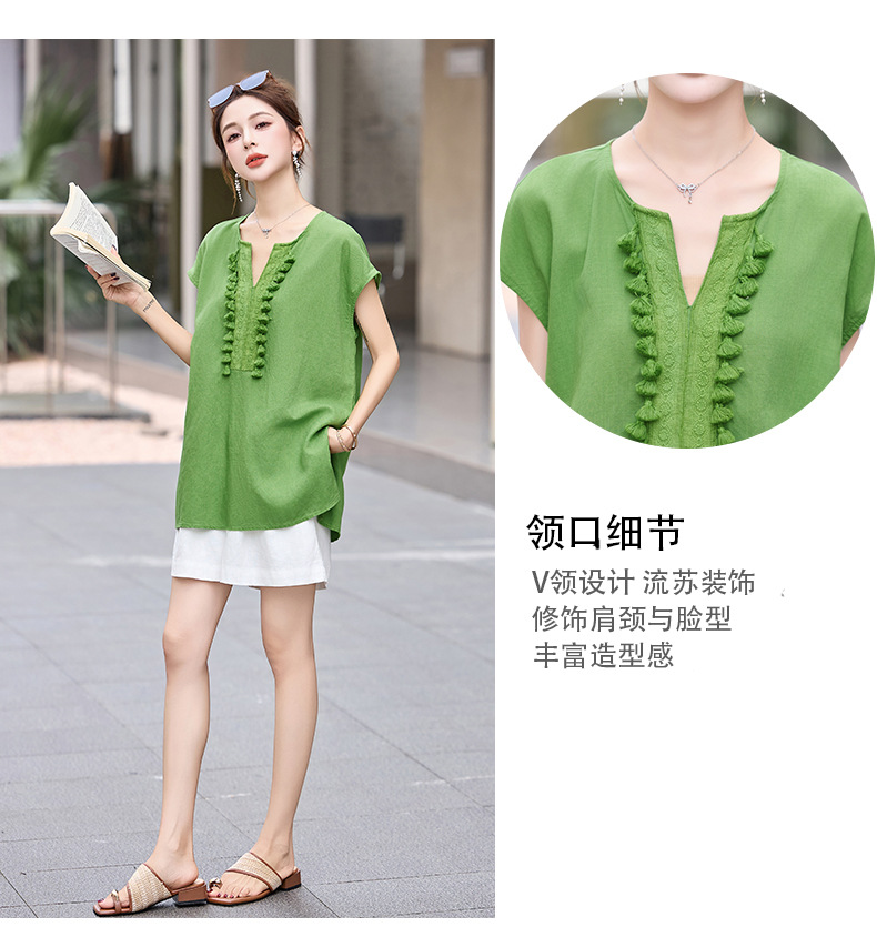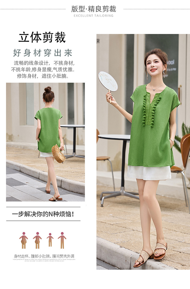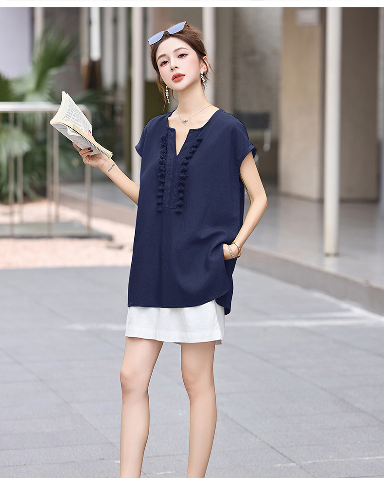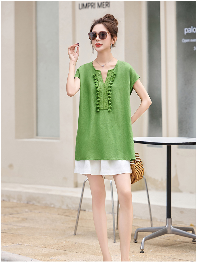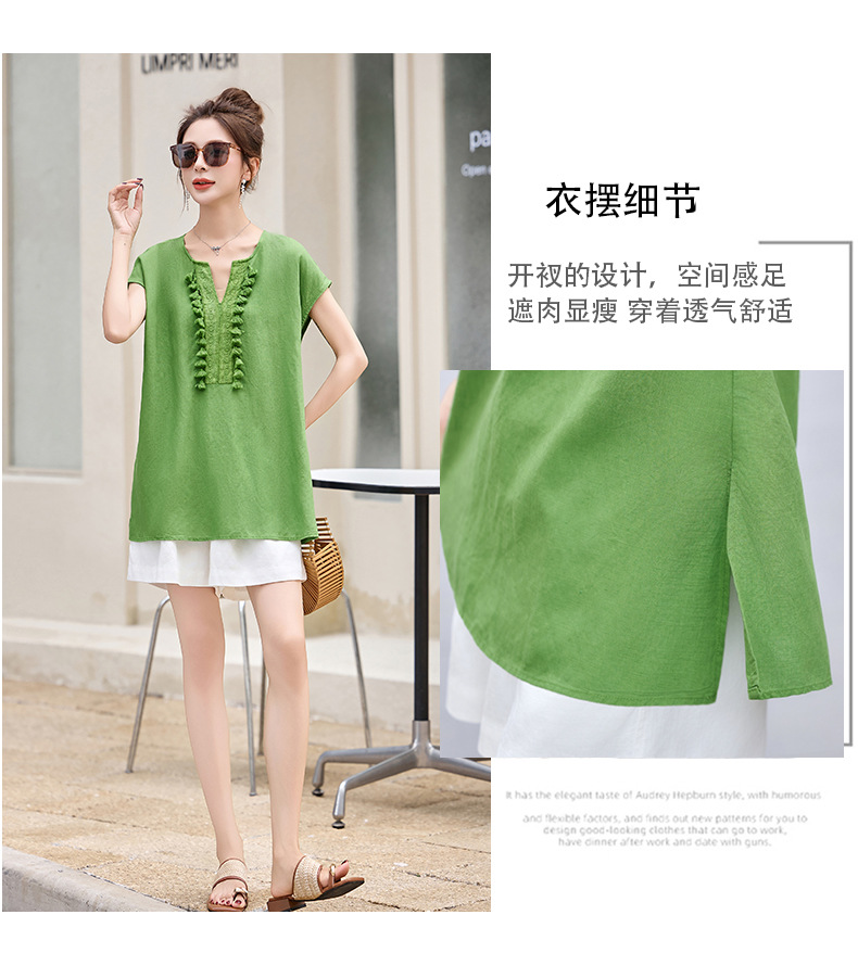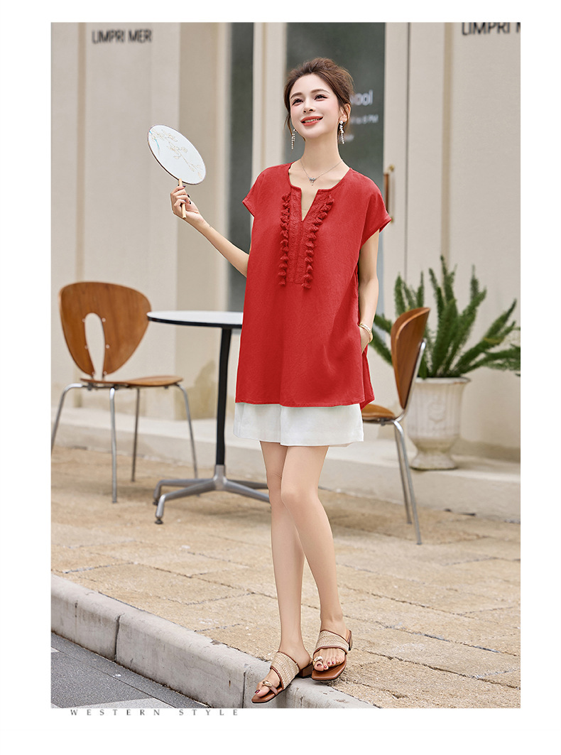 EHJY5090时尚棉麻短裤套装女2025夏季新款宽松气质V领流苏刺绣上衣两件套
