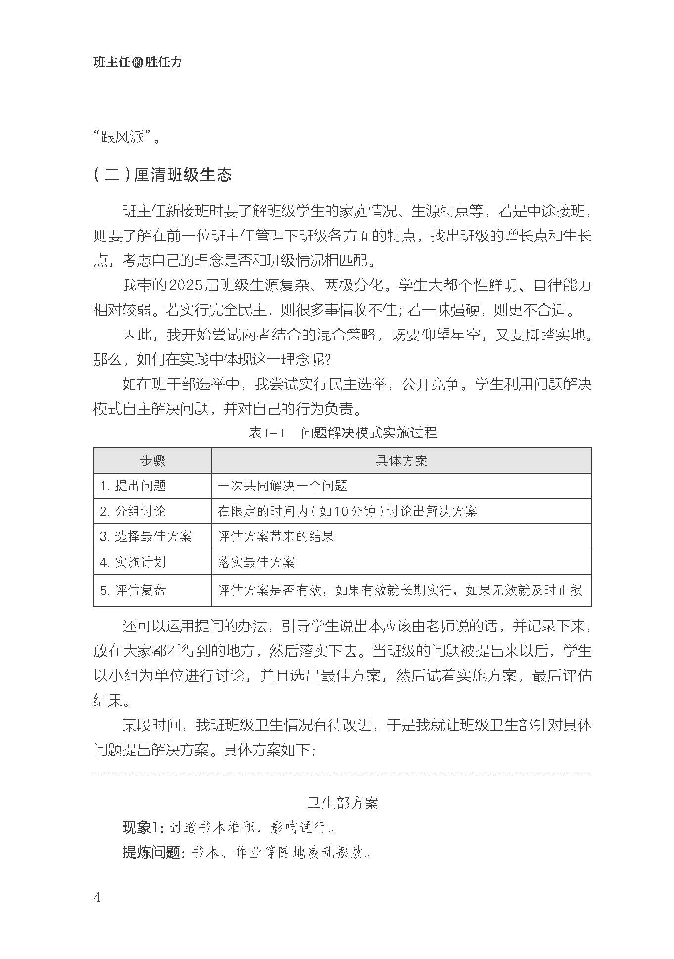 本书以一线教育者的实战智慧为根基,将心理学前沿理论转化为可操作的“问题解决脚本”,为班主任提供一套模块化、系统化的破局方案。通过四大胜任力——班级规划力、系统思考力、专业领导力、幸福创造力,帮助班主任从“被动应对”转向“主动设计”,构建可持续的班级管理生态。