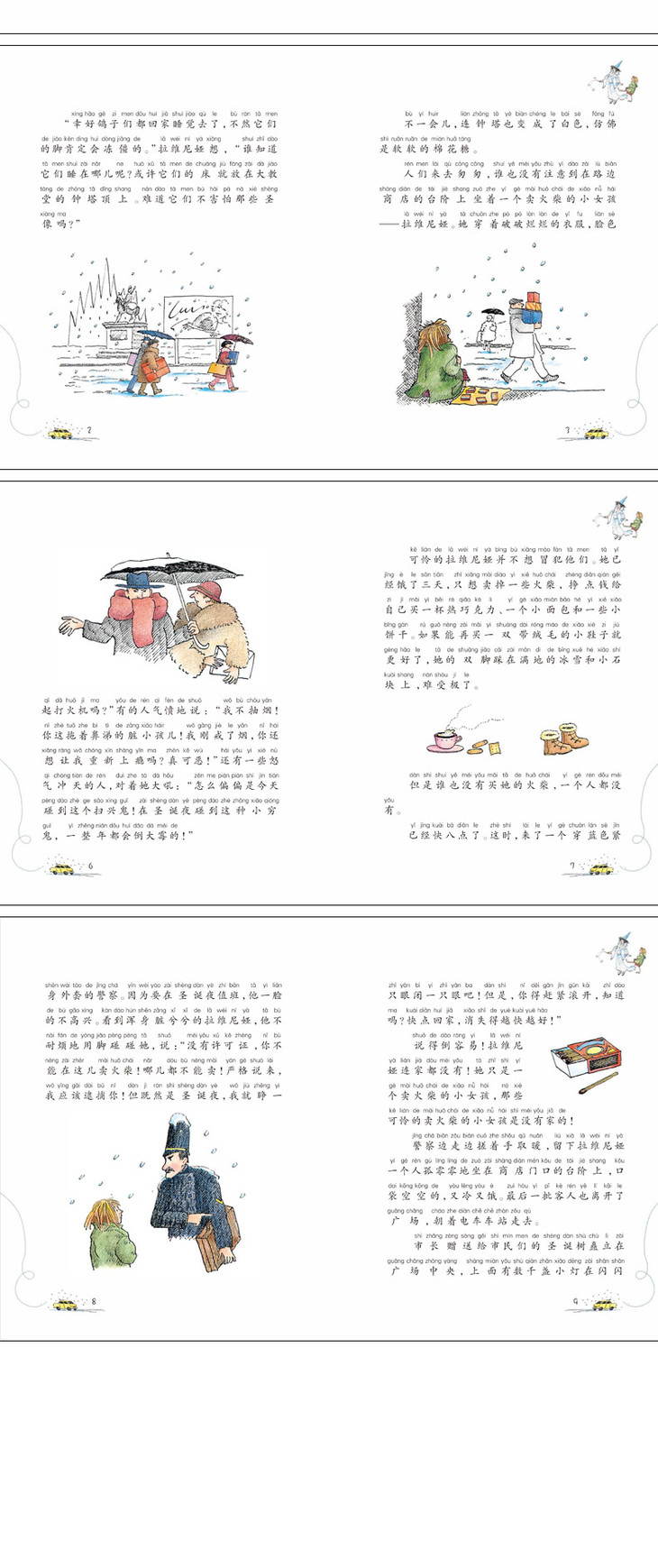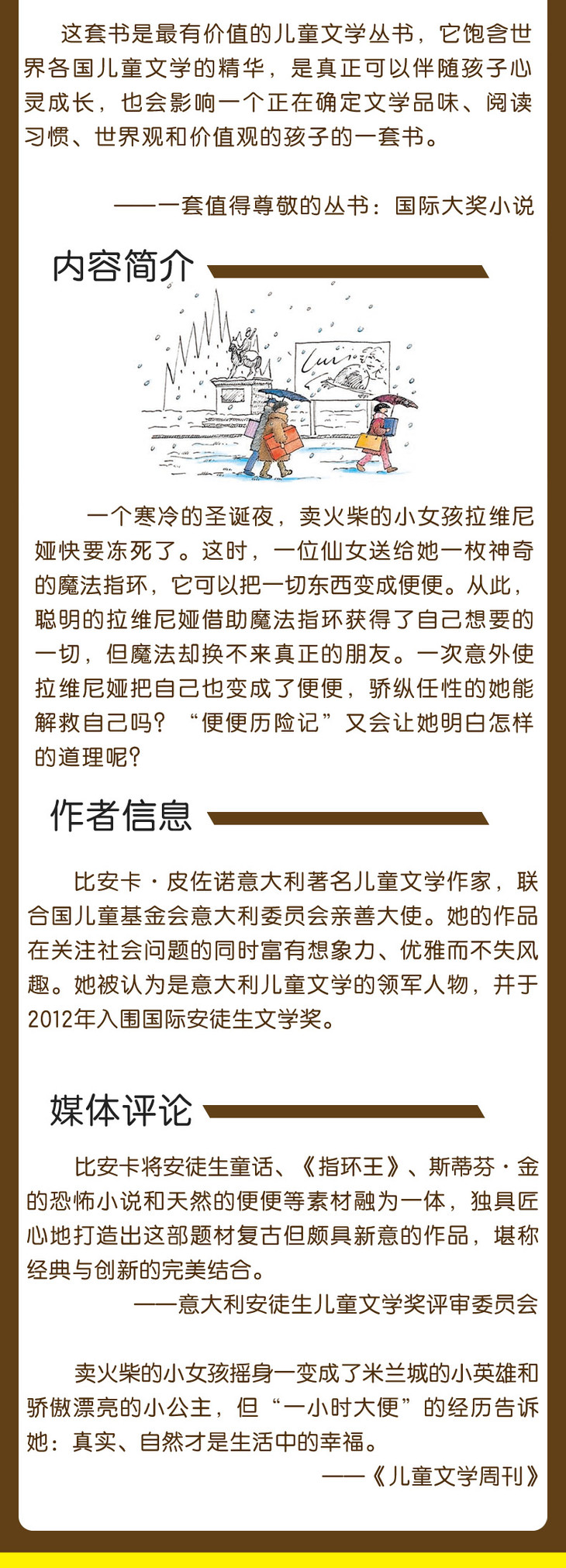 午夜时分,拉维尼娅的美梦被一阵刺耳的刹车声吵醒了。她抬起头,看到面前停了一辆出租车,一位漂亮的女士从里面走了出来。在如此寒冷的夜晚,那位女士穿得真是太少了:一件纱一样薄的天蓝色礼服,一双天鹅绒做的女士便鞋,还有她的头上……拉维尼娅简直要捂住嘴巴才能忍住不笑出声来。那位女士的头上戴着一顶奇怪的帽子,奇怪得令人难以想象:仿佛是一只长长的倒立的漏斗,装饰得就像一棵圣诞树!“真是一个疯子,太好笑了。”拉维尼娅心想。既然已经醒了,她打算继续看下去。那位女士把车费递给出租车司机,司机竟然深深地鞠了五次躬,一个接着一个。可想而知,这是多大的一笔钱。然后,那位女士朝着拉维尼娅走来。拉维尼娅心里开始祈祷:让她买了我所有的火柴吧!但是,那位女士只是停在拉维尼娅面前,掏出一支香烟,弯下腰来问道:“对不起,可以借个火吗?”“什么,她对我说什么?”拉维尼娅失望地想,“我当然有,但是我应该问她要钱吗?这样似乎太过分了,她只要一根就够了。好吧,我可以给她一根。”就这样,拉维尼娅点了点头,打开一盒崭新的火柴,点燃一根,递给了面前的女士。那位女士就像点蜡烛一样点燃香烟,从香烟里散发出一道道光芒,仿佛一个小小的烟火。“真是疯了!”拉维尼娅心想,“难道在圣诞节没有其他事情可做了吗?难道她不用回家吃饭睡觉吗?穿得这么单薄,她会生病的!”拉维尼娅鼓足勇气问道:“对不起,小姐,您是要去化妆舞会吗?” “不,为什么这么问?”陌生的女士回答道。 “那您为什么穿成这样呢?” “因为我是一个仙女啊!”陌生的女士说道,似乎这是再自然不过的事情了。 拉维尼娅心里又想:“真是疯了!仙女只出现在书里。”她好像看透了拉维尼娅的心思,回应道:“奇怪,通常卖火柴的小女孩也只出现在童话里。” 两个人互相看着,谁也不想被人捉弄。陌生的女士又对拉维尼娅说:“我的确是仙女。你要不要试试看让我捏你一下?”刚说完,她就伸手在拉维尼娅的手臂上捏了一下。 “哎呦!”拉维尼娅尖叫了一声说,“应该是我捏你才对!”她忍不住踢了女士一脚,但因为没穿鞋子,所以只是轻轻碰了一下。 “这样我们扯平了!”仙女冷静地说,“现在,我们都认同对方的存在了。拉维尼娅,刚刚你很善良慷慨,所以我打算补偿你。” “那你送我一大笔钱吧!”拉维尼娅在心里兴奋地大喊,“再把我送到一座宫殿里,让王子和我结婚……或者把我变成世界上美丽的人……不过变得漂亮有什么用呢?对了,大家都会想花钱来看我,还会给我买一大堆好吃的!” “我要送你一个特别的礼物。”仙女继续说,“一枚魔法指环!你看!” 她从礼服口袋里拿出一枚指环,套到拉维尼娅的手指上:那是一枚普普通通的指环,既不是金子做的,也没有镶宝石。 “这有什么用呢?”拉维尼娅满怀期望地问,心里祈祷它有某种特殊的功能。 仙女对着拉维尼娅笑了一笑。 “这有什么用?”拉维尼娅又问道。 “它可以把所有东西变成大便。” “什么?” “它可以把所有东西变成大便。你没听见吗?”仙女露出一个天使般的笑容。