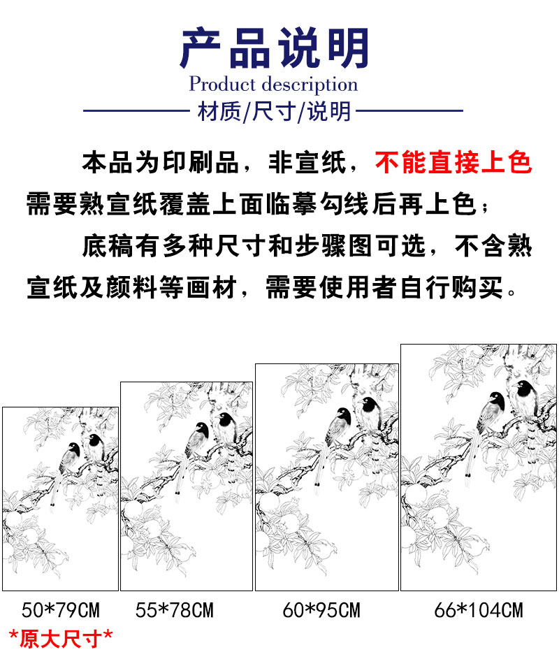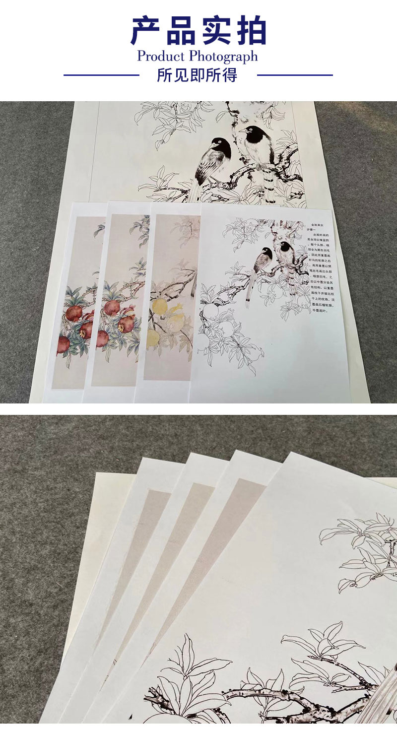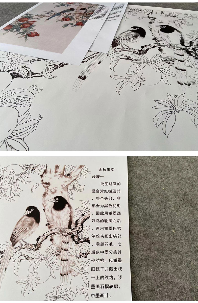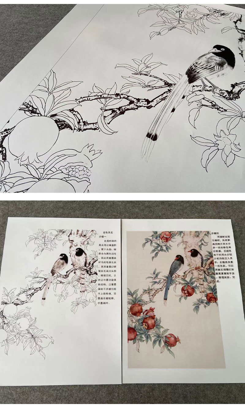 【有步骤】陈军工笔画白描底稿《金秋果实》石榴蓝鹊初学者临摹花鸟线稿CJ08