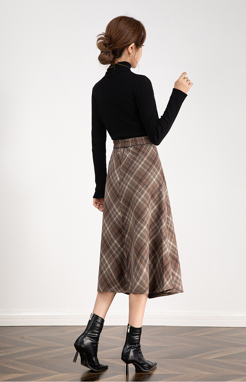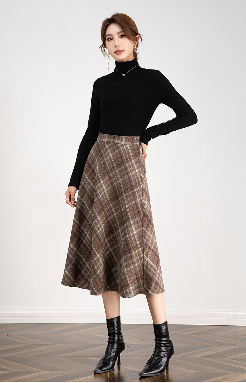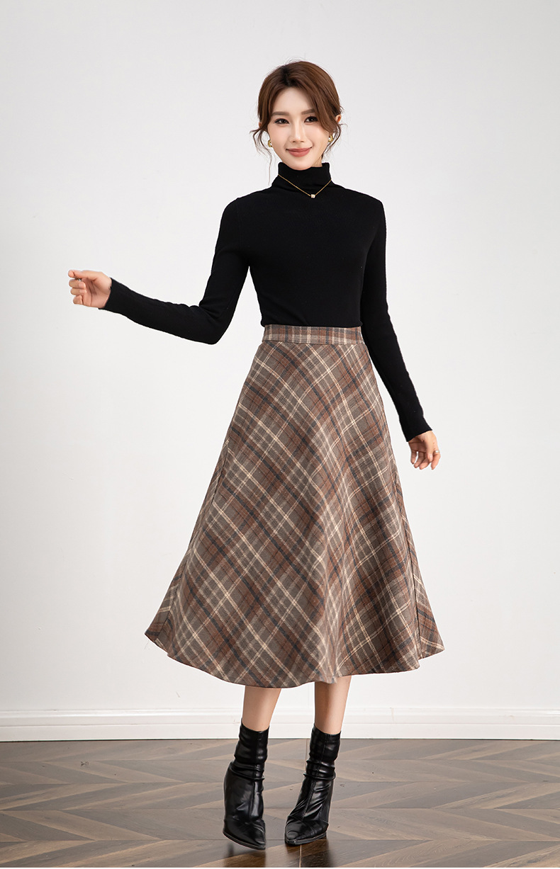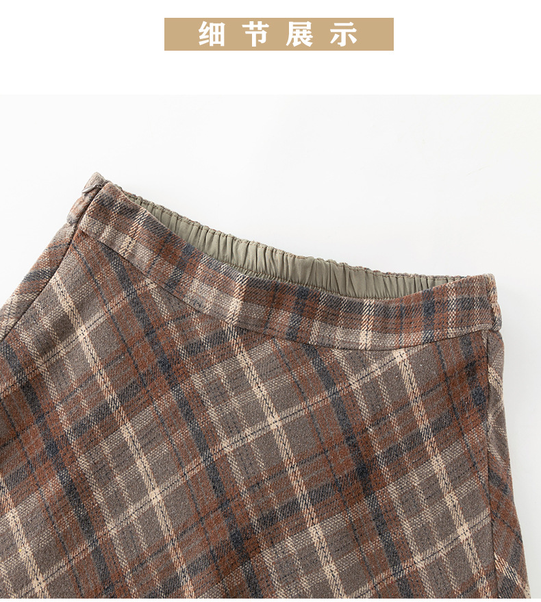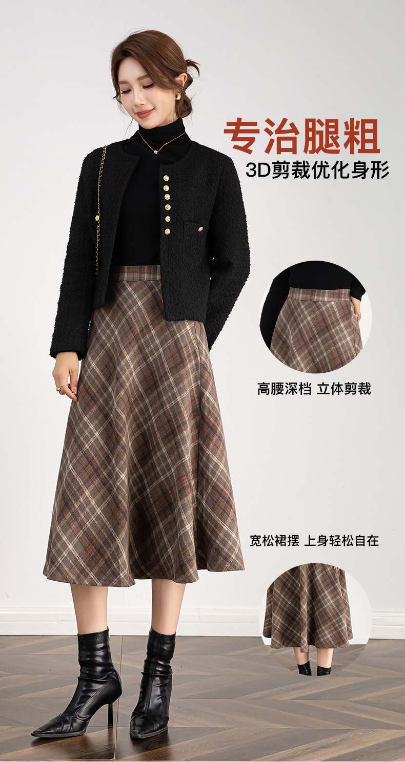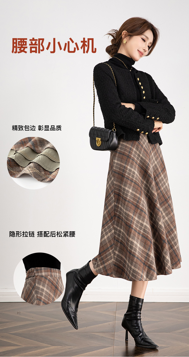百媚生 高腰毛呢格子半身裙女冬季加厚保暖中长裙韩版宽松伞裙W3757