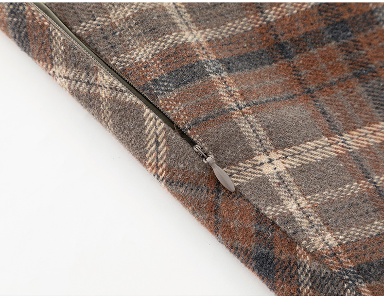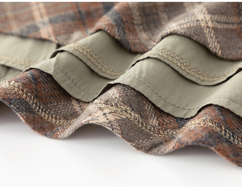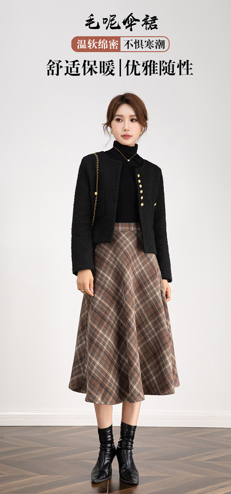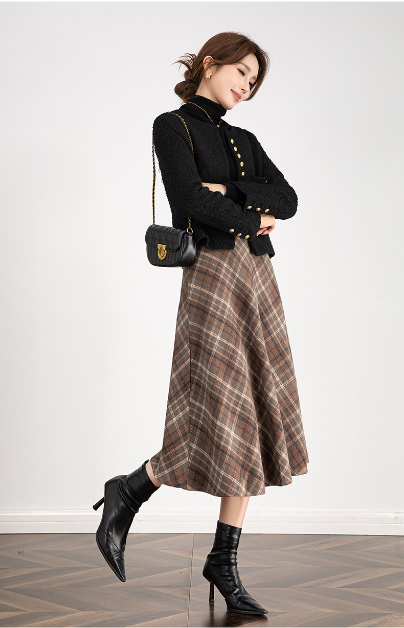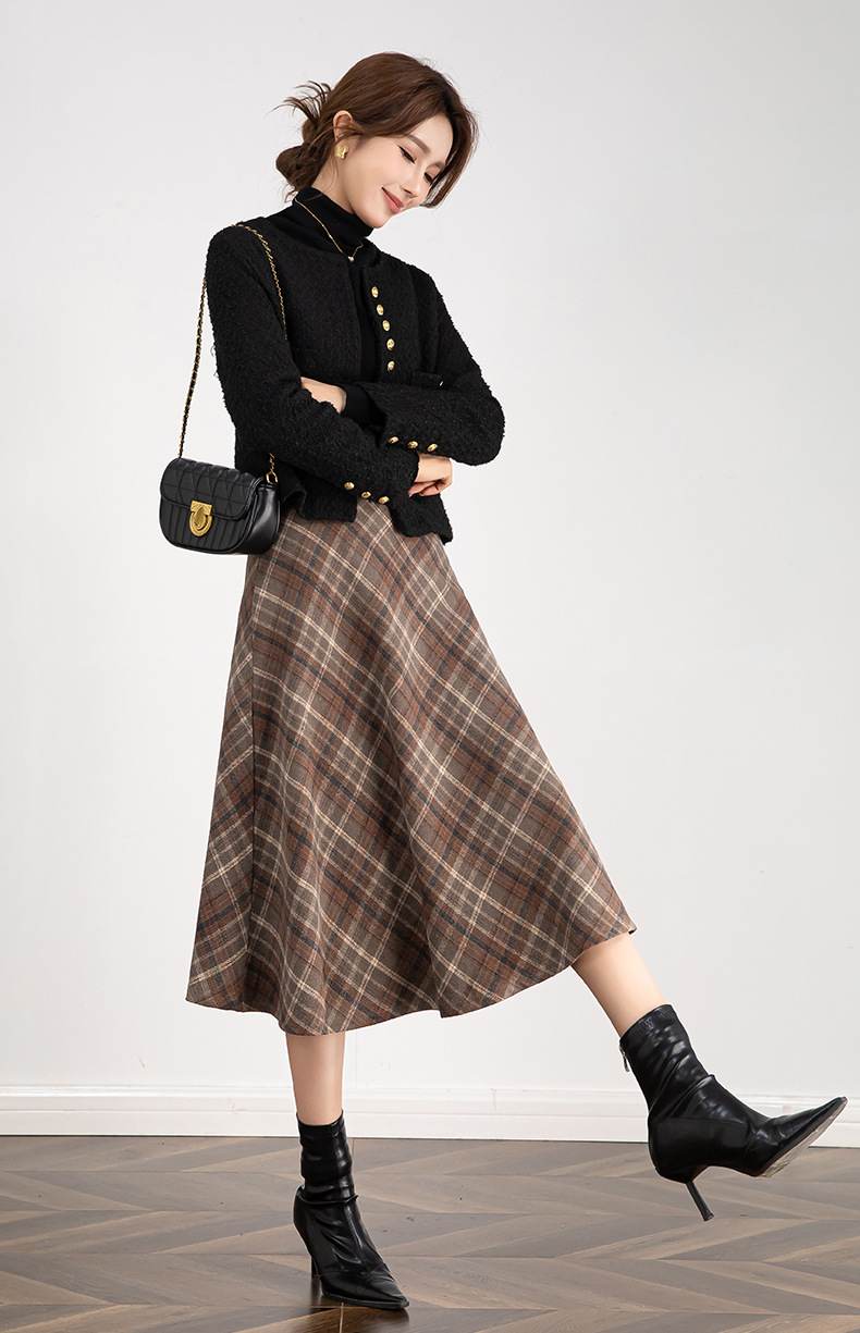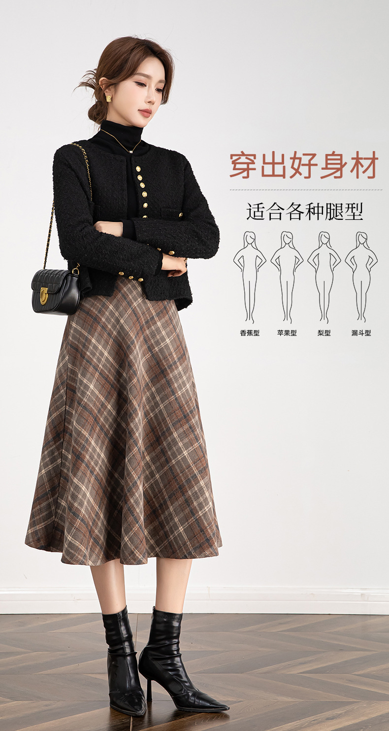 百媚生 高腰毛呢格子半身裙女冬季加厚保暖中长裙韩版宽松伞裙W3757