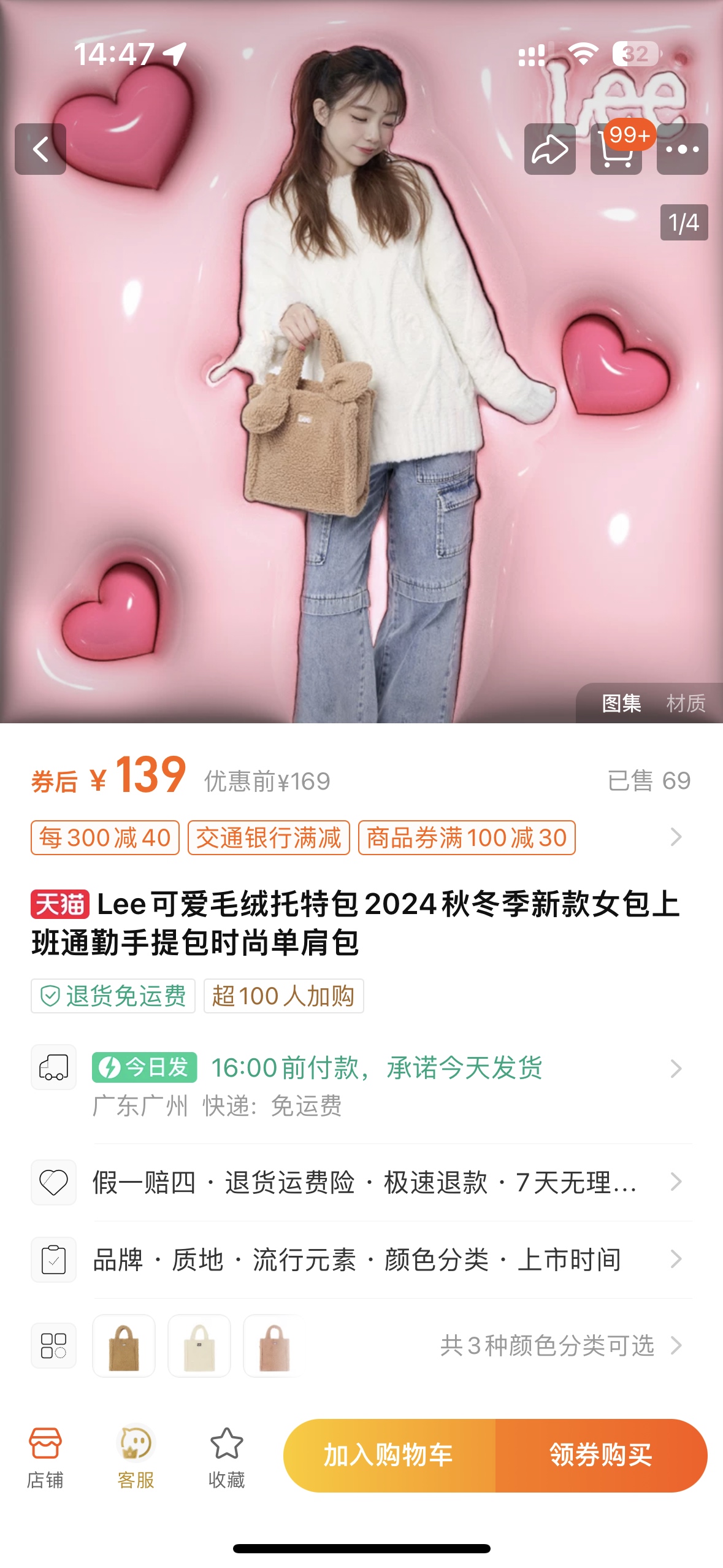 一秒变萌妹,甜到发腻~容量也非常OK! 可以手提单肩😎,可爱万岁🏳 还考虑啥!早买早享受‼。毕竟价格很实惠啊!!!官网都要139元!!!!