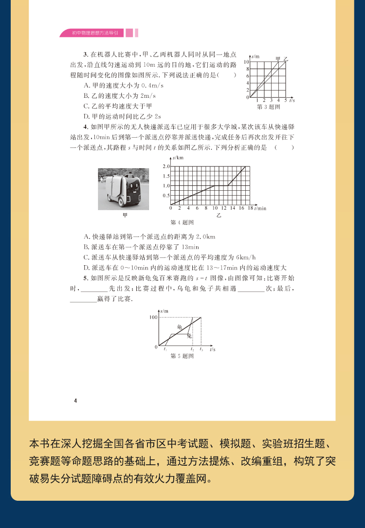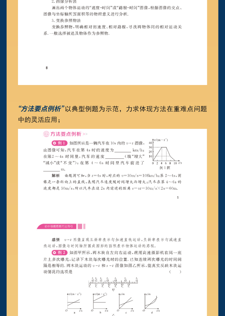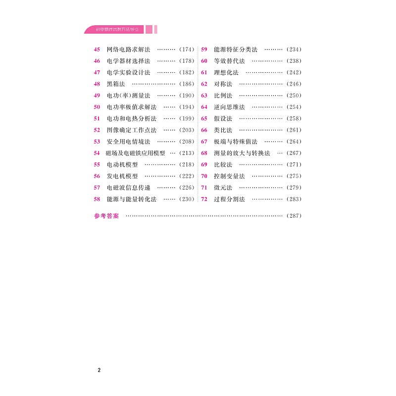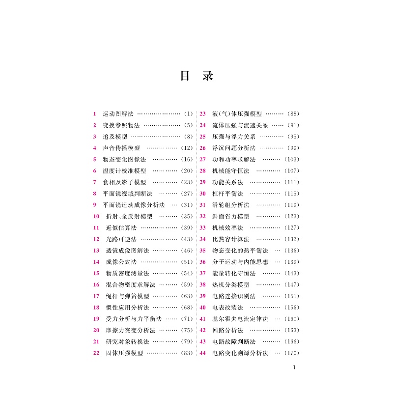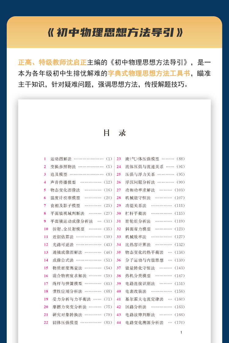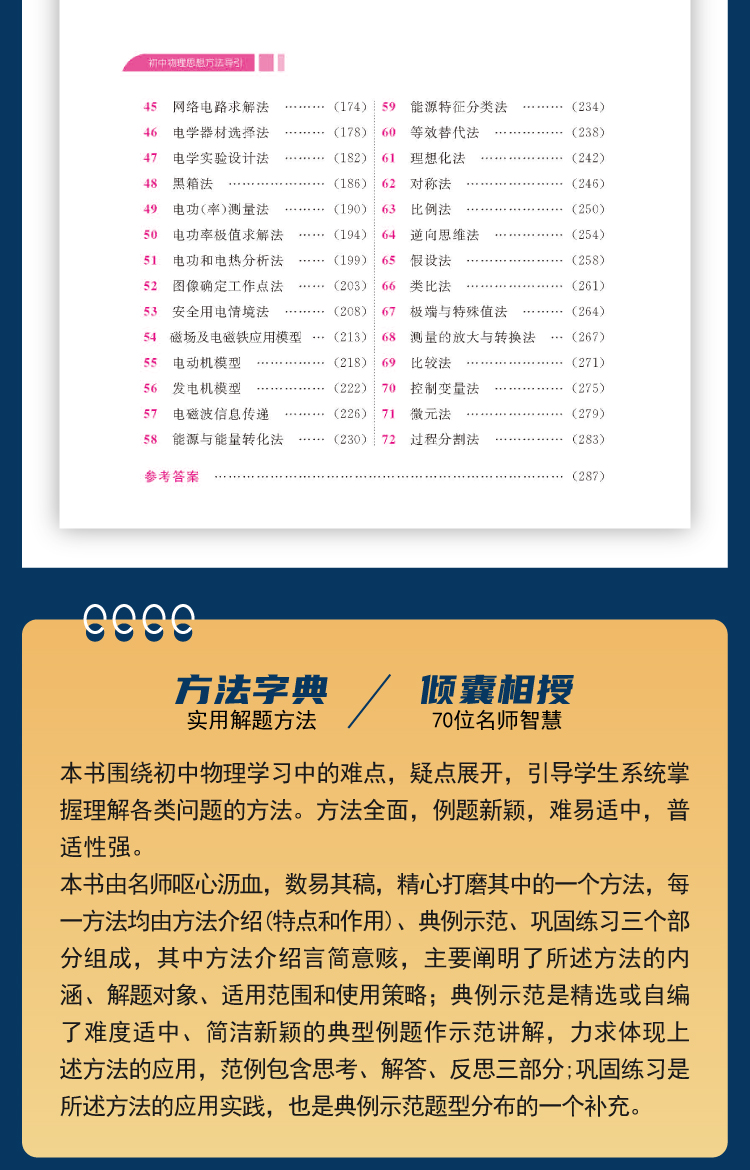 本书围绕初中物理学习中的难点,疑点展开,引导学生系统掌握理解各类问题的方法。方法全面,例题新颖,难易适中,普适性强。本书由名师呕心沥血,数易其稿,精心打磨其中的一个方法,每一方法均由方法介绍 (特点和作用)、典例示范、巩固练习三个部分组成,其中方法介绍言简意赅,主要阐明了所述方法的内涵、解题对象、适用范围和使用策略;典例示范是精选或自编了难度适中、简洁新颖的典型例题作示范讲解,力求体现上述方法的应用,范例包含思考、解答、反思三部分;巩固练习是所述方法的应用实践,也是典例示范题型分布的一个补充.