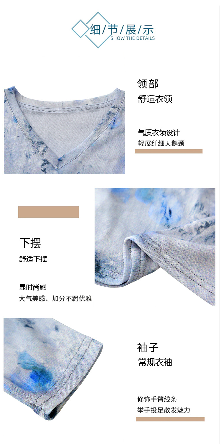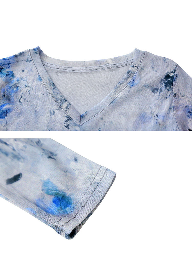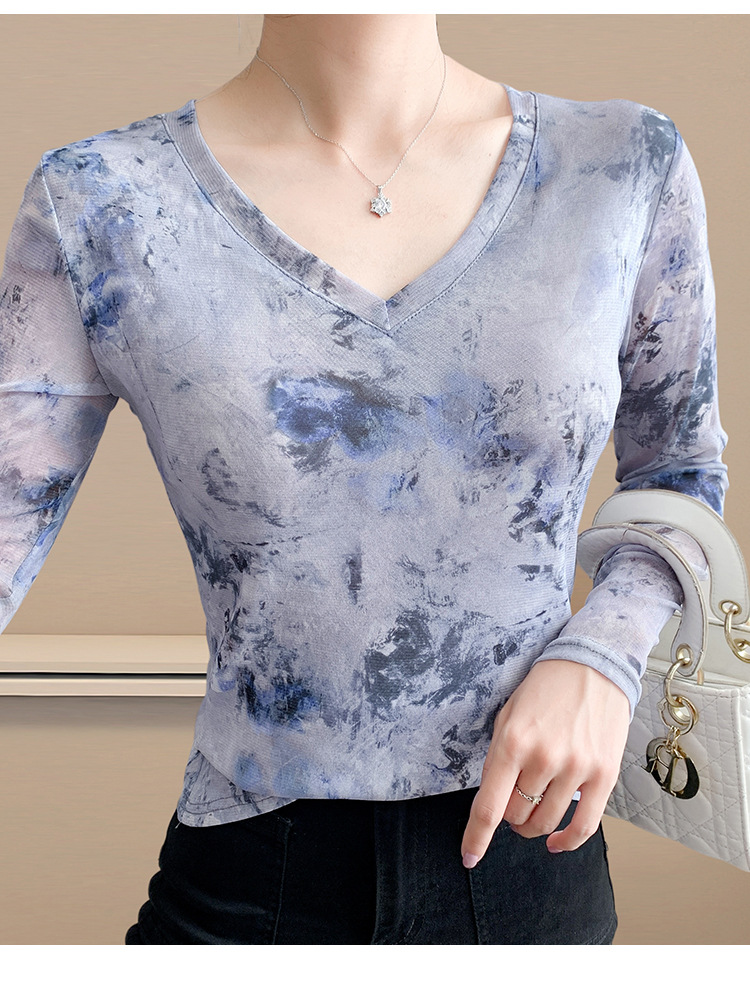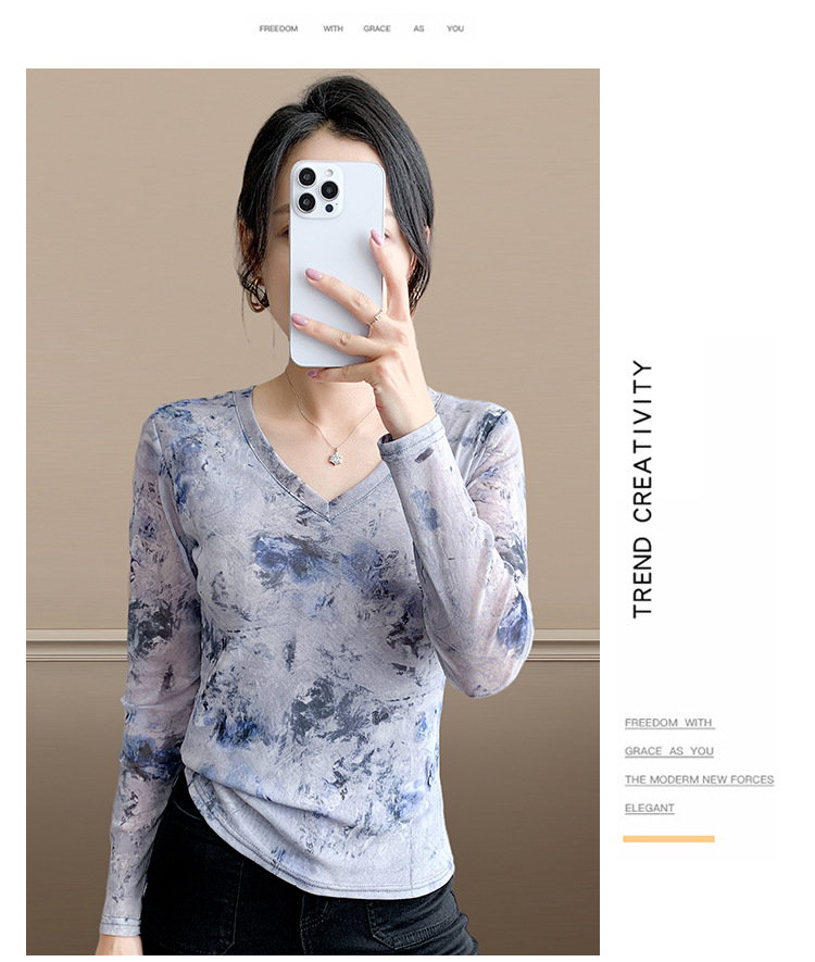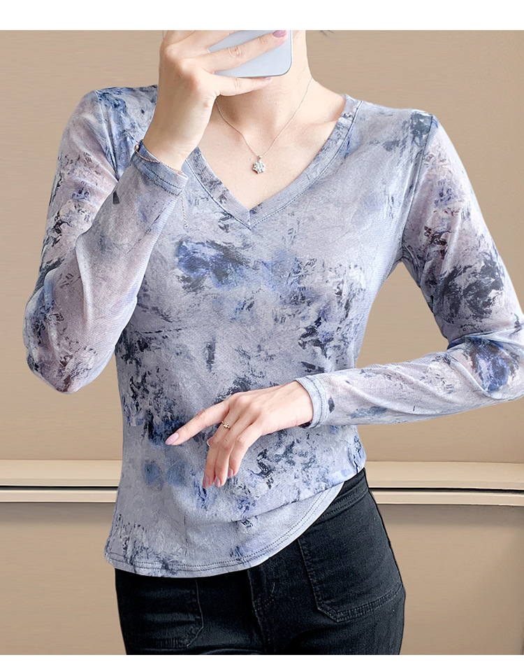 KQL A55F8590时尚洋气高弹网长袖印花V领T恤