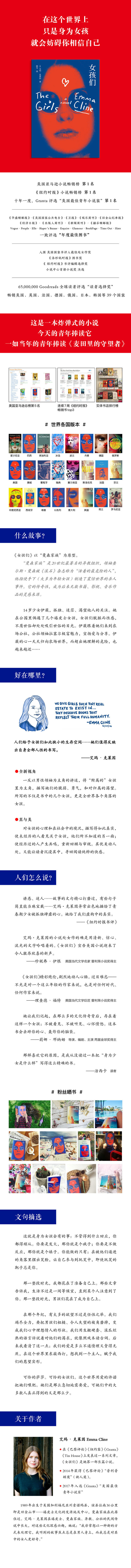 “这样的处女小说确实是罕见的……它*值得注目的,是克莱因用她独有的语言道出了青春期的焦虑,这文字充满诗情画意,又无损于青少年意识的真实性。成年人的忧郁反思和女孩膨胀的冲动完美编织在一起……“曼森家族”谋杀案耸人听闻、恶名昭彰,对于这样一个故事,《女孩们》表现出了卓越的克制。克莱因以两倍于自己年龄的成熟,写了一部绝不炫耀的明智的小说:安静而沸腾的自白,交织着渴望与恐怖。“ ——《华盛顿邮报》